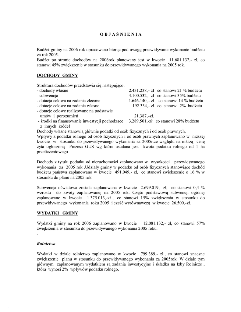 OBJAŚNIENIA Budżet gminy na 2006 rok opracowano biorąc pod uwagę przewidywane wykonanie budżetu za rok 2005. Budżet po stronie dochodów na 2006rok planowany jest w kwocie 11.681.132,- zł, co stanowi 45% zwiększenie w stosunku do przewidywanego wykonania na 2005 rok. DOCHODY GMINY Struktura dochodów przedstawia się następująco: - dochody własne 2.431.238,- zł co stanowi 21 % budżetu - subwencja 4.100.532, - zł co stanowi 35% budżetu - dotacja celowa na zadania zlecone 1.646.140, - zł co stanowi 14 % budżetu - dotacje celowe na zadania własne 192.334,- zł. co stanowi 2% budżetu - dotacje celowe realizowane na podstawie umów i porozumień 21.387, -zł. - środki na finansowanie inwestycji pochodzące 3.289.501,-zł. co stanowi 28% budżetu z innych żródeł Dochody własne stanowią głównie podatki od osób fizycznych i od osób prawnych. Wpływy z podatku rolnego od osób fizycznych i od osób prawnych zaplanowano w niższej kwocie w stosunku do przewidywanego wykonania za 2005r.ze względu na niższą cenę żyta ogłoszoną Prezesa GUS wg które ustalana jest kwota podatku rolnego od 1 ha przeliczeniowego. Dochody z tytułu podatku od nieruchomości zaplanowano w wysokości przewidywanego wykonania za 2005 rok .Udziały gminy w podatku od osób fizycznych stanowiące dochód budżetu państwa zaplanowano w kwocie 491.049,- zł, co stanowi zwiększenie o 16 % w stosunku do planu na 2005 rok. Subwencja oświatowa została zaplanowana w kwocie 2.699.019,- zł, co stanowi 0,4 % wzrostu do kwoty zaplanowanej na 2005 rok. Część podstawową subwencji ogólnej zaplanowano w kwocie 1.375.013,-zł , co stanowi 15% zwiększenia w stosunku do przewidywanego wykonania roku 2005 i część wyrównawczą w kwocie 26.500,-zł. WYDATKI GMINY Wydatki gminy na rok 2006 zaplanowano w kwocie 12.081.132,- zł, co stanowi 57% zwiększenia w stosunku do przewidywanego wykonania 2005 roku. . Rolnictwo Wydatki w dziale rolnictwo zaplanowano w kwocie 799.389,- zł., co stanowi znaczne zwiększenie planu w stosunku do przewidywanego wykonania za 2005rok. W dziale tym głównym zaplanowanym wydatkiem są zadania inwestycyjne i składka na Izby Rolnicze , która wynosi 2% wpływów podatku rolnego. 2 Transport Wydatki w tym dziale zaplanowano w kwocie 353.887,- zł, co stanowi 2 % zwiększenia wydatków w stosunku do przewidywanego wykonania za 2005 rok. Wydatki w tym dziale stanowią koszty utrzymania grupy transportowo-drogowej , koszty napraw dróg gminnych i powiatowych. Gospodarka mieszkaniowa Środki na gospodarkę mieszkaniową zaplanowano w kwocie 481.894,- zł. Są to środki na wycenę działek i nieruchomości przeznaczonych do sprzedaży, koszty ogłoszeń , przetargów i opłat energii elektrycznej w kotłowni na osiedlu S.M. „Jedność”, która jest refundowana z opłat za CO w szkole. Wydatki na zadania inwestycyjne zaplanowano w kwocie 363.894,- w tym środki własne 73.144 i środki UE w kwocie 290.750,-zł. Administracja publiczna Wydatki na administrację zaplanowano w kwocie 1.096.150,- zł i jest to 2,6% zwiększenia planu do przewidywanego wykonania za 2005 rok. Wydatki te obejmują między innymi zadania realizowane w ramach zadań zleconych administracji rządowej w kwocie 72.740,zł, które wzrastają o 4% w stosunku do roku 2005 Koszty administracji Urzędu Gminy zaplanowano w kwocie 970.700,- zł i jest to 3% wzrostu w stosunku do przewidywanego wykonania za 2005 rok. Wynagrodzenia osobowe i pochodne od wynagrodzeń, w których ujęte zostały również koszty osobowe koordynatora komisji rozwiązywania problemów alkoholowych wzrastają średnio od 1,5%. Pozostałe wydatki w tym dziale wzrastają o stopień inflacji. Oświata i wychowanie Wydatki na oświatę zaplanowano w kwocie 3.467.760,- zł, które zaplanowano na poziomie przewidywanego wykonania z 2005rok. Są to głównie wynagrodzenia nauczycieli i pracowników obsługi które wzrastają o 1,5% oraz wydatki bieżące związane z funkcjonowaniem oświaty, które średnio wzrastają o stopień inflacji. Wydatki w gimnazjum zaplanowano w kwocie 843.700,- zł, które zwiększają stosunku do przewidywanego wykonania za 2005 rok o 1.9% . się w Wydatki w dziale przedszkola zwiększają się o 1,5% w stosunku do przewidywanego wykonania za 2005 rok. Są to wydatki przedszkola na wynagrodzenia i pochodne od wynagrodzeń nauczycieli i obsługi przedszkola , które wzrastają o 1,5% jak również koszty utrzymania przedszkola i drobnych remontów. Ochrona zdrowia Wydatki w dziale ochrona zdrowia zaplanowano w kwocie 120.750,- zł . Wydatki te związane są z działalnością komisji rozwiązywania problemów alkoholowych w kwocie 36.600,- co stanowi 1,5% wzrostu w stosunku do przewidywanego wykonania za 2005r. i kosztami utrzymania ośrodka zdrowia w kwocie 84.150,-zł. W rozdziale 85121 – ośrodek zdrowia zaplanowano wydatki na zadania inwestycyjne – remont schodów z przystosowaniem dla osób niepełnosprawnych w kwocie 67.000,-zł. 3 Opieka społeczna Wydatki na opiekę społeczną zaplanowano w kwocie 1.960.490,- zł , co stanowi o 17% zwiększenia w stosunku do wykonania za 2005 rok. Z zakresu zadań zleconych zaplanowano kwotę 1.580.100 zł, co stanowi 31% zwiększenia w stosunku do przewidywanego wykonania za 2005r. Tak duży procent wzrostu środków wynika ze zwiększeniem zadań z zakresu ustawy na świadczenia rodzinne. Na zadania własne zaplanowane środki wynoszą 380.390,- zł co stanowi zmniejszenie wydatków stosunku do przewidywanego wykonania za 2005 rok . Zmniejszenie wydatków spowodowane jest mniejszymi dotacjami na dożywianie i zasiłki , które sukcesywnie sa zwiększane w ciągu roku. Edukacyjna opieka wychowawcza Wydatki w tym dziale zaplanowano w kwocie 612.719,- zł. Jest znaczny wzrost wydatków w stosunku przewidywanego wykonania za 2005 rok. Są to wydatki na inwestycję parku edukacyjno-rekreacyjnego w kwocie 443.385,-zł.oraz na wynagrodzenia i pochodne od wynagrodzeń