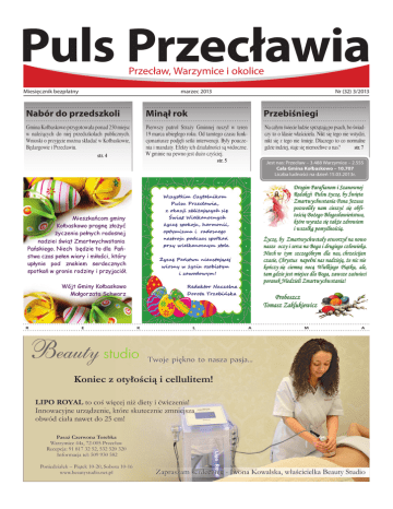 Puls Przecławia Przecław, Warzymice i okolice Miesięcznik bezpłatny marzec 2013 Nr (32) 3/2013 Nabór do przedszkoli Minął rok Przebiśniegi Gmina Kołbaskowo przygotowała ponad 250 miejsc w należących do niej przedszkolach publicznych. Wnioski o przyjęcie można składać w Kołbaskowie, Będargowie i Przecławiu. Pierwszy patrol Straży Gminnej ruszył w teren 19 marca ubiegłego roku. Od tamtego czasu funkcjonariusze podjęli setki interwencji. Były pouczenia i mandaty. Efekty ich działalności są widoczne. W gminie na pewno jest dużo czyściej. str. 5 Na całym świecie ludzie sprzątają po psach, bo świadczy to o klasie właściciela. Nikt się tego nie wstydzi, nikt się z tego nie śmieje. Dlaczego to co normalne gdzie indziej, staje się niemożliwe u nas? str. 7 str. 4 R E K L Jest nas: Przecław – 3.488 Warzymice – 2.555 Cała Gmina Kołbaskowo – 10.707 Liczba ludności na dzień 15.03.2013r. A M A Nr (32) 3/2013 marzec 2013 strona 3 Wielki Tydzień w Przecławiu Wielkanoc jest świętem ruchomym. Może wypadać pomiędzy 22 marca a 25 kwietnia. W tym roku świętować ją będziemy stosunkowo wcześnie, bo już 31 marca. WIELKANOC to najstarsze i najważniejsze święto chrześcijan. Upamiętnia ono śmierć na krzyżu i zmartwychwstanie Jezusa Chrystusa. Tydzień poprzedzający wielkanocną niedzielę to czas wspominania najważniejszych dla wiary chrześcijańskiej wydarzeń. Wielki Tydzień otwiera Niedziela Palmowa. Nazwa tego dnia pochodzi od wprowadzonego w XI w. zwyczaju święcenia palm - liturgia bowiem wspomina uroczysty wjazd Jezusa do Jerozolimy, bezpośrednio poprzedzający Jego Mękę i Śmierć na Krzyżu. Poniedziałek, wtorek i środa Wielkiego Tygodnia to dni poświęcone sakramentowi pojednania. Nie wyróżniają się niczym, jeśli chodzi o liturgię. Niegdyś w Wielką Środę kapłani w kościołach odprawiali „Jutrznię”. Dzisiaj ten zwyczaj można jeszcze spotkać już tylko w niektórych kościołach. W czwartek rozpoczyna się Święte Triduum Paschalne Męki i Zmartwychwstania Pańskiego. Obejmuje ono liturgię Mszy Wieczerzy Pańskiej, sprawowaną wieczorem w Wielki Czwartek, wielkopiątkową liturgię Męki Pańskiej oraz najbardziej uroczystą i najpiękniejszą ze wszystkich liturgii Kościoła – Wigilię Paschalną sprawowaną po zapadnięciu zmroku w Wielką Sobotę. Triduum kończy się wieczorem w Niedzielę Zmartwychwstania. Wielki Tydzień w kościele w Przecławiu 24.03.2013 – NIEDZIELA PALMOWA MĘKI PAŃSKIEJ, WIELKI PONIEDZIAŁEK, WIELKI WTOREK, WIELKA ŚRODA Msze św. o godz. 18.00 Spowiedź: od godz. 17.30 28.03.2013 – WIELKI CZWARTEK Święconka W Wielką Sobotę większość mieszkańców naszej gminy wybierze się do najbliższego kościoła, by poświęcić koszyczek z pokarmem. Warto pamiętać, że dobór potraw, które do niego włożymy, nie powinien być przypadkowy. Każdy z darów łączy w sobie zarówno chrześcijańską jak i ludową tradycję. Przyjęło się, że ma ich być siedem. W koszyczku znaleźć się powinny: Jajka – symbol życia i odrodzenia Baranek – Symbol Jezusa Chrystusa Chleb – symbolizujący Ciało Chrystusa, oznaka dostatku Chrzan i masło – które są symbolem goryczy i słodyczy po śmierci i zmartwychwstaniu. Sól - symbol dostatku i gościnności Wędliny – symbolizujące kończący się Wielki Post Symbole Wielkanocne Palemki Palemki – rózgi wierzbowe, gałązki bukszpanu, malin, porzeczek – ozdabiano kwiatkami, mchem, ziołami, kolorowymi piórkami. Po poświeceniu palemki biło się nią lekko domowników, by zapewnić im szczęście na cały rok. Połkniecie jednej poświęconej bazi wróżyło zdrowie i bogactwo. Zatknięte za obraz lub włożone do wazonów palemki chroniły mieszkanie przed nieszczęściem i złośliwością sąsiadów. Jaja „Ponadprogramowo” koszyczek możemy dopełnić rzeżuchą, serem i ciastem, zajączkiem, kurczaczkiem, gałązkami wierzby. Całość obowiązkowo przykrywać powinna nieskazitelnie biała – haftowana lub zrobiona na szydełku – serwetka. Wielkanocne zwyczaje i tradycje Świąteczne porządki Przed Wielkanocą robimy świąteczne porządki. To wielkie sprzątanie ma też symboliczne znaczenie – z mieszkania wymiatamy zimę, a wraz z nią wszelkie zło i choroby. Topienie Judasza W Wielką Środę młodzi chłopcy robili ze słomy kukłę Judasza, którą najpierw okładali kijami a potem wrzucali do stawu. W ten sposób wymierzano „Zdrajcy” sprawiedliwość. Wielkie grzechotanie Kiedy milkły kościelne dzwony, rozlegał się dźwięk kołatek. Obyczaj ten był okazja do urządzania psot. Młodzież biegała po mieście z grzechotkami, hałasując i strasząc przechodniów. Do dziś zachował się zwyczaj obdarowywania dzieci w Wielkim Tygodniu grzechotkami. MSZA WIECZERZY PAŃSKIEJ o godz. 19.00 Spowiedź od godz. 17.00. Adoracja Pana Jezusa w Ciemnicy do godz. 22.00 29.03.2013 – WIELKI PIĄTEK Adoracja Pana Jezusa w Ciemnicy: od godz. 8.00 LITURGIA MĘKI PAŃSKIEJ o godz. 19.00 Droga Krzyżowa bezpośrednio po Liturgii Spowiedź : od godz. 16.00 do godz. 19.00. W tym dniu obowiązuje post ścisły; spożywamy trzy posiłki bezmięsne, w tym jeden do syta. Nie spożywamy alkoholu! 30.03.2013 – WIELKA SOBOTA Adoracja Pana Jezusa w Grobie od godz. 8.00 do 23.00 Poświęcenie pokarmów od godz. 9.00 do 18.00 co godzinę Spowiedź od godz. 9.00 do 18.00 LITURGIA WIGILII PASCHALNEJ połączona z procesją Rezurekcyjną o godz. 23.00 31.03.2013 – NIEDZIELA ZMARTWYCHWSTANIA PAŃSKIEGO. Pozostałe Msze św. w porządku niedzielnym 1.04.2013 – PONIEDZIAŁEK WIELKANOCNY Msze św. – tak jak w niedzielę Pogrzeb żuru Ostatnie dni postu były przygotowaniem do święta. Robiono wtedy „pogrzeb żuru” – wylewano na ziemię sagany znienawidzonej, bo spożywanej przez cały post, potrawy. Wieszanie śledzia Bez litości rozstawano się też ze śledziem – kolejnym symbolem wielkiego postu. N