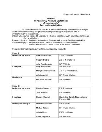 Pruszcz Gdański 24.04.2014 Protokół IV Powiatowy Konkurs Czytelniczy „Z książką na ty” Test znajomości lektur W dniu 9 kwietnia 2014 roku w siedzibie Gminnej Biblioteki Publicznej w Trąbkach Wielkich odbył się pisemny test sprawdzający znajomość lektur wymienionych w regulaminie. Udział w konkursie wzięło 58 uczniów z 14 szkół podstawowych powiatu gdańskiego. Jury w składzie : Przewodnicząca - Anna Chmielewska – Biblioteka Gminna w Trąbkach Wielkich Członkowie jury : Alicja Birukowicz - PBW – Filia w Pruszczu Gdańskim Joanna Kowalczyk – PBW – Filia w Pruszczu Gdańskim Po sprawdzeniu 58 prac, jury ustaliło następujący werdykt : Klasy II I miejsce ex equo Weronika Bober ZKiW Lublewo Cezary Budka ZS nr 4 (mała”4”) Julia Drążkowska Wojciech Goike SP Wiślinka SP Pszczółki Martyna Gryczyńska ZS nr 2 Pruszcz Gd. Jakub Jasiak SP Trąbki Wielkie Mateusz Sadoch SP Kłodawa Natalia Salamon ZS Rotmanka Julia Miernik SP Kłodawa II miejsce Hubert Matejuk Katolickie Szkoły Niepubliczne Pruszcz Gd. III miejsce ex equo Oliwia Gadomska SP Wiślinka Michał Jasiak SP Trąbki Wielkie Jakub Liban ZKiW Lublewo Anna Mogiełka SP Pszczółki II miejsce III miejsce Klasy IIII I miejsce ex equo Kl. IV I miejsce Karol Symonowicz ZS nr 4 Pruszcz Gd. II miejsce Alicja Templer SP Wiślinka Julia Marcinkiewicz SP Trąbki Wielkie Kl. V I miejsce Kacper Kąkol SP Kłodawa II miejsce Aleksandra Tułowiecka ZS Rotmanka III miejsce Martyna Szmit ZS nr 4 Pruszcz Gd. Kl. VI I miejsce Kacper Karnath SP Sobowidz II miejsce Paweł Grzelak ZS Rotmanka III miejsce Julia Dziemińska SP Trąbki Wielkie III miejsce Serdecznie dziękujemy wszystkim uczniom za przygotowanie się do testu sprawdzającego. Dziękujemy również nauczycielom i opiekunom dzieci za ich przygotowanie do konkursu. Laureatów miejsc I – III z poszczególnych klas zapraszamy na uroczyste wręczenie nagród do Szkoły Podstawowej im. M. Kownackiej w Kłodawie w dniu 17 czerwca o godz. 11.00. Jury Konkursu : 1. Anna Chmielewska ………………………….. 2. Alicja Birukowicz …………………………… 3. Joanna Kowalczyk ……………………………