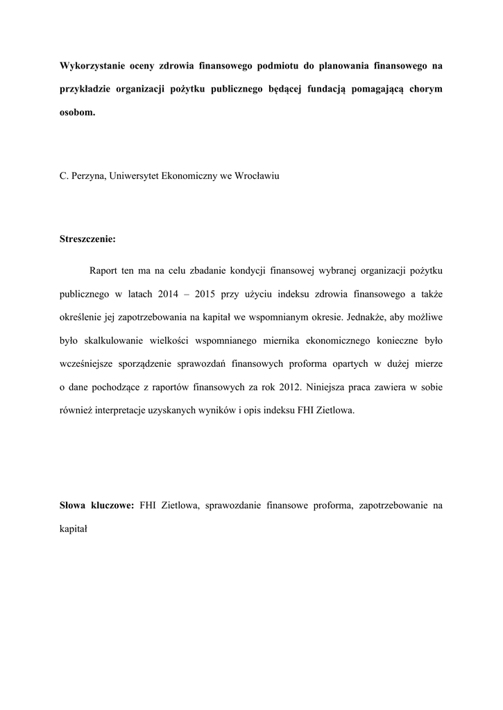 Wykorzystanie oceny zdrowia finansowego podmiotu do planowania finansowego na przykładzie organizacji pożytku publicznego będącej fundacją pomagającą chorym osobom. C. Perzyna, Uniwersytet Ekonomiczny we Wrocławiu Streszczenie: Raport ten ma na celu zbadanie kondycji finansowej wybranej organizacji pożytku publicznego w latach 2014 – 2015 przy użyciu indeksu zdrowia finansowego a także określenie jej zapotrzebowania na kapitał we wspomnianym okresie. Jednakże, aby możliwe było skalkulowanie wielkości wspomnianego miernika ekonomicznego konieczne było wcześniejsze sporządzenie sprawozdań finansowych proforma opartych w dużej mierze o dane pochodzące z raportów finansowych za rok 2012. Niniejsza praca zawiera w sobie również interpretacje uzyskanych wyników i opis indeksu FHI Zietlowa. Słowa kluczowe: FHI Zietlowa, sprawozdanie finansowe proforma, zapotrzebowanie na kapitał Use the financial health of an organization in financial planning non-profit organization which helps the sick people. Summary: This report aims to examine the financial condition of the selected charitable organizations in the years 2014 - 2015 using the index of financial health and to determine its capital requirements during the period. However, it is possible to calculating the size of the meter said it was necessary to advance the economic preparation of the pro forma financial statements are based largely on data from the financial reports for the year 2012. This work also includes the interpretation of the results and a description of the index FHI Zietlowa. Key words: FHI Zietlowa, pro forma financial statements, the demand for capital JEL : D92, L29, L31, M21 Recenzent 1: M. Grad Recenzent 2: P. Pasterny Wstęp W realiach dwudziestego pierwszego wieku analiza finansowa cieszy się coraz to większą popularnością w sferze ekonomicznej. Dzieje się tak za sprawą wzrostu świadomości biznesowej właścicieli a także osób zarządzających jednostkami gospodarczymi. Zdają sobie oni sprawę z faktu, iż przedsiębiorstwa nie badające swej kondycji finansowej nie są w stanie efektywnie funkcjonować, rozwijać się a nawet planować przyszłości. Istnieje wiele metod przeprowadzania wspomnianego badania stanu finansowego firm, jednakże jedną z najpopularniejszych jest stosowanie indeksu zdrowia finansowego zwanego FHI Zietlowa lub PFI Zietlowa. Z racji tego, iż został on stworzony z myślą o organizacjach pożytku publicznego do niniejszy raportu została wybrana właśnie organizacja non profit, jednakże mająca charakter fundacji pomagającej chory osobom1. Aby możliwe było skalkulowanie wartości indeksu zdrowia finansowego, a także ocena kondycji finansowej i oszacowanie zapotrzebowanie na kapitał wybranej jednostki gospodarczej niezbędne było stworzenie sprawozdań finansowych proforma2 dla lat 2014-2015. Wspomniane raporty finansowe opierały się na danych pozyskanych z roku 20123 a także założeniu, iż przychody omawianego podmiotu będą rok rocznie wzrastać. Założenie to wynika z ciągłego wzrostu ilości środków pieniężnych przekazywanych (w ramach akcji jednego procentu podatku dochodowego4) instytucjom pożytku publicznego5. Dodatkowo 1 http://www.mpips.gov.pl/bip/wykaz-organizacji-pozytku-publicznego/#akapit1 Pluta Wiesław, Planowanie finansowe w przedsiębiorstwie, strona 143 3 http://pozytek.gov.pl/BAZA,OPP,3403.html 4 http://www.jedenprocentpodatku.pl/index.php?p=statystyki&a=1proc_2011 5 http://www.jedenprocentpodatku.pl/index.php?p=statystyki&a=1proc_2012 2 motywować je można prognozowanym dla Polski poziomem wzrostu gospodarczego6 i pozytywnym nastawieniem obywateli do wszelkich form pomocy osobom potrzebującym. Indeks zdrowia finansowego jest determinowany przez cztery kategorie i przypisane im wagi, co wyraża poniższy wzór: Równanie 1Wzór na wskaźnik PHI Zietlowa ϕ= (0,10 x kategorie ogólne) + (0,40 x kategorie natychmiastowe) + (0,30 x kategorie krótkoterminowe) + (0,20 x kategorie średnioterminowe) źródło: Zietlow J., A Financial Health Index for Achieving Nonprofit Financial Sustainability gdzie: ϕ oznacza wartość indeksu zdrowia finansowego. Warto podkreślić jednak, że na kategorie ogólne, natychmiastowe, krótkoterminowe i średnioterminowe składa się piętnaście wskaźników a są nimi : logarytm naturalny wieku, logarytm naturalny rozmiaru, wskaźnik niestabilności aktywów, wskaźnik dostatecznej rezerwy gotówkowej, zmodyfikowany wskaźnik gotówki, docelowa płynność Lambda, skorygowany wskaźnik płynności, wskaźnik przepływów pieniężnych, wskaźnik aktywów, administracyjny współczynnik wydatków, zmiana aktywów netto, wskaźnik wniesionego wkładu, współczynnik samofinansowania, wskaźnik zadłużenia, a także wskaźnik kosztów pozyskania funduszy. Pierwsza kategoria nazywana ogólną powstaje przy pomocy logarytmu naturalnego wieku, logarytmu naturalnego rozmiaru i wskaźnika niestabilności aktywów. Logarytm naturalny wieku (jak sama jego nazwa wskazuje) odnosi się do okresu istnienia badanego podmiotu gospodarczego, pożądane są jego wyższe wartości co motywować można tym, iż im starszy 6 http://wyborcza.biz/biznes/1,101562,14896558,Bruksela_prognozuje_w_Polsce_wzrost_PKB_o_2_3_proc_.ht ml jest analizowany obiekt tym jest on lepiej znany zarówno klientom jak i kontrahentom, a ponad to odznacza się większym doświadczeniem i większą konkurencyjnością. Z kolei logarytm naturalny rozmiaru dostarcza informacji o stabilności i elastyczności jednostki a wskaźnik niestabilności aktywów o wielkości rozproszenia wartości aktywów wokół trendu. Wartości wskaźników należących do pierwszej kategorii obliczone dla wybranej organizacji pożytku publicznego przedstawia poniższa tabela: Tabela 1 Wartości wskaźników kategorii ogólnej Wskaźnik Rok 2014 Rok 2015 Logarytm naturalny wieku 2,08 2,20 Logarytm naturalny 11,97 12,04 niestabilności 98,31 50,94 ro