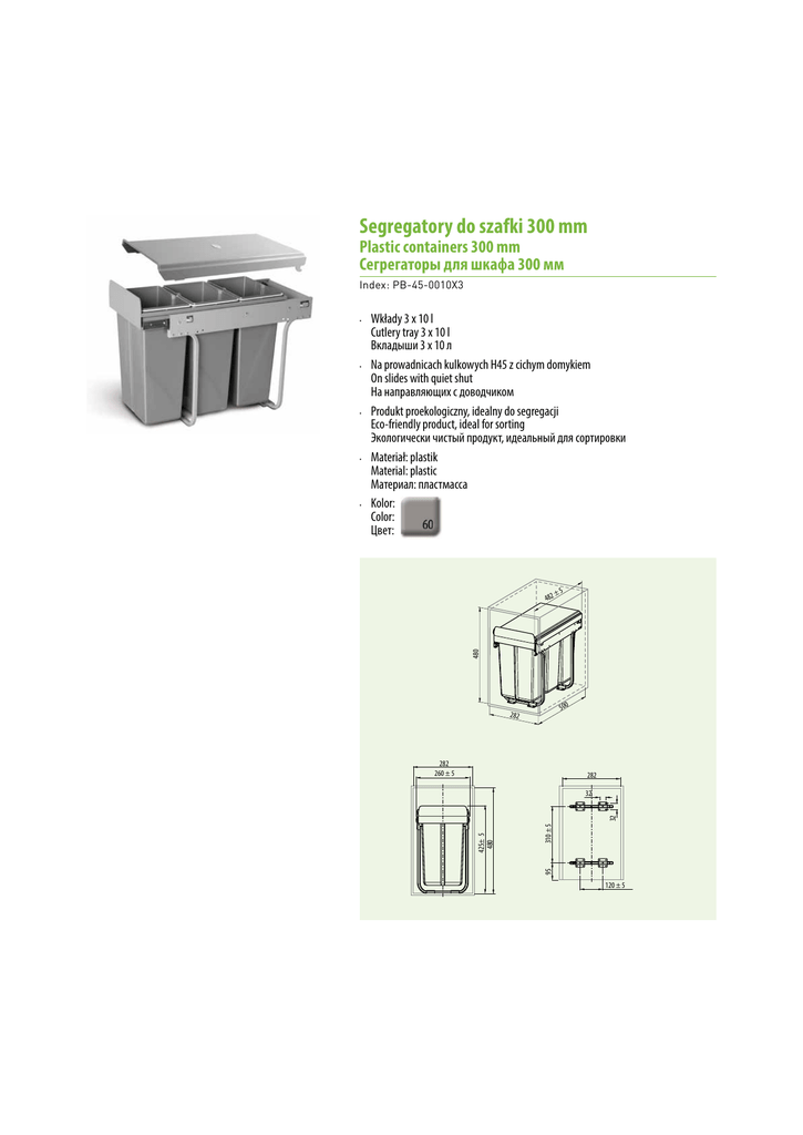 Segregatory do szafki 300 mm Plastic containers 300 mm Сегрегаторы для шкафа 300 мм Index: PB-45-0010X3 Wkłady 3 x 10 l Cutlery tray 3 x 10 l Вкладыши 3 x 10 л • Na prowadnicach kulkowych H45 z cichym domykiem On slides with quiet shut На направляющих с доводчиком • Produkt proekologiczny, idealny do segregacji Eco-friendly product, ideal for sorting Экологически чистый продукт, идеальный для сортировки • Materiał: plastik Material: plastic Материал: пластмасса • Kolor: Color: Цвет: • ±5 480 482 500 282 282 260 ± 5 282 310 ± 5 95 425± 5 480 32 32 120 ± 5