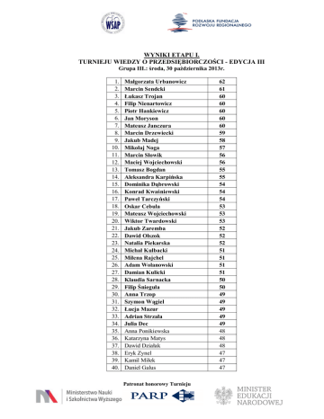 WYNIKI ETAPU I. TURNIEJU WIEDZY O PRZEDSIĘBIORCZOŚCI - EDYCJA III Grupa III.: środa, 30 października 2013r. 1. 2. 3. 4. 5. 6. 7. 8. 9. 10. 11. 12. 13. 14. 15. 16. 17. 18. 19. 20. 21. 22. 23. 24. 25. 26. 27. 28. 29. 30. 31. 32. 33. 34. 35. 36. 37. 38. 39. 40. Małgorzata Urbanowicz Marcin Sendcki Łukasz Trojan Filip Nienartowicz Piotr Hankiewicz Jan Moryson Mateusz Janczura Marcin Drzewiecki Jakub Madej Mikołaj Noga Marcin Słowik Maciej Wojciechowski Tomasz Bogdan Aleksandra Karpińska Dominika Dąbrowski Konrad Kwaśniewski Paweł Tarczyński Oskar Cebula Mateusz Wojciechowski Wiktor Twardowski Jakub Zaremba Dawid Olszok Natalia Piekarska Michał Kulbacki Milena Rajchel Adam Wolanowski Damian Kulicki Klaudia Sarnacka Filip Śnieguła Anna Trzop Szymon Wągiel Łucja Mazur Adrian Strzała Julia Dec Anna Ponikiewska Katarzyna Matys Dawid Działak Eryk Zynel Kamil Miłek Daniel Galus Patronat honorowy Turnieju 62 61 60 60 60 60 60 59 58 57 56 56 55 55 54 54 54 53 53 53 52 52 52 51 51 51 51 50 50 49 49 49 49 49 48 48 48 47 47 47 41. 42. 43. 44. 45. 46. 47. 48. 49. 50. 51. 52. 53. 54. 55. 56. 57. 58. 59. 60. 61. 62. 63. 64. 65. 66. 67. 68. 69. 70. 71. 72. 73. 74. 75. 76. 77. 78. 79. 80. 81. 82. 83. 84. 85. Iga Rzepka Ewelina Ziółkowska Weronika Biskupska Mateusz Mglej Grzegorz Perkowski Joanna Ziemkiewicz Monika Perczyńska Mateusz Maksymiuk Aleksandra Janiszewska Adrian Bestydziński Karolina Słowińska Marcin Wojdalski Natanael Kopański Tomasz Nowak Wiktoria Cebula Adrianna Czech Kamil Hrebeniuk Maciej Gilski Adam Krawczyk Maciej Sewastianik Gabriela Makoś Mateusz Lurka Szymon Bojęś Anna Maślankowska Krzysztof Tomczak Małgorzata Bejma Alicja Bakierska Sylwia Jasińska Beata Zdrojewska Natalia Karbownik Krzysztof Sznura Natalia Woźniak Miłosz Sabady Adrian Puczyński Michał Hofmann Martyna Wójcik Sandra Zdzuj Daniel Polak Aleksandra Zuziak Przemysław Lubak Maciej Krzywda Agnieszka Janiak Joanna Wróblewska Urszula Ziemiacka Aneta Kramarewicz Patronat honorowy Turnieju 47 47 47 46 46 46 46 46 46 46 46 46 45 45 45 45 45 45 45 44 44 44 44 44 44 44 44 44 44 44 44 44 43 43 43 43 43 43 43 43 43 43 43 43 43 86. 87. 88. 89. 90. 91. 92. 93. 94. 95. 96. 97. 98. 99. 100. 101. 102. 103. 104. 105. 106. 107. 108. 109. 110. 111. 112. 113. 114. 115. 116. 117. 118. 119. 120. 121. 122. 123. 124. 125. 126. 127. 128. 129. 130. Oskar Cichocki Pamela Zawisko Klaudia Tubaja Krzysztof Kowalczyk Wojciech Słowikowski Mateusz Stuczyk Krzysztof Kozłowski Kamil Kolesiński Daniel Szewczyk Magdalena Małż Łukasz Szczepańczyk Monika Seremet Paweł Augustyn Radek Suchecki Michalina Chmielewska Jakub Dąbrowski Monika Wiesion Katarzyna Zgórzak Dominika Szymichowska Karolina Jóskowska Patrycja Stefaniuk Łukasz Półtorak Jarosław Sochacki Karlina Zabielska Ewelina Wysocka Mateusz Piaseczny Ewa Rzymska Ewa Michalska Magdalena Gruszczyńska Katarzyna Świderska Aleksandra Wojewoda Kinga Ziemkiewicz Marcin Kiernozek Mirosław Bułat Antoni Megger Weronika Kuczyńska Iwona Świątek Przemysław Sumera Paweł Protasiuk Izabela Zabielska Marcin Perkowski Jakub Krzyśkowiak Adrian Jarmuż Wojciech Osiński Justyna Węgiel Patronat honorowy Turnieju 43 43 43 43 43 43 42 42 42 42 42 42 42 42 42 42 42 42 42 42 42 41 41 41 41 41 41 41 41 41 41 41 41 41 41 41 41 40 40 40 40 40 40 40 40 131. 132. 133. 134. 135. 136. 137. 138. 139. 140. 141. 142. 143. 144. 145. 146. 147. 148. 149. 150. 151. 152. 153. 154. 155. 156. 157. 158. 159. 160. 161. 162. 163. 164. 165. 166. 167. 168. 169. 170. 171. 172. 173. 174. 175. Mateusz Pszczołowski Dawid Matuszewski Mateusz Grabowski Mateusz Pieniążek Jagoda Marciniak Arkadiusz Kowalski Michał Trykoszko Patrycja Dołega Milena Szymoniak Monika Zielińska Zofia Zachura Aneta Danowska Franciszek Walkowiak Sandra Król Anna Kuśnierczak Anna Pajewska Olaf Jedliczka Klaudia Kapuścińska Patryk Wachowiak Weronika Dworakowska Magdalena Łagida Anna Sadowska Dominik Belman Jakub Jankowski Nadia Czuczko Natalia Sieniawska Ewelina Wyszyńska Emilia Piętka Adrianna Burdyka Magdalena Dec Agnieszka Golon Karolina Kobielska Karolina Bulwa Paweł Król Sandra Szymańska Przemysław Gryc Paulina Woźniak Brajan Kostecki Sylwester Pacholec Aleksander Kasztelan Michał Woźniak Barbara Depczyńska Oliwia Tysiąc Wojciech Mojsiejuk Joanna Stanaszek Patronat honorowy Turnieju 40 40 40 40 40 40 39 39 39 39 39 39 39 39 39 39 39 39 39 39 39 39 39 38 38 38 38 38 38 38 38 38 38 38 38 38 38 38 38 38 38 38 38 37 37 176. 177. 178. 179. 180. 181. 182. 183. 184. 185. 186. 187. 188. 189. 190. 191. 192. 193. 194. 195. 196. 197. 198. 199. 200. 201. 202. 203. 204. 205. 206. 207. 208. 209. 210. 211. 212. 213. 214. 215. 216. 217. 218. 219. 220. Joanna Just Aneta Krajewska Klaudia Koszykowska Błażej Koziński Marzena Grabowska Sebastian Papież Klaudia Bołka Maciej Murawski Marlena Orzech Marzena Marczewska Adrianna Polejańczyk Mirosław Wielbąd Anna Kłopotowska Mateusz Korsheinrich Patrycja Zwiernik Marek Waszczuk Klaudia Kwaśniewska Klaudia Bykowicz Przemysław Kowalski Izabela Gębska Alicja Bartoszek Natalia Drywa Katarzyna Czaja Krystian Nowik Angelika Mirocha Joanna Małachowska Emilia Sawicka Małgorzata Żebrowska Olga Walendziuk Aneta Karlin Patryk Kujaczyński Monika Gwizdek Agnieszka Konkiewicz Sławomir Szymański Partyk Samol Sebastian Stasiak Róża Luiza Karaczun Izabela Korol Marta Szuła Jakub Lisowski Radosław Frankowski Klaudia Szabat Arkadiusz Bielak Melania Berndt Kornelia Ośka Patronat honorowy Turnieju 37 37 37 37 37 37 37 37 37 37 37 37 37 37 37 37 37 37 37 37 37 37 37 36 36 36 36 36 36 36 36 36 36 36 36 36 35 35 35 35 35 35 35 35 35 221. 222. 223. 224. 225. 226. 227. 228. 229. 230. 231. 232. 233. 234. 235. 236. 237. 238. 239. 240. 241. 242. 243. 244. 245. 246. 247. 248. 249. 250. 251. 252. 253. 254. 255. 256. 257. 258. 259. 260. 261. 262. 263. 264. 265. Karolina Dyczewska Wojciech Aksamit Tomasz Zielińskie Bartek Walkiewicz Marlena Cirocka Urszula Kądzielawska Emilia Rejna