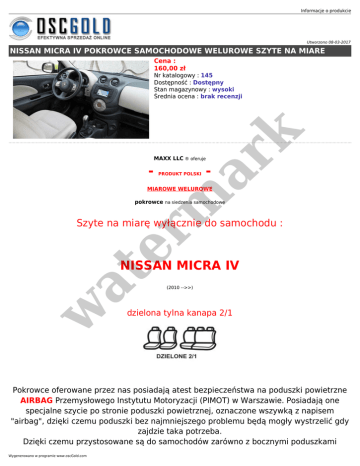 Informacje o produkcie Utworzono 08-03-2017 NISSAN MICRA IV POKROWCE SAMOCHODOWE WELUROWE SZYTE NA MIARE Cena : 160,00 zł er m ar k Nr katalogowy : 145 Dostępność : Dostępny Stan magazynowy : wysoki Średnia ocena : brak recenzji MAXX LLC ® oferuje - PRODUKT POLSKI - MIAROWE WELUROWE pokrowce na siedzenia samochodowe Szyte na miarę wyłącznie do samochodu : w at NISSAN MICRA IV (2010 -->>) dzielona tylna kanapa 2/1 Pokrowce oferowane przez nas posiadają atest bezpieczeństwa na poduszki powietrzne AIRBAG Przemysłowego Instytutu Motoryzacji (PIMOT) w Warszawie. Posiadają one specjalne szycie po stronie poduszki powietrznej, oznaczone wszywką z napisem "airbag", dzięki czemu poduszki bez najmniejszego problemu będą mogły wystrzelić gdy zajdzie taka potrzeba. Dzięki czemu przystosowane są do samochodów zarówno z bocznymi poduszkami Wygenerowano w programie www.oscGold.com w at er m ar k powietrznymi w fotelach, jak i do standardowych siedzeń. Pokrowce wykonane są z wysokiej jakości weluru Informacje o produkcie dodatkowo laminowanego pianką poliuretanową oraz podszewką co zapobiega wykruszaniu się gąbki i ułatwia zakładanie Boczki foteli, zagłówki oraz plecy wykonane są z grubej dzianiny poliestrowej koloru ciemno grafitowego, w całości laminowanej pianką, w at er m ar k w miejscach szczególnie podatnych na przetarcia dodatkowo wzmocnione podszewką. Wygenerowano w programie www.oscGold.com er m ar k at w Informacje o produkcie er m ar k Pokrowce są bardzo solidnie wykończone, otwory do regulacji foteli, lub pod zagłówki i pasy bezpieczeństwa są wycięte, obszyte i dopasowane pod każdy model indywidualnie. at Po dokładnym montażu naszych pokrowców uzyskujemy efekt praktycznie nie odróżniający się od orginalnej tapicerki co zresztą widać na powyższych zdjęciach. w W trzech wzorach: Wygenerowano w programie www.oscGold.com er m ar k at w w at er m ar k Informacje o produkcie Wygenerowano w programie www.oscGold.com er m ar k at w KOMPLET ZAWIERA PEŁNY ZESTAW PRZEZNACZONY DO DANEGO MODELU SAMOCHODU: - komplet pokrowców na przednie fotele - komplet pokrowców na tylną kanape / tylne fotele - pokrowce na zagłówki - pokrowce na inne, niestandardowe elementy - zależne od modelu samochodu, jak np. podłokietniki, kolumny/nadkola, itp. - haczyki oraz inne elementy montażowe - instrukcję montażu FOTELE PRZEDNIE - przystosowane do bocznych poduszek powietrznych, jednoczęściowe z łatą Informacje o produkcie w at er m ar k montażową wciąganą w szczelinę pomiędzy siedziskiem a oparciem; poniżej zagłówka wyhaftowany napis "ELEGANCE"; na "plecach" dostęp do kieszeni; przy fotelu kierowcy podłokietnik; 2 pokr. na zagłówki FOTELE TYLNE - oparcie z dwóch części dzielone niesymetrycznie 2/1, siedzisko również dzielone na każdy element osobny pokrowiec; na oparciu jak i na siedzisku po dwie wstawki z wzorem; 3 łamane zagłówki Wygenerowano w programie www.oscGold.com