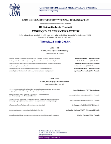 RADA SAMORZĄDU STUDENTÓW WYDZIAŁU TEOLOGICZNEGO zaprasza na ogólnopolska konferencję naukową III Dzień Studenta Teologii FIDES QUAERENS INTELLECTUM która odbędzie się w dniach 21 – 22 maja 2013 roku w siedzibie Wydziału Teologicznego UAM, Poznań, ul. Wieżowa 2/4, Aula A i A2, bud. A Wtorek, 21 maja 2013 r. Godz. 16:15 Wiara poszukująca aktualizacji panel studencki III – aula A Konflikt prawdy z ponowoczesnością, czyli Quid est veritas et veritatis splendor Jacek Zamarski (IT Bielsko – Biała) Świętego Pawła model relacji we wspólnocie Kościoła – nadal aktualny? Róża Jasionowska (KUL Lublin) Kościół lokalny miejscem zrozumienia wyzwań i problemów współczesnej rodziny Danuta Kędziorska (UWM Olsztyn) Rola teologii w ewangelizacji kl. Adam Pawlak (UKSW Warszawa) Ewangelizacja w serwisach społecznościowych Facebook i Twitter Mateusz Pietrzak (IT Bielsko – Biała) Interakcyjność duchowości i tańca na podstawie badań empirycznych mgr Anna Wieradzka (UAM Poznań) Godz. 16:15 Wiara poszukująca uzasadnienia panel studencki IV – aula A2 „(...) czy rzeczywiście chrześcijańskie odpowiedzi są tego rodzaju, że zamykają drogę myśleniu ?” J. Ratzinger. Relacja między wiarą a rozumem Odmienne wizje sacra doctrina i jej związek z filozofią według św. Bonawentury i św. Tomasza z Akwinu Miejsce rozumu w teologii Josepha Ratzingera. Od krytyki bonawenturiańskiej koncepcji „sprostytuowanego rozumu” do racjonalności otwartej na Boga Medytacja chrystologiczna jako centrum wiary i teologii Potrzeba dogmatu w perspektywie ideologii New Age Poszukiwanie piękna – poszukiwaniem Boga. Zachwyt jako sytuacja graniczna Anna Gładkowska (WIT Częstochowa) Andrzej Łukasz Jędrzejczak (UAM Poznań) kl. Przemysław Kaczkowski (UAM Poznań) kl. Grzegorz Ćwikliński (UWM Olsztyn) kl. Damian Stachera (UKSW Warszawa/IT Łódź) Monika Juszczak (UAM Poznań)