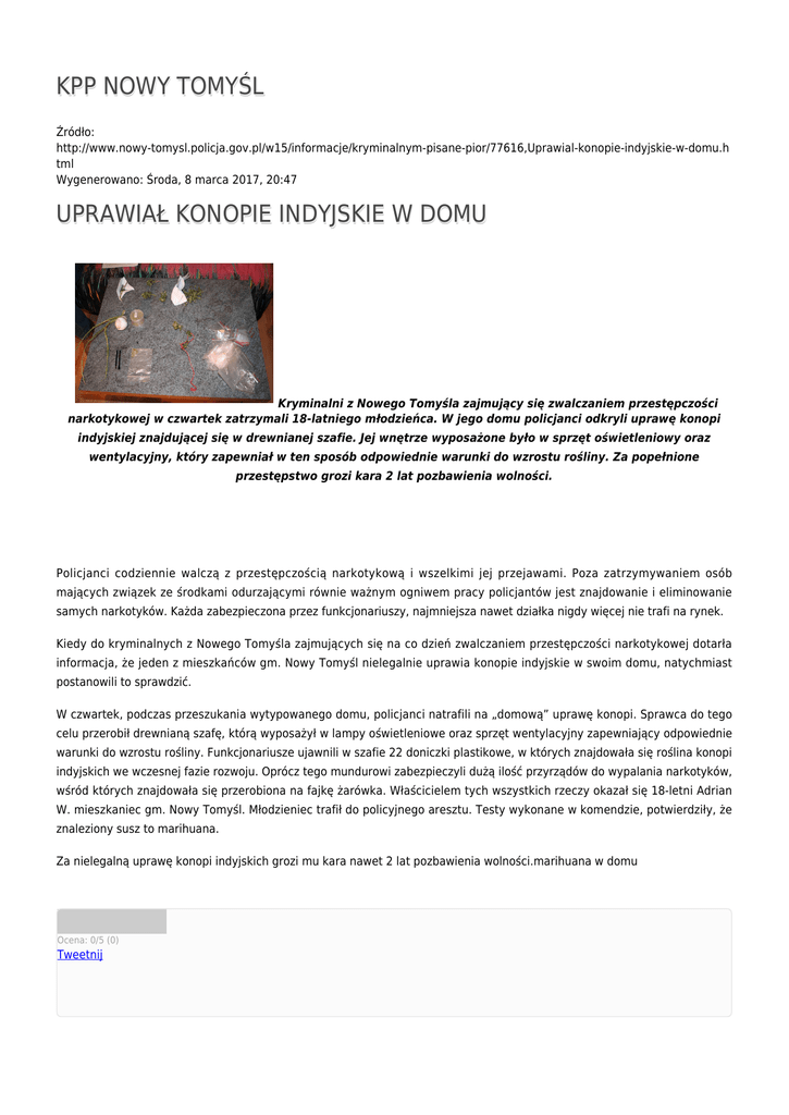 KPP NOWY TOMYŚL Źródło: http://www.nowy-tomysl.policja.gov.pl/w15/informacje/kryminalnym-pisane-pior/77616,Uprawial-konopie-indyjskie-w-domu.h tml Wygenerowano: Środa, 8 marca 2017, 20:47 UPRAWIAŁ KONOPIE INDYJSKIE W DOMU Kryminalni z Nowego Tomyśla zajmujący się zwalczaniem przestępczości narkotykowej w czwartek zatrzymali 18-latniego młodzieńca. W jego domu policjanci odkryli uprawę konopi indyjskiej znajdującej się w drewnianej szafie. Jej wnętrze wyposażone było w sprzęt oświetleniowy oraz wentylacyjny, który zapewniał w ten sposób odpowiednie warunki do wzrostu rośliny. Za popełnione przestępstwo grozi kara 2 lat pozbawienia wolności. Policjanci codziennie walczą z przestępczością narkotykową i wszelkimi jej przejawami. Poza zatrzymywaniem osób mających związek ze środkami odurzającymi równie ważnym ogniwem pracy policjantów jest znajdowanie i eliminowanie samych narkotyków. Każda zabezpieczona przez funkcjonariuszy, najmniejsza nawet działka nigdy więcej nie trafi na rynek. Kiedy do kryminalnych z Nowego Tomyśla zajmujących się na co dzień zwalczaniem przestępczości narkotykowej dotarła informacja, że jeden z mieszkańców gm. Nowy Tomyśl nielegalnie uprawia konopie indyjskie w swoim domu, natychmiast postanowili to sprawdzić. W czwartek, podczas przeszukania wytypowanego domu, policjanci natrafili na „domową” uprawę konopi. Sprawca do tego celu przerobił drewnianą szafę, którą wyposażył w lampy oświetleniowe oraz sprzęt wentylacyjny zapewniający odpowiednie warunki do wzrostu rośliny. Funkcjonariusze ujawnili w szafie 22 doniczki plastikowe, w których znajdowała się roślina konopi indyjskich we wczesnej fazie rozwoju. Oprócz tego mundurowi zabezpieczyli dużą ilość przyrządów do wypalania narkotyków, wśród których znajdowała się przerobiona na fajkę żarówka. Właścicielem tych wszystkich rzeczy okazał się 18-letni Adrian W. mieszkaniec gm. Nowy Tomyśl. Młodzieniec trafił do policyjnego aresztu. Testy wykonane w komendzie, potwierdziły, że znaleziony susz to marihuana. Za nielegalną uprawę konopi indyjskich grozi mu kara nawet 2 lat pozbawienia wolności.marihuana w domu Ocena: 0/5 (0) Tweetnij