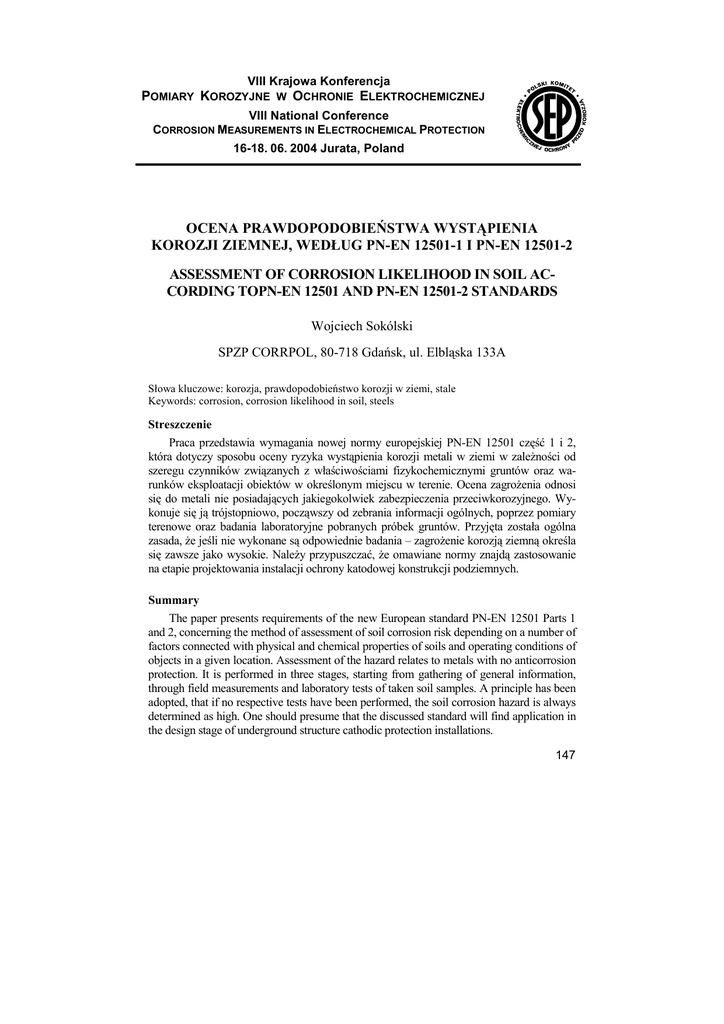 VIII Krajowa Konferencja POMIARY KOROZYJNE W OCHRONIE ELEKTROCHEMICZNEJ VIII National Conference CORROSION MEASUREMENTS IN ELECTROCHEMICAL PROTECTION 16-18. 06. 2004 Jurata, Poland OCENA PRAWDOPODOBIEŃSTWA WYSTĄPIENIA KOROZJI ZIEMNEJ, WEDŁUG PN-EN 12501-1 I PN-EN 12501-2 ASSESSMENT OF CORROSION LIKELIHOOD IN SOIL ACCORDING TOPN-EN 12501 AND PN-EN 12501-2 STANDARDS Wojciech Sokólski SPZP CORRPOL, 80-718 Gdańsk, ul. Elbląska 133A Słowa kluczowe: korozja, prawdopodobieństwo korozji w ziemi, stale Keywords: corrosion, corrosion likelihood in soil, steels Streszczenie Praca przedstawia wymagania nowej normy europejskiej PN-EN 12501 część 1 i 2, która dotyczy sposobu oceny ryzyka wystąpienia korozji metali w ziemi w zależności od szeregu czynników związanych z właściwościami fizykochemicznymi gruntów oraz warunków eksploatacji obiektów w określonym miejscu w terenie. Ocena zagrożenia odnosi się do metali nie posiadających jakiegokolwiek zabezpieczenia przeciwkorozyjnego. Wykonuje się ją trójstopniowo, począwszy od zebrania informacji ogólnych, poprzez pomiary terenowe oraz badania laboratoryjne pobranych próbek gruntów. Przyjęta została ogólna zasada, że jeśli nie wykonane są odpowiednie badania – zagrożenie korozją ziemną określa się zawsze jako wysokie. Należy przypuszczać, że omawiane normy znajdą zastosowanie na etapie projektowania instalacji ochrony katodowej konstrukcji podziemnych. Summary The paper presents requirements of the new European standard PN-EN 12501 Parts 1 and 2, concerning the method of assessment of soil corrosion risk depending on a number of factors connected with physical and chemical properties of soils and operating conditions of objects in a given location. Assessment of the hazard relates to metals with no anticorrosion protection. It is performed in three stages, starting from gathering of general information, through field measurements and laboratory tests of taken soil samples. A principle has been adopted, that if no respective tests have been performed, the soil corrosion hazard is always determined as high. One should presume that the discussed standard will find application in the design stage of underground structure cathodic protection installations. 147 Wprowadzenie W lutym 2003 roku CEN zatwierdziło normę EN 12501 „Ochrona materiałów metalowych przed korozją - Prawdopodobieństwo wystąpienia korozji ziemnej, w dwóch częściach – Część 1: Postanowienia ogólne i Część 2: Materiały ze stali niskostopowych i niestopowych. Analiza korozji konstrukcji zakopanych w ziemi jest złożona z powodu współdziałania różnych czynników systemu korozyjnego, takich jak grunt, rodzaj materiału metalowego, charakterystyka konstrukcji i otaczającego środowiska. Wskutek tego identyfikacja i ocena czynników związanych z prawdopodobieństwem wystąpienia korozji jest bardzo złożona. Nowa norma ma służyć pomocą w systematycznej ocenie omawianego zagrożenia korozyjnego, jednak zakłada potrzebę uzupełniania jej odpowiednimi ekspertyzami i badaniami naukowymi. Norma stanowi podstawę do oceny prawdopodobieństwa wystąpienia korozji ziemnej zakopanych konstrukcji metalowych takich jak rurociągi, kable w osłonach metalowych, zbiorniki magazynowe, ściany szczelne, kotwy podpór, przepusty i umocnienia ziemne. W pierwszej części niniejszej zdefiniowano ogólne pojęcia dotyczące metody oceny i wymieniono główne czynniki wpływające na korozję konstrukcji podziemnych. W drugiej części podano podstawy do oceny zagrożenia korozją ziemną materiałów ze stali niskostopowych i niestopowych w bezpośrednim kontakcie z gruntem. Oczywiście w normie nie są ujęte systemy ochrony przed korozją i ich zastosowanie – zawarte są one w specjalnych normach przedmiotowych. Norma dotyczy przypadku nowych zakopanych konstrukcji i podaje informacje dla konstrukcji istniejących. Pojęcia ogólne Ocenę prawdopodobieństwa czy tez ryzyka wystąpienia korozji zakopanych konstrukcji stalowych zdefiniowano biorąc pod rozwagę: parametry gruntu, charakterystyki konstrukcji bez ochrony i czynniki środowiskowe. Parametry gruntu wg EN-12501 Charakterystyka konstrukcji Szacowanie zagrożenia korozją w ziemi Czynniki środowiskowe (tablica 1) Uwzględnienie danych związanych z budową obiektu i jego funkcją wg EN-12501 w połączeniu z normami przedmiotowymi Ryzyko wystąpienia uszkodzeń korozyjnych obiektu (tablica 2) Wnioski dotyczące użyteczności, trwałości i sposobu ochrony przed korozją obiektu Diagram do oceny prawdopodobieństwa wystąpienia korozji ziemnej 148 Klasyfikacja zagrożenia korozją ziemną Norma definiuje trzy klasy zagrożenia korozją ziemną danego metalu, jak w tabl. 1. Tabl. 1. Klasy zagrożenia korozją ziemną Klasy zagrożenia korozją Klasyfikacja prawdopodobieństwa NISKA Niskie prawdopodobieństwo, że ubytek korozyjny będzie powyżej wartości progowej lub, że wystąpi specyficzny efekt korozyjny (patrz UWAGA). ŚREDNIA Wysokie prawdopodobieństwo, że ubytek korozyjny będzie pomiędzy górnym i dolnym poziomem wartości progowych. WYSOKA Wysokie prawdopodobieństwo, że ubytek korozyjny będzie powyżej wartości progowej lub wystąpi specyficzny efekt korozyjny. UWAGA: Specyficzny efekt korozyjny zależy od rodzaju korozji jak korozja wżerowa, korozja szczelinowa, korozja bimetaliczna, korozja wodorowa, korozja zmęczeniowa lub korozja naprężeniowa. Jeżeli spodziewane są wymienione rodzaje korozji, zagrożenie korozyjne zaleca się zawsze przyjmować jako WYSOKIE, ponieważ niemożliwa jest ilościowa ocena tych zmian. Ryzyko wystąpienia uszkodzeń korozyjnych konstrukcji (obiektu) w ziemi Ryzyko wystąpienia uszkodzeń korozyjnych może być oszacowane na podstawie klasy zagrożenia korozyjnego w ziemi w połączeniu z wymaganiami dotyczącym funkcji konstrukcji, jej budowy (rodzaj materiał, grubość itp.), przewidywanej użyteczności i założ