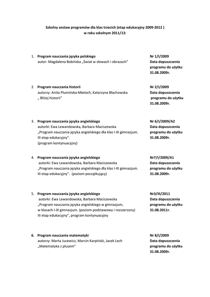 Szkolny zestaw programów dla klas trzecich (etap edukacyjny 2009-2012 ) w roku szkolnym 2011/12: 1. Program nauczania języka polskiego autor: Magdalena Bobińska „Świat w słowach i obrazach” Nr 1/I/2009 Data dopuszczenia programu do użytku 31.08.2009r. 2. Program nauczania historii autorzy: Anita Plumińska-Mieloch, Katarzyna Błachowska „ Bliżej historii” Nr 2/I/2009 Data dopuszczenia programu do użytku 31.08.2009r. 3. Program nauczania języka angielskiego autorki: Ewa Lewandowska, Barbara Maciszewska „Program nauczania języka angielskiego dla klas I-III gimnazjum. III etap edukacyjny”. (program kontynuacyjny) Nr 6/I/2009/A2 Data dopuszczenia programu do użytku 31.08.2009r. 4. Program nauczania języka angielskiego autorki: Ewa Lewandowska, Barbara Maciszewska „Program nauczania języka angielskiego dla klas I-III gimnazjum. III etap edukacyjny”. (poziom początkujący) Nr7/I/2009/A1 Data dopuszczenia programu do użytku 31.08.2009r. 5. Program nauczania języka angielskiego autorki: Ewa Lewandowska, Barbara Maciszewska „Program nauczania języka angielskiego w gimnazjum, w klasach I-III gimnazjum. (poziom podstawowy i rozszerzony) III etap edukacyjny”, program kontynuacyjny Nr3/III/2011 Data dopuszczenia programu do użytku 31.08.2011r. 6. Program nauczania matematyki autorzy: Marta Jucewicz, Marcin Karpiński, Jacek Lech „Matematyka z plusem” Nr 8/I/2009 Data dopuszczenia programu do użytku 31.08.2009r. 7. Program nauczania fizyki autorzy: Marcin Braun, Weronika Śliwa „To jest fizyka” Nr 9/I/2009 Data dopuszczenia programu do użytku 31.08.2009r. 8. Program nauczania chemii „Świat chemii”- pakiet edukacyjny pod red. Anny Warchoł Nr 10/I/2009 Data dopuszczenia programu do użytku 31.08.2009r. 9. Program nauczania biologii autor: Anna Zdziennicka „Puls życia.” Nr 11/I/2009 Data dopuszczenia programu do użytku 31.08.2009r. 10. Program nauczania geografii autorzy: Ewa Maria Tuz, Dawid Szczypiński „Planeta nowa.” Nr 12/I/2009 Data dopuszczenia programu do użytku 31.08.2009r. 11. Program nauczania informatyki autor: Ewa Filipowicz „ Informatyka dla ciebie.” Nr 13/I/2009 Data dopuszczenia programu do użytku 31.08.2009r. 12. Program nauczania wychowania fizycznego Program zredagowany na podstawie programu wychowania fizycznego o profilu rekreacyjno-zdrowotnym „ Wybierz sam” autorstwa Ewy Czerskiej i programu „Wychowanie fizyczne, klasy 1-3 gimnazjum” autorstwa Mirosławy Śmigielskiej oraz programu do nauki pływania autorstwa Magdaleny Mizerek i Agnieszki Radwańskiej Nr 14/I/2009 Data dopuszczenia programu do użytku 31.08.2009r. 13. Program nauczania wychowania fizycznego Program zredagowany na podstawie „Wybierz sam”, autorstwa Ewy Czerskiej i „Wychowanie fizyczne”, autorstwa Mirosławy Śmigielskiej poszerzony o treści z dyscypliny sportowej: piłka siatkowa. Nr 4/III/2011 Data dopuszczenia programu do użytku 31.08.2011r. 14. Program nauczania wychowania fizycznego Program zredagowany na podstawie „Wybierz sam”, autorstwa Ewy Czerskiej i „Wychowanie fizyczne”, autorstwa Mirosławy Śmigielskiej poszerzony o treści z dyscypliny sportowej: taniec towarzyski. Nr 5/III/2011 Data dopuszczenia programu do użytku 31.08.2011r. 15. Program nauczania religii „Wierzyć Chrystusowi” WAM Kraków, nr AZ-3-01/1 Nr 15/I/2009 Data dopuszczenia programu do użytku 31.08.2009r. 16. Program nauczania języka niemieckiego autor Paweł Piszczatowski „Program nauczania języka niemieckiego w gimnazjum” (kurs podstawowy) Nr 16/I/2009 Data dopuszczenia programu do użytku 31.08.2009r. 17. Program nauczania języka francuskiego autorka: Justyna Bacz- Kazior „Program nauczania języka francuskiego dla gimnazjum” (kurs kontynuacyjny) Nr 17/I/2009 Data dopuszczenia programu do użytku 31.08.2009r. 18. Program nauczania wychowania do życia w rodzinie autorzy: Małgorzata Sitarska, Bożena Strzemieczna „Wychowanie do życia w rodzinie” Nr 18/I/2009 Data dopuszczenia programu do użytku 31.08.2009r. 19. Program do zajęć artystycznych ( plastyka) „Spotkania pod tęczą” - zmodyfikowany program zajęć artystycznych z plastyki w gimnazjum, z wykorzystaniem elementów z programów do zajęć artystycznych: „ Osobisty kontakt z dziełami sztuki” i „Sztuka w życiu-życie w sztuce” autorstwa Beaty Mikulik Nr 1/III/2011 Data dopuszczenia programu do użytku 31.08.2011r. 20. Program do zajęć artystycznych( muzyka) opracowany na podstawie „Programu nauczania muzyki do zajęć artystycznych w gimnazjum” autorstwa Eugeniusza Wachowiaka. Nr 2/II/2010 Data dopuszczenia programu do użytku 30.08.2010r. 21. Program do zajęć technicznych autorzy: Waldemar Czyżewski, Ewa Uljasz „Technika w praktyce”. Program nauczania zajęć technicznych w Gimnazjum. Wyd. Nowa Era. Nr 3/II/2010 Data dopuszczenia programu do użytku 30.08.2010r. 22. Program do zajęć edukacja dla bezpieczeństwa „Edukacja dla Bezpieczeństwa” program nauczania dla gimnazjum, pod. red. Lecha Patrzyka Nr 2/III/2011 Data dopuszczenia programu do użytku 31.08.2011r.