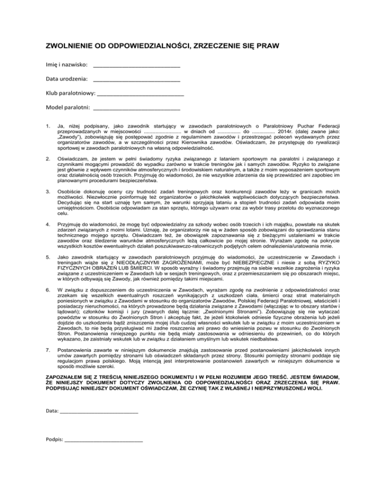 ZWOLNIENIE OD ODPOWIEDZIALNOŚCI, ZRZECZENIE SIĘ PRAW Imię i nazwisko: ___________________________ Data urodzenia: ___________________________ Klub paralotniowy: ___________________________ Model paralotni: ___________________________ 1. Ja, niżej podpisany, jako zawodnik startujący w zawodach paralotniowych o Paralotniowy Puchar Federacji przeprowadzanych w miejscowości .......................... w dniach od ................ do ................ 2014r. (dalej zwane jako: „Zawody”), zobowiązuję się postępować zgodnie z regulaminem zawodów i przestrzegać poleceń wydawanych przez organizatorów zawodów, a w szczególności przez Kierownika zawodów. Oświadczam, że przystępuję do rywalizacji sportowej w zawodach paralotniowych na własną odpowiedzialność. 2. Oświadczam, że jestem w pełni świadomy ryzyka związanego z lataniem sportowym na paralotni i związanego z czynnikami mogącymi prowadzić do wypadku zarówno w trakcie treningów jak i samych zawodów. Ryzyko to związane jest głównie z wpływem czynników atmosferycznych i środowiskiem naturalnym, a także z moim wyposażeniem sportowym oraz działalnością osób trzecich. Przyjmuję do wiadomości, że nie wszystkie zdarzenia da się przewidzieć ani zapobiec im planowanymi procedurami bezpieczeństwa. 3. Osobiście dokonuję oceny czy trudność zadań treningowych oraz konkurencji zawodów leży w granicach moich możliwości. Niezwłocznie poinformuję też organizatorów o jakichkolwiek wątpliwościach dotyczących bezpieczeństwa. Decydując się na start uznaję tym samym, że warunki sprzyjają lataniu a stopień trudności zadań odpowiada moim umiejętnościom. Osobiście odpowiadam za stan sprzętu, którego używam oraz za wybór trasy przelotu do wyznaczonego celu. 4. Przyjmuję do wiadomości, że mogę być odpowiedzialny za szkody wobec osób trzecich i ich majątku, powstałe na skutek zdarzeń związanych z moimi lotami. Uznaję, że organizatorzy nie są w żaden sposób zobowiązani do sprawdzania stanu technicznego mojego sprzętu. Oświadczam też, że obowiązek zapoznawania się z bieżącymi ustaleniami w trakcie zawodów oraz śledzenie warunków atmosferycznych leżą całkowicie po mojej stronie. Wyrażam zgodę na pokrycie wszystkich kosztów ewentualnych działań poszukiwawczo-ratowniczych podjętych celem odnalezienia/uratowania mnie. 5. Jako zawodnik startujący w zawodach paralotniowych przyjmuję do wiadomości, że uczestniczenie w Zawodach i treningach wiąże się z NIEODŁĄCZNYMI ZAGROŻENIAMI, może być NIEBEZPIECZNE i niesie z sobą RYZYKO FIZYCZNYCH OBRAŻEŃ LUB ŚMIERCI. W sposób wyraźny i świadomy przejmuję na siebie wszelkie zagrożenia i ryzyka związane z uczestniczeniem w Zawodach lub w sesjach treningowych, oraz z przemieszczaniem się po obszarach miejsc, w których odbywają się Zawody, jak również pomiędzy takimi miejscami. 6. W związku z dopuszczeniem do uczestniczenia w Zawodach, wyrażam zgodę na zwolnienie z odpowiedzialności oraz zrzekam się wszelkich ewentualnych roszczeń wynikających z uszkodzeń ciała, śmierci oraz strat materialnych poniesionych w związku z Zawodami w stosunku do organizatorów Zawodów, Polskiej Federacji Paralotniowej, właścicieli i posiadaczy nieruchomości, na których prowadzone będą działania związane z Zawodami (włączając w to obszary startów i lądowań); członków komisji i jury (zwanych dalej łącznie: „Zwolnionymi Stronami”). Zobowiązuję się nie wytaczać powództw w stosunku do Zwolnionych Stron i akceptuję fakt, że jeżeli ktokolwiek odniesie fizyczne obrażenia lub jeżeli dojdzie do uszkodzenia bądź zniszczenia mojej i/lub cudzej własności wskutek lub w związku z moim uczestniczeniem w Zawodach, to nie będą przysługiwać mi żadne roszczenia ani prawo do wniesienia pozwu w stosunku do Zwolnionych Stron. Postanowienia niniejszego punktu nie będą miały zastosowania w odniesieniu do przewinień, co do których wykazano, że zaistniały wskutek lub w związku z działaniem umyślnym lub wskutek niedbalstwa. 7. Postanowienia zawarte w niniejszym dokumencie znajdują zastosowanie przed postanowieniami jakichkolwiek innych umów zawartych pomiędzy stronami lub oświadczeń składanych przez strony. Stosunki pomiędzy stronami poddaje się regulacjom prawa polskiego. Moją intencją jest interpretowanie postanowień zawartych w niniejszym dokumencie w sposób możliwie szeroki. ZAPOZNAŁEM SIĘ Z TREŚCIĄ NINIEJSZEGO DOKUMENTU I W PEŁNI ROZUMIEM JEGO TREŚĆ. JESTEM ŚWIADOM, ŻE NINIEJSZY DOKUMENT DOTYCZY ZWOLNIENIA OD ODPOWIEDZIALNOŚCI ORAZ ZRZECZENIA SIĘ PRAW. PODPISUJĄC NINIEJSZY DOKUMENT OŚWIADCZAM, ŻE CZYNIĘ TAK Z WŁASNEJ I NIEPRZYMUSZONEJ WOLI. Data: ___________________________ Podpis: ___________________________