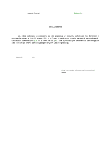 (pieczęć oferenta) Załączn ik n r OŚWIADCZENIE Ja, niżej podpisany oświadczam, że nie pozostaję w stosunku zależności lub dominacji w rozumieniu ustawy z dnia 22 marca 1991 r. - Prawo o publicznym obrocie papierami wartościowymi i funduszach powierniczych (Dz. U. z 1994r. Nr 58. póz. 239, z późniejszymi zmianami) z Zamawiającym albo osobami po stronie Zamawiającego biorącymi udział w przetargu Miejscowość dnia pieczęć imienna i podpisy osób upoważnionych do reprezentowania oferenta