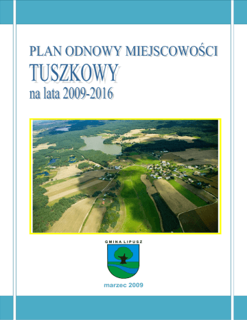 GMINA LIPUSZ marzec 2009 PLAN ODNOWY MIEJSCOWOŚCI TUSZKOWY WSTĘP Plan Odnowy Miejscowości Tuszkowy określa działania w sferze jej rozwoju na lata 2009 2016. Jego realizacja ma stworzyć warunki dla rozwoju społeczno-ekonomicznego sołectwa Tuszkowy i aktywizacji jego mieszkańców. Przewiduje on realizację projektów związanych z zagospodarowaniem przestrzeni publicznej, w tym utrzymaniem, odbudową i poprawą stanu dziedzictwa kulturowego i przyrodniczego wsi oraz podniesienie atrakcyjności turystycznej obszarów wiejskich. Dokument powstał w oparciu o wytyczne zawarte w „Instrukcji do planu odnowy miejscowości” i jest zgodny z rozporządzeniem Ministra Rolnictwa i Rozwoju Wsi z dnia 14 lutego 2008 r. w sprawie szczegółowych warunków i trybu przyznawania pomocy finansowej w ramach działania „Odnowa i rozwój wsi” objętego Programem Rozwoju Obszarów Wiejskich na lata 2007-2013. Celem działania „Odnowa i rozwój wsi” jest wpływanie na poprawę jakości życia na obszarach wiejskich przez zaspokojenie potrzeb społecznych i kulturalnych mieszkańców wsi oraz promowanie obszarów wiejskich. Umożliwianie rozwoju tożsamości społeczności wiejskiej, zachowanie dziedzictwa kulturowego i specyfiki obszarów wiejskich oraz wpływanie na wzrost atrakcyjności turystycznej i inwestycyjnej obszarów wiejskich. Niniejszy Plan Odnowy Miejscowości zawiera: - charakterystykę miejscowości, w której będzie realizowana operacja; - inwentaryzację zasobów służących odnowie miejscowości; - ocenę mocnych i słabych stron miejscowości, w której będzie realizowana operacja; - opis planowanych zadań inwestycyjnych i przedsięwzięć aktywizujących społeczność lokalną w okresie co najmniej 7 lat od dnia przyjęcia planu odnowy miejscowości, w kolejności wynikającej z przyjętych priorytetów rozwoju miejscowości, z podaniem szacunkowych kosztów ich realizacji. Podstawą opracowania planu jest Plan Rozwoju Lokalnego Gminy Lipusz przyjęty Uchwałą Nr XXXVIII/188/2006 Rady Gminy Lipusz z dnia 21 czerwca 2006. Przy jego opracowywaniu wzięto także pod uwagę wnioski zgłaszane na zebraniach wiejskich, sołtysa i radę sołecką oraz organizacje pozarządowe działające na terenie Gminy Lipusz. W opisie planowanych do realizacji zadań zawarto nie tylko przedsięwzięcia inwestycyjne ale również inne zadania przyczyniające się do aktywizacji społeczności lokalnej. Plan Odnowy Miejscowości Tuszkowy ma posłużyć przede wszystkim uzyskaniu wsparcia z Programu Rozwoju Obszarów Wiejskich oraz Regionalnego Programu Operacyjnego dla Województwa Pomorskiego na lata 2007 – 2013. Wymienione w planie zadania mogą się również ubiegać o wsparcie z innych źródeł. W miarę potrzeb i pojawiania się nowych możliwości uzyskania wsparcia na rozwój obszarów wiejskich plan może być aktualizowany. Pozwoli to na efektywne i racjonalne podejmowanie działań służących rozwojowi sołectwa. 6 PLAN ODNOWY MIEJSCOWOŚCI TUSZKOWY CHARAKTERYSTYKA MIEJSCOWOŚCI 1.1. Podstawowe dane (położenie wsi, powierzchnia, liczba ludności): Sołectwo Tuszkowy położone jest w gminie Lipusz. Gmina leży w środkowej części województwa pomorskiego w powiecie kościerskim. W skład sołectwa wchodzą miejscowości: Tuszkowy, Bartkowa Stajnia, Czajki-Błoto, Jasna Gwiazda, Szczeblewo, Zielony Dwór i Dębowa Góra. Sołectwo leży w pzachodniej części gminy przy granicy z gminami Dziemiany i Studzienice, nad Jeziorem Ostronko. Według fizyczno-geograficznej regionalizacji Polski J. Kondrackiego Tuszkowy leżą na terenie podprowincji Pojezierzy Południowych w mezoregionach Równina Charzykowska i Bory Tucholskie. Etnograficznie miejscowość przynależy do Kaszub. Cały obszar sołectwa znajduje się w dorzeczu Wdy. Sołectwo Tuszkowy zajmuje obszar 15,75 km2 co stanowi 14,42% powierzchni gminy. Obszar ten zamieszkuje 213 mieszkańców co stanowi 6,2% ogółu mieszkańców gminy. W Tuszkowach mieszka 133 osób, w Bartkowej Stajni – 4, Czajkach-Błocie – 14, Jasnej Gwieździe – 6, Szczeblewie – 11, Zielonym Dworze – 33 a Dębowej Górze - 12. Na przestrzeni ostatnich 10 lat można zaobserwować niewielki wzrost liczby mieszkańców sołectwa, w 2000 roku było ich 198, przybyło więc 15 osób, co stanowi wzrost o ponad 7,5%. Do miejscowości Tuszkowy dochodzi droga powiatowa nr 2401G relacji Lipusz – Tuszkowy. 1.2. Historia wsi Tuszkowy Tuszkowy powstały około 1400 roku. Pierwotnie wzmiankowane były jako Thuskow. We wsi był młyn i karczma. Miejscowość należała do komornictwa mirachowskiego. Już w 1861 roku w Tuszkowach była szkoła. Znajdujące się w szkole kroniki z 1876 r. opisują historię szkoły i wsi. Podczas okupacji niemieckiej miała miejsce pacyfikacja ludności miejscowości Tuszkowy przez gestapo, mająca na celu zatrzymanie ludności udzielającej pomocy partyzantom Gryfa Pomorskiego. W latach 1944-1945 we wsi Tuszkowy znajdował się poligon SS Westpreussen, dla wojsk litewskich, łotewskich, estońskich, sporadycznie białoruskich. 1.3. Przestrzenna struktura miejscowości Tuszkowy Wieś Tuszkowy położona jest w zachodniej części gminy Lipusz. Charakteryzuje się zabudową usytuowaną wzdłuż kilku rozchodzących się gwieździście dróg. Do sołectwa należą też rozsiane wśród lasów, łąk i pól sioła składające się z kilku zagród. Centrum miejscowości skupia się wokół szkoły, sklepu i przystanku autobusowego oraz remizy. W jej centralnym punkcie miejscowości znajduje się skrzyżowanie, przy którym stoi kapliczka. 7 PLAN ODNOWY MIEJSCOWOŚCI TUSZKOWY Dużym atutem miejscowości jest położenie w obrębie strefy o charakterze leśnym, z preferencjami dla funkcji turystycznej. Na terenie miejscowości Tuszkowy obserwuje sie stały napływ turystów z zewnątrz, co wynika z rozwoju turystyki letniskowej na tym terenie. 6 PLAN ODNOWY MIEJSCOWOŚCI TUSZKOWY INWENTARYZACJA ZASOBÓW SŁUŻĄCYCH ODNOW