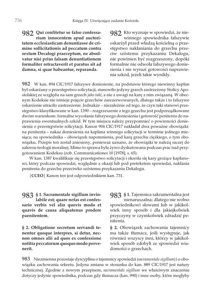 736 Ksiêga IV. Uœwiêcaj¹ce zadanie Koœcio³a 982 Qui confitetur se falso confessarium innocentem apud auctoritatem ecclesiasticam denuntiasse de crimine sollicitationis ad peccatum contra sextum Decalogi praeceptum, ne absolvatur nisi prius falsam denuntiationem formaliter retractaverit et paratus sit ad damna, si quae habeantur, reparanda. wyznaje w spowiedzi, ¿e nie982 Kto winnego spowiednika fa³szywie oskar¿y³ przed w³adz¹ koœcieln¹ o przestêpstwo nak³aniania do grzechu przeciw szóstemu przykazaniu Dekalogu, nie powinien byæ rozgrzeszony, dopóki formalnie nie odwo³a fa³szywego doniesienia i nie wyrazi gotowoœci naprawienia szkód, je¿eli takie wynik³y. 982 W kan. 894 CIC/1917 fa³szywe doniesienie, na podstawie którego niewinny kap³an by³ oskar¿any o przestêpstwo solicytacji, stanowi³o jedyny grzech zastrze¿ony Stolicy Apostolskiej ze wzglêdu na sam grzech jako taki, a nie z uwagi na karê z nim zwi¹zan¹. W obecnym Kodeksie nie istnieje pojêcie grzechów zarezerwowanych, dlatego tak¿e i to fa³szywe oskar¿enie utraci³o zastrze¿enie. Jednak¿e – niezale¿nie od tego, ¿e czyn taki stanowi przestêpstwo klasyfikowane w kan. 1390 – rozgrzeszenie z tego grzechu jest podporz¹dkowane dwóm warunkom: formalne wycofanie fa³szywego doniesienia i gotowoœæ penitenta do naprawienia ewentualnych szkód. W tym miejscu nale¿y przypomnieæ o powinnoœci doniesienia o przestêpstwie solicytacji. Kanon 904 CIC/1917 nak³ada³ dwa powa¿ne obowi¹zki: na penitenta – nakaz doniesienia na kap³ana winnego solicytacji w terminie jednego miesi¹ca; na spowiednika – obowi¹zek napomnienia, pod kar¹ grzechu ciê¿kiego, o tym obowi¹zku. Przepis ten zosta³ zniesiony, poniewa¿ uznano, ¿e obowi¹zki te nale¿¹ raczej do zakresu teologii moralnej. Mimo to sprawa by³a ¿ywo dyskutowana podczas prac nad przygotowaniem Kodeksu (zob. Communicationes 10 [1978], s. 65). W kan. 1387 kwalifikuje siê przestêpstwo solicytacji i okreœla siê kary gro¿¹ce kap³anowi, który podczas spowiedzi, wzglêdnie z okazji lub pod pretekstem spowiedzi, nak³ania penitenta do grzechu przeciwko szóstemu przykazaniu Dekalogu. |CCEO| Kanon ten jest odpowiednikiem kan. 731. 1. Sacramentale sigillum invio983 §labile est; quare nefas est confes- 1. Tajemnica sakramentalna jest 983 §nienaruszalna; dlatego nie wolno sario verbis vel alio quovis modo et quavis de causa aliquatenus prodere paenitentem. spowiednikowi s³owami lub w jakikolwiek inny sposób i dla jakiejkolwiek przyczyny w czymkolwiek zdradziæ penitenta. § 2. Obligatione secretum servandi tenentur quoque interpres, si detur, necnon omnes alii ad quos ex confessione notitia peccatorum quoquo modo pervenerit. § 2. Obowi¹zek zachowania tajemnicy ma tak¿e t³umacz, jeœli wystêpuje, jak równie¿ wszyscy inni, którzy w jakikolwiek sposób zdobyli ze spowiedzi wiadomoœci o grzechach. 983 Niezmienna pozostaje dyscyplina o tajemnicy spowiedzi (sacramentale sigillum) i o obowi¹zku zachowania sekretu. Jedyna zmiana w stosunku do kan. 889 CIC/1917 jest natury technicznej. Zgodnie z nowym przepisem, sacramentale sigillum we w³aœciwym znaczeniu dotyczy jedynie spowiednika, podczas gdy t³umacza (kan. 990) i inne osoby, które mog³yby