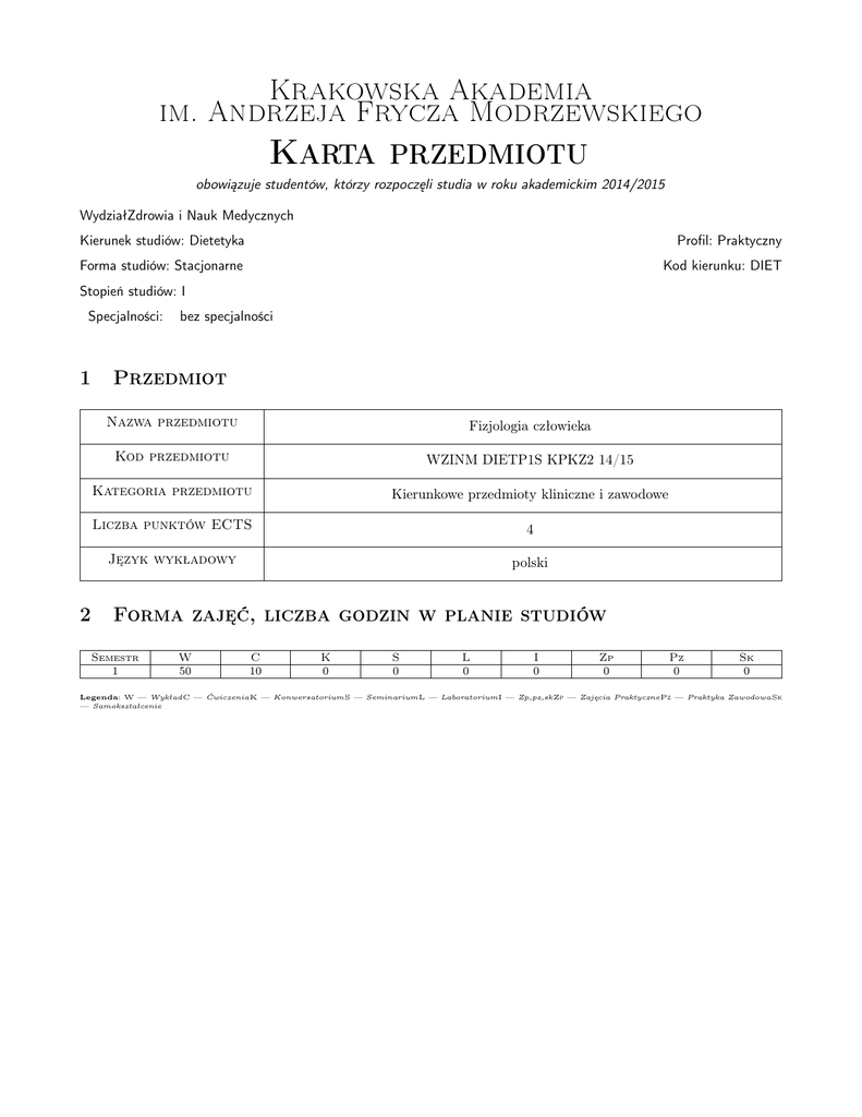 Krakowska Akademia im. Andrzeja Frycza Modrzewskiego Karta przedmiotu obowiązuje studentów, którzy rozpoczęli studia w roku akademickim 2014/2015 WydziałZdrowia i Nauk Medycznych Kierunek studiów: Dietetyka Profil: Praktyczny Forma studiów: Stacjonarne Kod kierunku: DIET Stopień studiów: I Specjalności: 1 2 bez specjalności Przedmiot Nazwa przedmiotu Fizjologia człowieka Kod przedmiotu WZINM DIETP1S KPKZ2 14/15 Kategoria przedmiotu Kierunkowe przedmioty kliniczne i zawodowe Liczba punktów ECTS 4 Język wykładowy polski Forma zajęć, liczba godzin w planie studiów Semestr 1 W 50 C 10 K 0 S 0 L 0 I 0 Zp 0 Pz 0 Sk 0 Legenda: W — WykładC — ĆwiczeniaK — KonwersatoriumS — SeminariumL — LaboratoriumI — Zp,pz,sk Zp — Zajęcia PraktycznePz — Praktyka ZawodowaSk — Samokształcenie Krakowska Akademia im. Andrzeja Frycza Modrzewskiego 3 Cele przedmiotu Cel 1 Zapoznanie studentów z ogólnymi zasadami funkcjonowania ustroju oraz fizjologicznymi procesami regulującymi działanie poszczególnych układów i narządów organizmu ludzkiego. Cel 2 Szczegółowe omówienie pojęcia homeostazy oraz wzajemnych oddziaływań narządów i układów czynnościowych. 4 Wymagania wstępne 1 Znajomość podstaw biologii. 5 Modułowe efekty kształcenia MW1 Wyjaśnia integrację oraz kontrolę funkcji na różnych poziomach regulacji układu, narządu i komórki. MW2 Definiuje czynności zachodzące w organizmie człowieka: funkcjonowanie narządu układu ruchu, układu krążenia, układu oddechowego, układu pokarmowego, układu moczowo-płciowego, układu nerwowego, układu dokrewnego. MW3 Wyjaśnia hemostazę organizmu, regulację gospodarki wodno-elektrolitowej i kwasowo-zasadowej. MW4 Rozpoznaje szczegółowo procesy trawienia i wchłaniania substancji odżywczych, zna mechanizmy regulacyjne zachodzące w przewodzie pokarmowym w trakcie przyjmowania posiłku i trawienia, potrafi omówić współdziałanie układu pokarmowego, endokrynnego i krążenia. 6 Treści programowe Lp W1 W2 W3 W4 W5 W6 W7 Wykład Tematyka zajęć Opis szczegółowy bloków tematycznych Środowisko wewnętrzne organizmu żywego (skład wewnętrzny organizmu, gospodarka mineralno-elektrolitowa, mechanizmy kontrolujące utrzymanie stałości składu organizmu, mechanizmy regulacji kwasowo-zasadowej i elektrolitowej) Układ krążenia (układ krwionośny i układ limfatyczny, zasady regulacji rytmu i siły skurczu serca, podstawy elektrofizjologii - EKG, układ bodźcotwórczy i przewodzenia, hemodynamika i autoregulacja tkankowego przepływu krwi, wymiana w łożysku kapilarnym, regulacja ciśnienia tętniczego, krążenie wieńcowe) Układ oddechowy (budowa i funkcja, podstawy wymiany gazowej w płucach i tkankach, mechanika oddychania i jej regulacja, pozaoddechowa funkcja płuc) Układ pokarmowy (podstawy trawienia i wchłaniania jelitowego, trawienie i wchłanianie białek, węglowodanów i tłuszczu, czynność motoryczna przewodu pokarmowego, enterohormonalna czynność układu pokarmowego, inne funkcje układu pokarmowego i wpływ na odporność organizmu) Układ moczowy (funkcja wydalnicza i homeostatyczna nerek, krążenie i filtracja nerkowa, podstawy nerkowej regulacji ciśnienia tętniczego krwi, skład moczu pierwotnego i ostatecznego, regulacja równowagi wodno-elektrolitowej i kwasowo-zasadowej organizmu) Układ dokrewny (budowa i mechanizm działania hormonów, oś podwzgórze przysadka - gruczoły docelowe, hormony tkankowe, cykle hormonalne, szczegółowa charakterystyka hormonów nadnerczowych) Układ nerwowy (ośrodki w CSN, receptory czuciowe, czuciowe i ruchowe szlaki nerwowe, rodzaje odruchów nerwowych, nerwowa kontrola popędów, emocji oraz procesów snu i czuwania, pamięć i uczenie się, czucie, ruch, percepcja) Strona 2/5 Liczba godzin 5 5 5 5 5 5 5 Krakowska Akademia im. Andrzeja Frycza Modrzewskiego Lp W8 W9 W10 Lp C1 C2 7 Wykład Tematyka zajęć Opis szczegółowy bloków tematycznych Układ ruchu (podstawy elektrofizjologii komórki i tkanki mięśniowej, przekaźnictwo synaptyczne i funkcja płytki nerwowo-mięśniowej, budowa i funkcja mięśni poprzecznie prążkowanych, gładkich i mięśnia sercowego, fizjologia skurczu mięśniowego) Układ rozrodczy (budowa i funkcja, regulacja oogenezy i spermatogenezy, cykl miesiączkowy, hormonalna regulacja ciąży, porodu i laktacji, hormony płciowe) Przedstawienie zdolności adaptacyjnej w/w układów: termoregulacja, wysiłek, stres, w wieku od niemowlęctwa po starość. Hemostaza. Razem Ćwiczenia Tematyka zajęć Opis szczegółowy bloków tematycznych Krew i układ krwiotwórczy (krew jako płyn ustrojowy, elementy morfotyczne krwi i ich znaczenie, osocze, hemostaza, grupy krwi) Hormony tarczycy, przytarczyc. Budowa mineralna kości, znaczenie układu kostnego w regulacji składu elektrolitowego ustroju - gospodarka wapniowo-fosforanowa. Razem Liczba godzin 5 5 5 50 Liczba godzin 5 5 10 Metody dydaktyczne M10. Prezentacje multimedialne M16. Wykłady M5. Dyskusja 8 Obciążenie pracą studenta Średnia liczba godzin na zrealizowanie aktywności Forma aktywności Godziny kontaktowe z nauczycielem akademickim, w tym: Godziny wynikające z planu studiów 60 Konsultacje przedmiotowe 0 Egzaminy i zaliczenia w sesji 0 Godziny bez udziału nauczyciela akademickiego wynikające z nakładu pracy studenta, w tym: Przygotowanie się do zajęć, w tym studiowanie zalecanej literatury 40 Opracowanie wyników 0 Przygotowanie raportu, projektu, prezentacji, dyskusji 0 Sumaryczna liczba godzin dla przedmiotu wynikająca z 100 całego nakładu pracy studenta 4 Sumaryczna liczba punktów ECTS dla przedmiotu Strona 3/5 Krakowska Akademia im. Andrzeja Frycza Modrzewskiego 9 Metody oceny Ocena podsumowująca P4. Kolokwium P7. Test jednokrotnego wyboru Warunki zaliczenia przedmiotu 1 Warunkiem zaliczenia ćwiczeń jest obecność na zajęciach oraz pozytywne oceny z kolokwiów cząstkowych. Warunkiem zaliczenia modułu jest zaliczenie mi