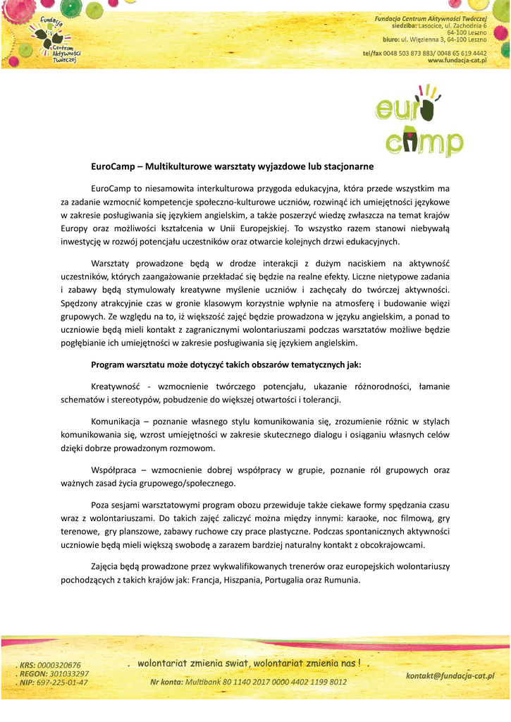 EuroCamp – Multikulturowe warsztaty wyjazdowe lub stacjonarne EuroCamp to niesamowita interkulturowa przygoda edukacyjna, która przede wszystkim ma za zadanie wzmocnić kompetencje społeczno-kulturowe uczniów, rozwinąć ich umiejętności językowe w zakresie posługiwania się językiem angielskim, a także poszerzyć wiedzę zwłaszcza na temat krajów Europy oraz możliwości kształcenia w Unii Europejskiej. To wszystko razem stanowi niebywałą inwestycję w rozwój potencjału uczestników oraz otwarcie kolejnych drzwi edukacyjnych. Warsztaty prowadzone będą w drodze interakcji z dużym naciskiem na aktywność uczestników, których zaangażowanie przekładać się będzie na realne efekty. Liczne nietypowe zadania i zabawy będą stymulowały kreatywne myślenie uczniów i zachęcały do twórczej aktywności. Spędzony atrakcyjnie czas w gronie klasowym korzystnie wpłynie na atmosferę i budowanie więzi grupowych. Ze względu na to, iż większość zajęć będzie prowadzona w języku angielskim, a ponad to uczniowie będą mieli kontakt z zagranicznymi wolontariuszami podczas warsztatów możliwe będzie pogłębianie ich umiejętności w zakresie posługiwania się językiem angielskim. Program warsztatu może dotyczyć takich obszarów tematycznych jak: Kreatywność - wzmocnienie twórczego potencjału, ukazanie różnorodności, łamanie schematów i stereotypów, pobudzenie do większej otwartości i tolerancji. Komunikacja – poznanie własnego stylu komunikowania się, zrozumienie różnic w stylach komunikowania się, wzrost umiejętności w zakresie skutecznego dialogu i osiąganiu własnych celów dzięki dobrze prowadzonym rozmowom. Współpraca – wzmocnienie dobrej współpracy w grupie, poznanie ról grupowych oraz ważnych zasad życia grupowego/społecznego. Poza sesjami warsztatowymi program obozu przewiduje także ciekawe formy spędzania czasu wraz z wolontariuszami. Do takich zajęć zaliczyć można między innymi: karaoke, noc filmową, gry terenowe, gry planszowe, zabawy ruchowe czy prace plastyczne. Podczas spontanicznych aktywności uczniowie będą mieli większą swobodę a zarazem bardziej naturalny kontakt z obcokrajowcami. Zajęcia będą prowadzone przez wykwalifikowanych trenerów oraz europejskich wolontariuszy pochodzących z takich krajów jak: Francja, Hiszpania, Portugalia oraz Rumunia. EuroCamp może mieć postać 2-3dniowego wyjazdu klasowego np. do Osiecznej, ale także może być zrealizowany na miejscu w szkole czy też w siedzibie Fundacji Centrum Aktywności Twórczej bądź wspierającej projekt Arenie Kreatywnej Edukacji. Dokładna cena zależy od liczby uczestników, dni oraz opcji stacjonarnej czy też wyjazdowej. W przypadku warsztatów stacjonarnych (6h dydaktycznych) koszt od osoby już od 20zł!!! EuroCampy będą realizowane od 15 października do 31 listopada roku 2015 oraz będą kontynuowane w roku 2016. Serdecznie zapraszamy do skorzystania z naszej wyjątkowej propozycji. Odpowiem na wszystkie pytania i przygotuję dla Państwa ofertę zgodnie z Państwa potrzebami: Magdalena Domagała, Koordynator działań Wolontariatu Europejskiego, tel 888 496 548