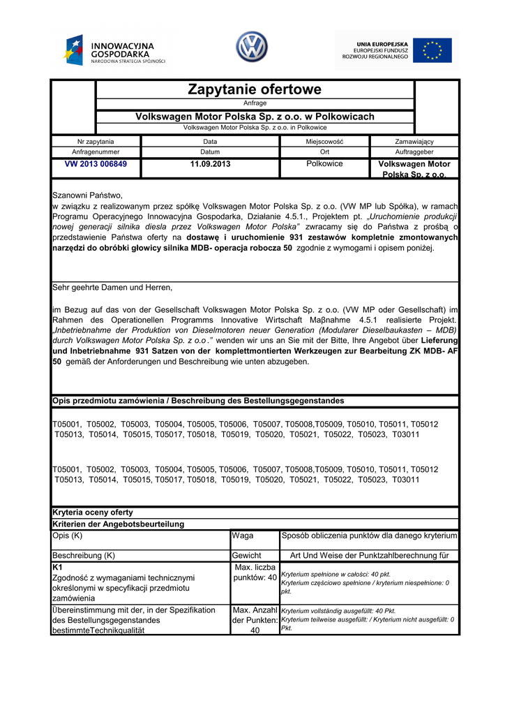 Zapytanie ofertowe Anfrage Volkswagen Motor Polska Sp. z o.o. w Polkowicach Volkswagen Motor Polska Sp. z o.o. in Polkowice Nr zapytania Data Miejscowość Zamawiający Anfragenummer Datum Ort Auftraggeber VW 2013 006849 11.09.2013 Polkowice Volkswagen Motor Polska Sp. z o.o. Szanowni Państwo, w związku z realizowanym przez spółkę Volkswagen Motor Polska Sp. z o.o. (VW MP lub Spółka), w ramach Programu Operacyjnego Innowacyjna Gospodarka, Działanie 4.5.1., Projektem pt. „Uruchomienie produkcji nowej generacji silnika diesla przez Volkswagen Motor Polska” zwracamy się do Państwa z prośbą o przedstawienie Państwa oferty na dostawę i uruchomienie 931 zestawów kompletnie zmontowanych narzędzi do obróbki głowicy silnika MDB- operacja robocza 50 zgodnie z wymogami i opisem poniŜej. Sehr geehrte Damen und Herren, im Bezug auf das von der Gesellschaft Volkswagen Motor Polska Sp. z o.o. (VW MP oder Gesellschaft) im Rahmen des Operationellen Programms Innovative Wirtschaft Maβnahme 4.5.1 realisierte Projekt. „Inbetriebnahme der Produktion von Dieselmotoren neuer Generation (Modularer Dieselbaukasten – MDB) durch Volkswagen Motor Polska Sp. z o.o .” wenden wir uns an Sie mit der Bitte, Ihre Angebot über Lieferung und Inbetriebnahme 931 Satzen von der komplettmontierten Werkzeugen zur Bearbeitung ZK MDB- AF 50 gemäß der Anforderungen und Beschreibung wie unten abzugeben. Opis przedmiotu zamówienia / Beschreibung des Bestellungsgegenstandes T05001, T05002, T05003, T05004, T05005, T05006, T05007, T05008,T05009, T05010, T05011, T05012 T05013, T05014, T05015, T05017, T05018, T05019, T05020, T05021, T05022, T05023, T03011 T05001, T05002, T05003, T05004, T05005, T05006, T05007, T05008,T05009, T05010, T05011, T05012 T05013, T05014, T05015, T05017, T05018, T05019, T05020, T05021, T05022, T05023, T03011 Kryteria oceny oferty Kriterien der Angebotsbeurteilung Opis (K) Beschreibung (K) K1 Zgodność z wymaganiami technicznymi określonymi w specyfikacji przedmiotu zamówienia Ȕbereinstimmung mit der, in der Spezifikation des Bestellungsgegenstandes bestimmteTechnikqualität Waga Sposób obliczenia punktów dla danego kryterium Gewicht Art Und Weise der Punktzahlberechnung für jedes Kriterium Max. liczba punktów: 40 Kryterium spełnione w całości: 40 pkt. Kryterium częściowo spełnione / kryterium niespełnione: 0 pkt. Max. Anzahl Kryterium vollständig ausgefüllt: 40 Pkt. der Punkten: Kryterium teilweise ausgefüllt: / Kryterium nicht ausgefüllt: 0 Pkt. 40 K2 Termin dostawy wskazany przez VWMP Max. liczba Zgodność z terminem dostawy wymaganym przez punktów: 30 Zamawiającego: 30 pkt. Częściowa lub całlkowita niezgodność z terminem dostawy wymaganym przez Zamawiającego: 0 pkt. Liefertermin, der vom Auftraggeber erfordert wird Max. Anzahl Übereinstimmung mit dem vom Auftraggeber erfordern der Punkten: Liefertermin: 30 Pkt. Teilweise Übereinstimmung und Unstimmigkeit mit dem vom 30 Auftraggeber erfordern Liefertermin: 0 Pkt. cena najniŜsza ---------------------------------------- x 30 = liczba punktów cena zadeklarowana przez Oferenta K3 Cena Max. liczba punktów: 30 Preis Max. Anzahl niedrigste Preis der Punkten: --------------------------------------------- x 30= Punktzahl 30 von dem Anbieter vorgeschalagener Preis Miejsce realizacji zamówienia / Ort der Bestellungsrealisierung Siedziba Volkswagen Motor Polska Sp z o. o.: ul. Strefowa 1, 59-101 Polkowice Termin oddania przez firmę maszyny do uŜytku klienta / Bertiebliche Übergabe TK 51 /2013 KW 51/2013 NajwaŜniejsze informacje dotyczące sposobu, terminu oraz miejsca składania ofert Die wichtigste Anmerkungen bezüglich der Art und Weise, Frist, sowie des Orts der Angebotsabgabe − Oferta powinna zostać złoŜona w formie pisemnej i zaadresowana na Volkswagen Motor Polska Sp. z o.o. z siedzibą w Polkowicach, ul. Strefowa 1, 59-101 Polkowice; _ Oferta powinna zostać złoŜona w terminie do dnia .20.09.2013 − KaŜda oferta powinna wskazywać termin waŜności. − Das Angebot soll im Schriftform eingerichtet werden und an Volkswagen Motor Polska Sp. z o.o. mit Sitz in Polkowice, ul. Strefowa 1, 59-101 Polkowice adressiert werden; _ Das Angebot soll bis zum 20.09.2013. abgegeben werden; − Jedes Angebot sollte auf ihre Geltungsdauer hinweisen. Inne istotne postanowienia / uwagi Andere relevante Bestimmungen / Anmerkungen − Zamawiający zastrzega sobie moŜliwość negocjowania Ofert. O terminie ew. negocjacji Oferenci zostaną poinformowani w odpowiednim czasie; − Der Auftraggeber behält sich das Recht vor, die Angeboten verhandeln zu können. Vom Termin der ev. Verhandlung werden die Anbieter in der ensprechenden Frist benachrichtigt; Osoba do kontaktu ze strony Zamawiającego Anprechpartner seitens des Auftraggebers Małgorzata Kruk, Specjalista ds. Handlu Zagranicznego i Zakupów Dawid Odrobina, Planowanie E-mail Telefon Adres [email protected] + 48 76 848 3264 Volkswagen Motor Polska Sp zoo ul. Strefowa 1, 59-101 Polkowice [email protected] + 48 76 8483945 Volkswagen Motor Polska Sp zoo ul. Strefowa 1, 59-101 Polkowice 1. Obowiązuje „Instrukcja organizacyjna nr 17 „Procedura zamówień w ramach projektu Uruchomienie produkcji nowej generacji silnika diesla (MDB – Modularer Dieselbaukasten) przez Volkswagen Motor Polska” („Instrukcja organizacyjna nr 17”), która stanowi integralną część niniejszego zapytania ofertowego. 2. Obowiązują Ogólne Warunki Zakupów VWMP. 3. Obowiązuje szczegółowa specyfikacja przedmiotu zamówienia (Lastenheft). Zusätzliche Bestimmungen: 1. Es gilt die Organisationsanweisung Nr 17 „Das Bestellungsverfahren im Rahmen des Projekts Inbetriebnahme der Produktion von Dieselmotoren neuer Generation (Modularer Dieselbaukasten – MDB) durch Volkswagen Motor Polska Sp. z o.o .“ („Organisationsanweisung Nr 17 ), die der integrale Teil dieser Angebotsanfrage ist. 2. Es gelten die allgemeine Verkaufsbedingungen von VWMP. 3. Es gilt die detaill
