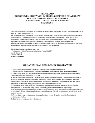 REGULAMIN ROZGRYWEK LIGOWYCH W TENISA ZIEMNEGO AMATORÓW O MISTRZOSTWO SEKCJI TENISOWEJ KLUBU SPORTOWEGO WARTA POZNAŃ SEZON 2015 Zapraszamy wszystkich chętnych do udziału w amatorskich rozgrywkach tenisa ziemnego na kortach przy ul. Droga Dębińska12!!!!! Do rozgrywek może się zapisać każdy. Nawet, jeśli uważasz, że grasz słabo to otrzymujesz możliwość zmierzenia się z innymi tenisistami – amatorami a to na pewno zmobilizuje Ciebie do ciężkich treningów i stałego podnoszenia swoich umiejętności. Mecze zapewniają oprócz rywalizacji możliwość do zawiązania nowych znajomości czy znalezienie nowych sparingpartnerów. Aby zapisać się do rozgrywkach należy przed początkiem sezonu do 25.04.2015 zgłosić się do osoby prowadzącej wyznaczonej przez Sekcję Tenisową KS Warta Poznań. Kontakt z osobą prowadzącą rozgrywki: ‘’Mistrzostwo Sekcji Tenisowej KS WARTA Poznań 2015” Jacek Gąsiorek Tel.602 258 573 [email protected] ORGANIZACJA I REGULAMIN ROZGRYWEK 1.Patronat nad rozgrywkami sprawuje: ·- Sekcja Tenisowa KS Warta Poznań 2. Prowadzącymi rozgrywki jest: ·- Jacek Gąsiorek tel. 602 258 573, mail: [email protected] 3. Celem rozgrywek jest propagowanie i rozwój tenisa ziemnego oraz wyłonienie mistrzów Sekcji Tenisowej KS Warta Poznań na 2015 rok. 4. Sekcja Tenisowa i prowadzący rozgrywki nie ponosi odpowiedzialności za ewentualne obrażenia i kontuzje powstałe podczas rywalizacji sportowej. Osoby uczestniczące w rozgrywkach wyrażają zgodę na udostępnienie danych osobowych na potrzeby organizacji rozgrywek ligowych w tenisa ziemnego amatorów o Mistrzostwo Sekcji Tenisowej KS Warta Poznań. 5.Przystąpienie do rozgrywek jest równoznaczne z zaakceptowaniem regulaminu i terminarza rozgrywek oraz przepisów gry w tenisa oraz kodeksu etyki postępowania zawodnika. 6. W sprawach spornych zawodnicy mogą wystąpić o rozpatrzenie sporu do Prowadzącego rozgrywki w terminie 7 dni od dnia wystąpienia spornego zdarzenia. Wnioski wniesione po terminie nie będą rozpatrywane. 7. Prowadzący rozgrywki zawiadamia zawodników o swojej decyzji w terminie 7 dni od dnia wniesienia wniosku. 8. Decyzja prowadzącego jest ostateczna. SYSTEM ROZGRYWEK 9. Udział w rozgrywkach mogą wziąć wszyscy chętni amatorzy bez względu na wiek i płeć. Amatorem jest każda osoba, która nie jest aktualnie klasyfikowana na listach PZT w kategorii kobiet i mężczyzn. Wprowadza się dolny limit wieku dla osób uczestniczących w rozgrywkach - ukończony 16 rok życia. Uczestnicy zgłaszają się(załącznik 1) do Prowadzącego rozgrywki: sms 602 258 573 Mail: Hubert @icpnet.pl Osoby niepełnoletnie biorą udział w rozgrywkach po dostarczeniu do Prowadzącego rozgrywki oświadczenia –(załącznik 2). 10. Zawodnicy rozgrywają mecze systemem każdy z każdym w zależności od liczby zgłoszonych zawodników. Prowadzący rozgrywki może określić inne zasady rozgrywania meczów. 11. Zawodnicy zobowiązani są do rozgrywania meczów zgodnie z terminarzem rozgrywek. 12. Po wyrażeniu zgody przez obu zainteresowanych zawodników mecze mogą być rozgrywane w innym terminem niż określono w harmonogramie. 13. Mecze rozgrywane są trzema lub czteroma nowymi piłkami na kortach ziemnych Sekcji Tenisowej KS Warta Poznań ul. Droga Dębińska 12. Rezerwację kortu oraz piłki powinien zapewnić gospodarz spotkania tj. osoba wymieniona w terminarzu rozgrywek na pierwszym miejscu. Mecze mogą być rozegrane na innych kortach za zgodą obu zawodników. W przypadku rozgrywania spotkań ligowych na kortach przy ul. Droga Dębińska 12 zawodnicy korzystają z specjalnej oferty na kort określonych przez Sekcję Tenisową KS Warta. 20, 00 PLN -1.5h 30, 00 PLN -2h ( cały tydzień) 0, 00 PLN - za wynajęcie kortu na mecz ligowy zawodnicy z opłaconą składką członkowską Sympatyk 120 Sekcji Tenisowej, KS Warta Poznań na rok 2015 . ( cały tydzień) 14. W rozgrywkach bierze udział minimum 8 osób. a.) Rozgrywki będą przeprowadzone systemem 2 rund: • I runda wstępna (losowanie 26.04.2015) 01.05 - 30.08.2015 • II runda turniej pucharowy (losowanie 11.09.2015) - turniej 12.09.2015 b.) W I rundzie rozgrywek kryterium przydziału do grupy jest na podstawie wyników rozgrywek o Mistrzostwo Sekcji Tenisowej w 2014 roku oraz o dolosowanie o nowo zgłoszonych zawodników. W systemie pucharowym najlepsi z wstępnej rundy I będą rozstawieni w turnieju pucharowym. 14. System rozgrywek ligowych polega na: rozegraniu w terminie przez każdego zawodnika danej grupy określonej ilości meczów tenisowych systemem "każdy z każdym" do wygrania 2 setów. W systemie pucharowym o wygranej decyduje 1 mecz do wygrania 2 setów. We wszystkie meczach obowiązuje następująca formuła rozegrania meczu: ·- w secie 1 i 2 przy stanie 6: 6 obowiązuje tie-break do 7 punktów - w secie 3 obowiązuje rozegranie super tie-break do 10 punktów W turnieju pucharowym formuła meczu będzie podana przed rozpoczęciem turnieju. 15. Punktacja: -za mecz wygrany 2:0 w setach - 3 punkty -za mecz wygrany 2:1w setach -2 punkty -za mecz przegrany w 1:2 w setach - 1 punkt -za mecz przegrany 0:2 w setach oraz przez walkower - 0 punktów 16.O kolejności zawodników w Grupie decydują odpowiednio: ·-większa ilość zdobytych punktów, ·- większa różnica setów w meczach, ·-większa różnica gemów, ·- wynik meczu bezpośredniego między zainteresowanymi 17. Inicjatywa uściślania terminu spotkania, w przedziale czasu określonym w harmonogramie spoczywa na gospodarzu pojedynku, który powinien skontaktować się z przeciwnikiem najpóźniej w pierwszych czterech dniach tego okresu. W przypadku niemożności uzgodnienia terminu spotkania lub braku inicjatywy ze strony gospodarza spotkania zainteresowani zawodnicy zobowiązani są niezwłocznie powiadomić o tym fakcie prowadzącego rozgrywki p. Jacka Gąsiorka. Nierozegranie meczu w terminie określonym w harmonogramie lub ustalonym zgodnie z pkt 