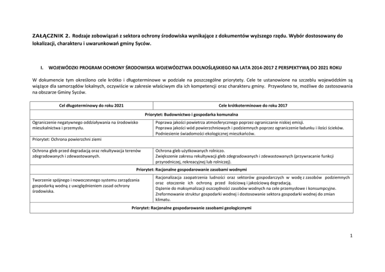 ZAŁĄCZNIK 2. Rodzaje zobowiązań z sektora ochrony środowiska wynikające z dokumentów wyższego rzędu. Wybór dostosowany do lokalizacji, charakteru i uwarunkowań gminy Syców. I. WOJEWÓDZKI PROGRAM OCHRONY ŚRODOWISKA WOJEWÓDZTWA DOLNOŚLĄSKIEGO NA LATA 2014-2017 Z PERSPEKTYWĄ DO 2021 ROKU W dokumencie tym określono cele krótko i długoterminowe w podziale na poszczególne priorytety. Cele te ustanowione na szczeblu wojewódzkim są wiążące dla samorządów lokalnych, oczywiście w zakresie właściwym dla ich kompetencji oraz charakteru gminy. Przywołano te, możliwe do zastosowania na obszarze Gminy Syców. Cel długoterminowy do roku 2021 Cele krótkoterminowe do roku 2017 Priorytet: Budownictwo i gospodarka komunalna Ograniczenie negatywnego oddziaływania na środowisko mieszkalnictwa i przemysłu. Poprawa jakości powietrza atmosferycznego poprzez ograniczanie niskiej emisji. Poprawa jakości wód powierzchniowych i podziemnych poprzez ograniczenie ładunku i ilości ścieków. Podniesienie świadomości ekologicznej mieszkańców. Priorytet: Ochrona powierzchni ziemi Ochrona gleb przed degradacją oraz rekultywacja terenów zdegradowanych i zdewastowanych. Ochrona gleb użytkowanych rolniczo. Zwiększenie zakresu rekultywacji gleb zdegradowanych i zdewastowanych (przywracanie funkcji przyrodniczej, rekreacyjnej lub rolniczej). Priorytet: Racjonalne gospodarowanie zasobami wodnymi Tworzenie spójnego i nowoczesnego systemu zarządzania gospodarką wodną z uwzględnieniem zasad ochrony środowiska. Racjonalizacja zaopatrzenia ludności oraz sektorów gospodarczych w wodę z zasobów podziemnych oraz otoczenie ich ochroną przed ilościową i jakościową degradacją. Dążenie do maksymalizacji oszczędności zasobów wodnych na cele przemysłowe i konsumpcyjne. Zreformowanie struktur gospodarki wodnej i dostosowanie sektora gospodarki wodnej do zmian klimatu. Priorytet: Racjonalne gospodarowanie zasobami geologicznymi 1 Racjonalne i efektywne gospodarowanie zasobami kopalin w zakresie ich rozpoznania, wydobycia i rekultywacji terenów poeksploatacyjnych. Ograniczenie presji wywieranej na środowisko w procesie pozyskiwania kopalin i zapobieganie konfliktom społecznym wynikającym z eksploatacji i magazynowania surowców. Rekultywacja terenów poeksploatacyjnych. Priorytet: Efektywne wykorzystanie energii Zrównoważony rozwój sektora energetycznego zmierzający do poprawy efektywności energetycznej we wszystkich sektorach gospodarki w województwie dolnośląskim (bezpieczeństwo energetyczne). Osiągnięcie oszczędności energii o 9% w stosunku do średniego zużycia energii finalnej z lat 2001- 2005. Zapewnienie bezpiecznego i efektywnego wykorzystania zasobów energii. Dążenie do utrzymania zeroenergetycznego wzrostu gospodarczego, tj. rozwoju gospodarki bez wzrostu zapotrzebowania na energię pierwotną. Priorytet: Ochrona zasobów przyrodniczych Ukształtowanie spójnego przestrzennie systemu obszarów podlegających ochronie prawnej oraz pozostałych terenów zieleni. Ochrona i zwiększanie powierzchni terenów zielonych przy zachowaniu dotychczas istniejących obszarów. Ochrona różnorodności biologicznej. Tworzenie warunków ochrony korytarzy ekologicznych. Priorytet: Ochrona i zwiększenie zasobów leśnych Rozwijanie zrównoważonej i wielofunkcyjnej gospodarki leśnej. Racjonalne użytkowanie zasobów leśnych przez kształtowanie ich właściwej struktury gatunkowej i wiekowej z zachowaniem bogactwa biologicznego. Ochrona, powiększanie i udostępnianie zasobów leśnych. Wielofunkcyjna gospodarka leśna. II. PROGRAM OCHRONY POWIETRZA DLA STREFY DOLNOŚLĄSKIEJ (POP DOLNY ŚLĄSK) Zobowiązania dla samorządów lokalnych wyrażone zostały w „Programie ochrony powietrza dla strefy dolnośląskiej” w Podrozdziale 1.6.10.Harmonogram rzeczowo-finansowy. Termin realizacji wskazanych działań ustalono na 31.12.2023 r. Wybór zadań mających odniesienie dla Twardogóry. Większość jest dobrowolna, gdyż gmina Syców nie została zaliczona do grupy tych, gdzie wystąpiło przekroczenie wartości dopuszczalnej pyłu zawieszonego PM10 (tabela 6 str. 685). 2 Zestawienie działań naprawczych zmierzających do ograniczenia zanieczyszczenia powietrza pyłem zawieszonym PM10, benzo(a)pirenem oraz CO określonych w POP dla strefy dolnośląskiej. DZIAŁANIE PIERWSZE KOD DZIAŁANIA NAPRAWCZEGO TYTUŁ DZIAŁANIA NAPRAWCZEGO Opis działania naprawczego Lokalizacja działań KOD DZIAŁANIA NAPRAWCZEGO TYTUŁ DZIAŁANIA NAPRAWCZEGO Opis działania naprawczego Lokalizacja działań KOD DZIAŁANIA NAPRAWCZEGO TYTUŁ DZIAŁANIA NAPRAWCZEGO Opis działania naprawczego Lokalizacja działań DssDsZSO OBNIŻENIE EMISJI Z OGRZEWANIA INDYWIDUALNEGO Podłączenie do sieci ciepłowniczej lub wymiana na ogrzewanie gazowe, elektryczne, pompy ciepła lub nowoczesne piece retortowe mieszkań ogrzewanych indywidualnie (głównie piecami węglowymi) w zabudowie wielorodzinnej oraz jednorodzinnej w miastach strefy dolnośląskiej. Gminy miejskie i miasta na prawach powiatu, gdzie wystąpiło przekroczenie wartości dopuszczalnej pyłu zawieszonego PM10, a jako przyczynę zidentyfikowano emisję z ogrzewania indywidualnego paliwami stałymi, w których konieczna jest redukcja tego typu emisji o minimum 20% w stosunku do poziomu określonego w niniejszym programie, określonych w tabeli 51 DZIAŁANIE TRZECIE DssDsWEEG WZROST EFEKTYWNOŚCI ENERGETYCZNEJ MIAST I GMIN Systematyczna wymiana starych, niskosprawnych kotłów, w których spalane jest paliwo stałe (węgiel) na nowoczesne kotły wysokiej sprawności (retortowe lub gazowe, elektryczne, pompy ciepła) lub włączanie budynków do istniejących sieci cieplnych oraz termomodernizacja budynków, w których dokonano wymiany źródła ciepła w celu zwiększenia ich efektywności energetycznej na terenie strefy dolnośląskiej. Województwo dolnośląskie DZIAŁANIE CZWARTE DssDsMRd MODERNIZACJA I REMOTY DRÓG Moderniza