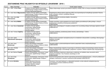 ZESTAWIENIE PRAC WŁASNYCH NA WYDZIALE LEKARSKIM - 2010 r. L.p. 1 2 3 4 5 6 7 8 9 10 11 12 Imię i Nazwisko Dr n. med. Tomasz Gach Jednostka I Katedra Chirurgii Ogólnej Uniwersytetu Jagiellońskiego Collegium Medicum Klinika Chirurgii Gastroenterologicznej Dr n. med. Marcin Migaczewski II Katedra Chirurgii Ogólnej Uniwersytetu Jagiellońskiego Collegium Medicum Klinika Chirurgii Endoskopowej II Katedra Chirurgii Ogólnej Uniwersytetu Dr n. med. Anna ZubJagiellońskiego Collegium Medicum Klinika Pokrowiecka Chirurgii Endoskopowej Dr n. med. Maciej Matłok II Katedra Chirurgii Ogólnej Uniwersytetu Jagiellońskiego Collegium Medicum Klinika Chirurgii Endoskopowej II Katedra Chirurgii Ogólnej Dr n. med. Marcin Dembiński Uniwersytetu Jagiellońskiego Collegium Medicum Klinika Chirurgii Ogólnej Lek. med. Tomasz Cegielny III Katedra Chirurgii Ogólnej Uniwersytetu Jagiellońskiego Collegium Medicum Klinika Chirurgii Ogólnej Instytut Stomatologii Lek. stom. Agata Uniwersytetu Jagiellońskiego Niżankowska-Jędrzejczyk Collegium Medicum Katedra i Zakład Ortodoncji Instytut Stomatologii Uniwersytetu Lek. stom. Anna Jagiellońskiego Collegium Medicum Zakład Bednarczyk Chirurgii Stomatologicznej Instytut Stomatologii Uniwersytetu Lek. stom. Wioletta Jagiellońskiego Collegium Medicum Zakład Bereziewicz Stomatologii Zintegrowanej Lek. med. Bartosz Frączek Katedra Anestezjologii i Intensywnej Terapii Uniwersytetu Jagiellońskiego Collegium Medicum Katedra Anestezjologii i Intensywnej Terapii Lek. med. Kinga Uniwersytetu Jagiellońskiego Collegium Szczepanek Medicum Dr Joanna Góralska Katedra Biochemii Klinicznej Uniwersytetu Jagiellońskiego Collegium Medicum Zakład Biochemii Klinicznej Tytuł i numer tematu Wpływ miejscowego wycięcia gruczolaków odbytnicy metodą TEM na funkcje anorektalne K/ZBW/000096 Endoskopowa ablacja plazmą argonową (APC) oraz laparoskopowa fundoplikacja sposobem Nissena (LNF) w leczeniu chorych z przełykiem Barretta K/ZBW/000564 Grelina w chorobie wrzodowej żołądka i dwunastnicy K/ZBW/000565 Analiza czynników ryzyka pojawienia się nowych polipów gruczolakowych jelita grubego u chorych poddawanych radykalnej endoskopowej polipektomii K/ZBW/000566 Wpływ leków poprawiających narządowy przepływ krwi na przebieg ostrego kamiczego zapalenia trzustki K/ZBW/000104 Leczenie powikłanej, przetokowej postaci choroby Leśniowskiego - Crohna K/ZBW/000443 Wpływ leczenia aparatami wewnątrztrzustnymi na metabolizm eikozanoidów w przebiegu obturacyjnego bezdechu sennego K/ZBW/000107 Usuwanie zębów a przeciwzakrzepowe leczenie preparatami kwasu acetylosalicylowego K/ZBW/000558 Wpływ indywidualnego programu muzycznego na obniżenie napięcia emocjonalnego podczas leczenia wielospecjalistycznego w stomatologii u pacjentów z wysokim i średnim stopniem lęku antycypacyjnego K/ZBW/000094 Jakość resustytacji Krążeniowo oddechowej w zależności od rozkładu czasu nauczania wśród studentów studentów I roku Wydziału Lekarskiego UJ CM K/ZBW/000568 Techniki bioimpedancji jako element optymalizacji płynoterapii okołooperacyjnej, u chorych poddawanych zabiegom resekcyjnym z powodu nowotworów jelita grubego K/ZBW/000125 Tworzenie i rola kropli lipidowych w odpowiedzi komórek na stres siateczki endoplazmatycznej na przykładzie komórek śródbłonka (HUVEC) K/ZBW/000577 1 13 14 15 16 17 18 19 20 21 22 23 Mgr Danuta Kowalczyk-Pachel Katedra Biochemii Lekarskiej Uniwersytetu Jagiellońskiego Collegium Medicum Zakład Biochemii Ogólnej Dr Grzegorz Zemanek Katedra Biochemii Lekarskiej Uniwersytetu Jagiellońskiego Collegium Medicum Zakład Chemii Fizjologicznej Dr Halina Jurkowska Katedra Biochemii Lekarskiej Uniwersytetu Jagiellońskiego Collegium Medicum, Zakład Biochemii Ogólnej Katedra Biochemii Lekarskiej Mgr Patrycja BronowickaUniwersytetu Jagiellońskiego Adamska Collegium Medicum, Zakład Chemii Fizjologicznej Dr n. med. Paweł Franczuk Katedra Chorób Wewnętrznych i Gerontologii Uniwersytetu Jagiellońskiego Collegium Medicum Klinika Chorób Wewnętrznych i Geriatrii Mgr Katarzyna Zawisza Katedra Epidemiologii i Medycyny Zapobiegawczej Uniwersytetu Jagiellońskiego Collegium Medicum, Zakład Socjologii Medycyny Mgr Renata Majewska Katedra Epidemiologii i Medycyny Zapobiegawczej Uniwersytetu Jagiellońskiego Collegium Medicum, Zakład Socjologii Medycyny Mgr inż. Katarzyna Kuś Katedra Farmakologii Uniwersytetu Jagiellońskiego Collegium Medicum Zakład Analizy Farmakologicznej Mgr Magdalena Sternak Katedra Farmakologii Uniwersytetu Jagiellońskiego Collegium Medicum Zakład Farmakologii Doświadczalnej Dr n. biol. Aneta Targosz Katedra Fizjologii Uniwersytetu Jagiellońskiego Collegium Medicum Pracownia Genetyki i Biologii Molekularnej Katedra Fizjologii Uniwersytetu Dr n. biol. Gracjana KrzysiekJagiellońskiego Collegium Mączka Medicum Pracownia Genetyki i Biologii Molekularnej Wpływ kwasu liponowego na aktywność dehydrofgenazy aldehydowej. Badania biochemiczne i farmakologiczne K/ZBW/000582 Modulowanie aktywacji komórek linii monocytarnej i działania TNFu a na komórki nowotworowe przez supermolekularne barwniki bis-azotowe K/ZBW/000423 Badanie mechanizmu hamowania proliferacji komórek nowotworowych mózgu w obecności zwiększonego poziomu siarki sulfanowej K/ZBW/000147 Aktywność układu enzymatycznego p-syntazy cystationinowej i y-cystationazy związanego z tworzeniem w tkankach siarkowodoru K/ZBW/000149 Ocena powikłań kardiologicznych występujących w trakcie leczenia raka piersi nowymi lekami onkologicznymi K/ZBW/000562 Metodologiczne aspekty pomiarów wpływu religijności na zdrowie osób starszych K/ZBW/000134 Wyodrębnienie grup ryzyka w chorobach nowotworowych w oparciu o czynniki zagrożeń i pomiar biomarkerów skutku przy zastosowaniu analizy skupień i drzew klasyfikacyjnych K/ZBW/000436 Badanie przeciwmiażdżycowego potencjału beta blokerów, ze szczególnym uwzględnieniem nebiwololu, na modelu eksperymentalnym miażd