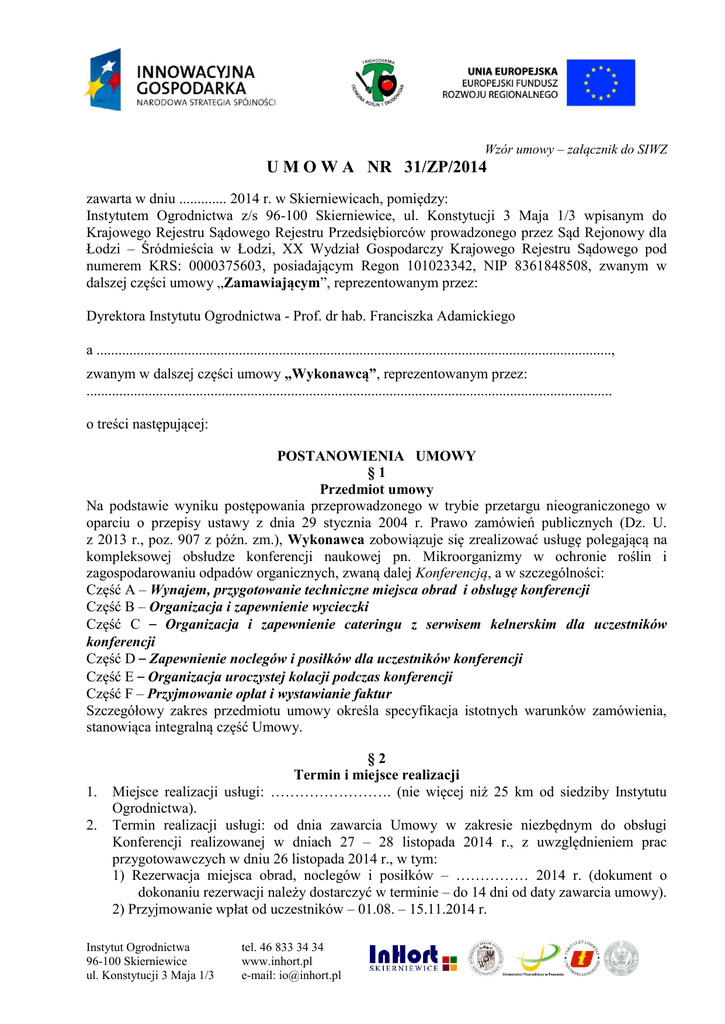 Wzór umowy – załącznik do SIWZ U M O W A NR 31/ZP/2014 zawarta w dniu ............. 2014 r. w Skierniewicach, pomiędzy: Instytutem Ogrodnictwa z/s 96-100 Skierniewice, ul. Konstytucji 3 Maja 1/3 wpisanym do Krajowego Rejestru Sądowego Rejestru Przedsiębiorców prowadzonego przez Sąd Rejonowy dla Łodzi – Śródmieścia w Łodzi, XX Wydział Gospodarczy Krajowego Rejestru Sądowego pod numerem KRS: 0000375603, posiadającym Regon 101023342, NIP 8361848508, zwanym w dalszej części umowy „Zamawiającym”, reprezentowanym przez: Dyrektora Instytutu Ogrodnictwa - Prof. dr hab. Franciszka Adamickiego a ............................................................................................................................................., zwanym w dalszej części umowy „Wykonawcą”, reprezentowanym przez: ................................................................................................................................................ o treści następującej: POSTANOWIENIA UMOWY §1 Przedmiot umowy Na podstawie wyniku postępowania przeprowadzonego w trybie przetargu nieograniczonego w oparciu o przepisy ustawy z dnia 29 stycznia 2004 r. Prawo zamówień publicznych (Dz. U. z 2013 r., poz. 907 z późn. zm.), Wykonawca zobowiązuje się zrealizować usługę polegającą na kompleksowej obsłudze konferencji naukowej pn. Mikroorganizmy w ochronie roślin i zagospodarowaniu odpadów organicznych, zwaną dalej Konferencją, a w szczególności: Część A – Wynajem, przygotowanie techniczne miejsca obrad i obsługę konferencji Część B – Organizacja i zapewnienie wycieczki Część C – Organizacja i zapewnienie cateringu z serwisem kelnerskim dla uczestników konferencji Część D – Zapewnienie noclegów i posiłków dla uczestników konferencji Część E – Organizacja uroczystej kolacji podczas konferencji Część F – Przyjmowanie opłat i wystawianie faktur Szczegółowy zakres przedmiotu umowy określa specyfikacja istotnych warunków zamówienia, stanowiąca integralną część Umowy. 1. 2. §2 Termin i miejsce realizacji Miejsce realizacji usługi: ……………………. (nie więcej niż 25 km od siedziby Instytutu Ogrodnictwa). Termin realizacji usługi: od dnia zawarcia Umowy w zakresie niezbędnym do obsługi Konferencji realizowanej w dniach 27 – 28 listopada 2014 r., z uwzględnieniem prac przygotowawczych w dniu 26 listopada 2014 r., w tym: 1) Rezerwacja miejsca obrad, noclegów i posiłków – …………… 2014 r. (dokument o dokonaniu rezerwacji należy dostarczyć w terminie – do 14 dni od daty zawarcia umowy). 2) Przyjmowanie wpłat od uczestników – 01.08. – 15.11.2014 r. Instytut Ogrodnictwa 96-100 Skierniewice ul. Konstytucji 3 Maja 1/3 tel. 46 833 34 34 www.inhort.pl e-mail: [email protected] 3) Wystawianie faktur dla uczestników - 01.08. – 28.11.2014 r. 4) Obsługa konferencji wraz z cateringiem – do dnia 28.11.2014 r. (włącznie). 1. 2. 3. 4. 5. 6. §3 Obowiązki Wykonawcy Wykonawca oświadcza, że dysponuje wiedzą i doświadczeniem oraz osobami i zapleczem technicznym do wykonania przedmiotu Umowy z należytą starannością, z uwzględnieniem standardów przyjętych w obsłudze konferencji naukowych, zgodnie z warunkami SIWZ. Wykonawca oświadcza, że przyjmuje do realizacji wszystkie obowiązki niezbędne do wykonania przedmiotu Umowy, wyszczególnione w SIWZ. Wykonawca zobowiązuje się w szczególności do: 1) Przekazania Zamawiającemu potwierdzenia zarezerwowania miejsca obrad wskazanego w ofercie Wykonawcy; 2) Zapewnienia w przedmiotowym miejscu obrad noclegów i posiłków dla wszystkich uczestników Konferencji (70-120 osób) za ceny jednostkowe ryczałtowe zaoferowane w ofercie; 3) Zorganizowania wycieczki do …………………………………………………………., 4) Informowania Zamawiającego o wszelkich trudnościach w wykonywaniu przez Wykonawcę przedmiotu umowy; 5) Obsługi technicznej sal i sprzętu multimedialnego; 6) Posprzątania i usunięcia śmieci po zakończeniu serwowania wyżywienia. Wykonawca ponosi pełną odpowiedzialność za ogólną i techniczną kontrolę nad wykonaniem przedmiotu Umowy. Wykonawca ponosi całkowitą odpowiedzialność za nadzór nad zatrudnionym personelem oraz zobowiązany jest do wypełnienia wszystkich prawnych zobowiązań związanych z zatrudnieniem personelu. Wykonawca oświadcza, że zapewnia nocleg w pokojach jedno, dwu, trzy i czteroosobowych z łazienkami oraz posiłki dla wszystkich uczestników konferencji, za ceny jednostkowe wskazane w ofercie dla uczestników ze strony Zamawiającego. §4 Podwykonawcy 1. Wykonawca może posługiwać się przy wykonywaniu przedmiotu umowy podwykonawcami w zakresie wskazanym w ofercie. 2. Za działania, uchybienia lub zaniechania podwykonawców Wykonawca ponosi odpowiedzialność jak za własne działania, uchybienia lub zaniechania. 3. Do zawarcia przez podwykonawcę umowy z dalszym podwykonawcą jest wymagana uprzednia pisemna zgoda obu Stron. 4. Zmiana podwykonawcy biorącego udział w realizacji zamówienia, z zasobów których Wykonawca korzystał wykazując spełnianie warunków udziału w postępowaniu, może nastąpić za zgodą Zamawiającego tylko w przypadku, gdy Wykonawca dodatkowo przedłoży wymagane na etapie postępowania o udzielenie zamówienia dokumenty, w których nowy podwykonawca wykaże spełnianie warunków w zakresie nie mniejszym niż wskazany w SIWZ. §5 Obowiązki Zamawiającego 1. Zamawiający zobowiązuje się do aktywnego współdziałania z Wykonawcą w trakcie realizacji przedmiotu Umowy, a w szczególności do: 1) opiniowania i udzielania wyjaśnień w terminie 2 dni od daty ich zgłoszenia, 2) przekazania listy uczestników Konferencji ze strony Zamawiającego w terminie 7 dni przed rozpoczęciem realizacji usługi. 2 1. §6 Wynagrodzenie i warunki płatności Zamawiający zobowiązuje się zapłacić za prawidłowo wykonany przedmiot umowy wynagrodzen
