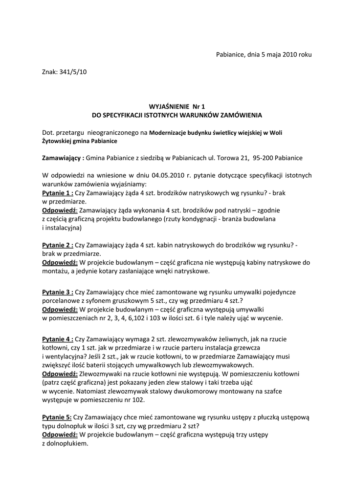 Pabianice, dnia 5 maja 2010 roku Znak: 341/5/10 WYJAŚNIENIE Nr