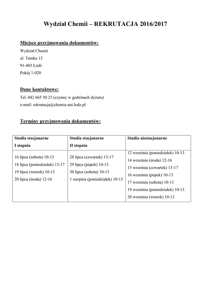 Wydział Chemii – REKRUTACJA 2016/2017 Miejsce przyjmowania dokumentów: Wydział Chemii ul. Tamka 12 91-403 Łódź Pokój 1-020 Dane kontaktowe: Tel. 042 665 50 23 (czynny w godzinach dyżuru) e-mail: [email protected] Terminy przyjmowania dokumentów: Studia stacjonarne Studia stacjonarne I stopnia II stopnia 16 lipca (sobota) 10-13 28 lipca (czwartek) 13-17 18 lipca (poniedziałek) 13-17 29 lipca (piątek) 10-13 19 lipca (wtorek) 10-13 30 lipca (sobota) 10-13 20 lipca (środa) 12-16 1 sierpnia (poniedziałek) 10-13 Studia niestacjonarne 12 września (poniedziałek) 10-13 14 września (środa) 12-16 15 września (czwartek) 13-17 16 września (piątek) 10-13 17 września (sobota) 10-13 19 września (poniedziałek) 10-13 20 września (wtorek) 10-13