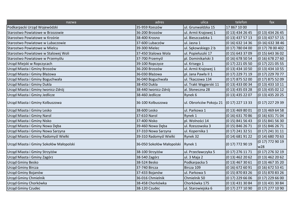 nazwa Podkarpacki Urząd Wojewódzki Starostwo Powiatowe w Brzozowie Starostwo Powiatowe w Krośnie Starostwo Powiatowe w Lubaczowie Starostwo Powiatowe w Mielcu Starostwo Powiatowe w Stalowej Woli Starostwo Powiatowe w Przemyśłu Urząd Miejski w Ropczycach Urząd Miasta i Gminy Brzozów Urząd Miasta i Gminy Błażowa Urząd Miasta i Gminy Boguchwała Urząd Miasta i Gminy Dukla Urząd Miasta i Gminy Iwonicz-Zdrój Urząd Miasta i Gminy Jedlicze adres 35-959 Rzeszów 36-200 Brzozów 38-400 Krosno 37-600 Lubaczów 39-300 Mielec 37-450 Stalowa Wola 37-700 Przemyśl 39-100 Ropczyce 36-200 Brzozów 36-030 Błażowa 36-040 Boguchwała 38-450 Dukla 38-440 Iwonicz-Zdrój 38-460 Jedlicze ulica ul. Grunwaldzka 15 ul. Armii Krajowej 1 ul. Bieszczadzka 1 ul. Jasna 1 ul. Sękowskiego 2 b ul. Popiełuszki 17 pl. Dominikaoski 3 ul. Krisego 1 ul. Armii Krajowej 1 pl. Jana Pawła II 1 ul. Tkaczowa 134 ul. Trakt Węgierski 11 al. Słoneczna 28 Rynek 6 telefon 17 867 10 00 (0 13) 434 26 45 (0 13) 437 57 13 (0 16) 632 14 36 (0 17) 780 04 00 (0 15) 643 37 09 (0 16) 678 50 54 (0 17) 221 05 50 (0 13) 434 10 50 (0 17) 229 71 19 (0 17) 875 52 00 (0 13) 433 00 34 (0 13) 435 03 28 (0 13) 435 22 07 (0 13) 434 26 45 (0 13) 437 57 15 (0-16) 632 38 46 (0 17) 78 00 402 (0 15) 643 36 02 (0 16) 678 27 60 (0 17) 221 05 55 (0 13) 434 10 55 (0 17) 229 70 77 (0 17) 875 52 09 (0 13) 433 10 11 (0 13) 435 02 12 (0 13) 435 20 25 Urząd Miasta i Gminy Kolbuszowa 36-100 Kolbuszowa ul. Obrooców Pokoju 21 (0 17) 227 13 33 (0 17) 227 29 39 Urząd Miasta i Gminy Lesko Urząd Miasta i Gminy Narol Urząd Miasta i Gminy Nisko Urząd Miasta i Gminy Nowa Dęba Urząd Miasta i Gminy Nowa Sarzyna Urząd Miasta i Gminy Radomyśl Wielki 38-600 Lesko 37-610 Narol 37-400 Nisko 39-460 Nowa Dęba 37-310 Nowa Sarzyna 39-310 Radomyśl Wielki ul. Parkowa 1 Rynek 1 pl. Wolności 14 ul. Rzeszowska 3 ul. Kopernika 1 Rynek 32 Urząd Miasta i Gminy Sokołów Małopolski 36-050 Sokołów Małopolski Rynek 1 (0 17) 772 90 19 Urząd Miasta i Gminy Strzyżów Urząd Miasta i Gminy Zagórz Urząd Gminy Besko Urząd Gminy Bircza Urząd Gminy Bojanów Urząd Gminy Chmielnik Urząd Gminy Chorkówka Urząd Gminy Czudec 38-100 Strzyżów 38-540 Zagórz 38-524 Besko 37-740 Bircza 37-433 Bojanów 36-016 Chmielnik 38-458 Chorkówka 38-120 Czudec (0 17) 276 11 71 (0 13) 462 20 62 (0 13) 467 30 61 (0 16) 672 60 91 (0 15) 870 83 26 (0 17) 229 66 06 (0 13) 431 30 84 (0 17) 277 10 90 (0 13) 469 64 58 (0 16) 631 71 04 (0 15) 841 56 30 (0 15) 846 26 71 (0 17) 241 31 11 (0 14) 680 70 63 (0 17) 772 90 19 w28 (0 17) 276 32 19 (0 13) 462 20 62 (0 13) 467 35 20 (0 16) 672 53 41 (0 15) 870 83 26 (0 17) 229 66 00 (0 13) 431 30 84 (0 17) 277 10 90 ul. Przecławczyka 5 ul. 3 Maja 2 Podkarpacka 5 Bircza 109 ul. Parkowa 5 Chmielnik 50 Chorkówka 175 ul. Starowiejska 6 (0 13) 469 80 01 (0 16) 631 70 86 (0 15) 841 56 43 (0 15) 846 26 71 (0 17) 241 32 51 (0 14) 681 91 22 fax Urząd Gminy Dębica 39-200 Dębica ul. Batorego 13 (0 14) 680 33 10 Urząd Gminy Domaradz 36-230 Domaradz Domaradz 345 (0 13) 434 70 51 Urząd Gminy Dzikowiec Urząd Gminy Harasiuki Urząd Gminy Iwierzyce Urząd Gminy Jarocin Urząd Gminy Jasło Urząd Gminy Jeżowe 36-122 Dzikowiec 37-413 Harasiuki 39-124 Iwierzyce 37-405 Jarocin 38-200 Jasło 37-430 Jeżowe Dzikowiec 2 Harasiuki 112a Iwierzyce 80 Jarocin 159 ul. Słowackiego 4 Jeżowe 136 A (0 17) 744 21 09 (0 15) 879 13 06 (0 17) 745 59 50 (0 15) 871 31 13 (0 13) 443 66 69 (0 15) 879 43 43 Urząd Gminy Jodłowa 39-225 Jodłowa Urząd Gminy Kołaczyce Urząd Gminy Korczyna Urząd Gminy Krasiczyn Urząd Gminy Laszki Urząd Gminy Leżajsk Urząd Gminy Lubenia Urząd Gminy Lutowiska Urząd Gminy Markowa Urząd Gminy Niwiska 38-213 Kołaczyce 38-420 Korczyna 37-741 Krasiczyn 37-543 Laszki 37-300 Leżajsk 36-042 Lubenia 38-713 Lutowiska 37-120 Markowa 36-147 Niwiska Rynek 1 Rynek 18A Krasiczyn 177 Laszki 36 ul. Opalioskiego 2 Lubenia 131 Lutowiska 14 Markowa 1399 Niwiska 430 (0 13) 446 02 21 (0 13) 435 40 80 (0 16) 671 83 70 (0 16) 628 50 46 (0 17) 240 62 00 (0 17) 850 39 14 (0 13) 461 00 13 (0 17) 226 54 35 (0 17) 227 90 02 Urząd Gminy Nowy Żmigród 38-230 Nowy Żmigród ul. Mickiewicza 2 (0 13) 441 56 05 Urząd Gminy Nozdrzec Urząd Gminy Ostrów Urząd Gminy Pawłosiów Urząd Gminy Pruchnik Urząd Gminy Przecław Urząd Gminy Pysznica 36-245 Nozdrzec 39-103 Ostrów 37-500 Jarosław 37-560 Pruchnik 39-320 Przecław 37-403 Pysznica Nozdrzec 224 Ostrów 225 Pawłosiów 88 Rynek 1 ul. Kilioskiego 7 ul. Wolności 277 (0 13) 439 80 20 (0 17) 223 57 16 (0 16) 622 02 48 (0 16) 628 80 24 (0 17) 581 31 19 (0 15) 841 00 04 (0 14) 680 33 36 (0 13) 434 70 41 w. 48 (0 17) 744 21 09 (0 15) 879 13 06 (0 17) 222 14 44 (0 15) 871 31 13 (0 13) 443 66 35 (0 15) 879 43 42 (0 14) 683 30 53 w10 (0 13) 446 02 58 (0 13) 435 40 96 (0 16) 671 83 70 (0 16) 628 50 23 (0 17) 242 84 17 (0 17) 850 39 14 (0 13) 461 02 34 (0 17) 226 57 56 (0 17) 227 93 41 (0 13) 441 56 05 w37 (0 13) 439 81 70 (0 17) 223 57 16 (0 16) 622 02 48 (0 16) 623 61 30 (0 17) 581 31 16 (0 15) 841 00 17 Urząd Gminy Radomyśl nad Sanem 37-455 Radomyśl nad Sanem Rynek Duży 7 (0 15) 845 43 02 (0 15) 845 43 02 Urząd Gminy Rokietnica Urząd Gminy Sanok Urząd Gminy Skołyszyn 37-562 Rokietnica 38-500 Sanok 38-242 Skołyszyn (0 16) 622 13 91 (0 13) 465 65 51 (0 13) 449 10 62, (0 16) 622 13 78 (0 13) 465 65 53 (0 13) 449 10 62 (0 14) 683 30 44 ul. Kościuszki 23 Skołyszyn 12 Urząd Gminy Stubno 37-723 Stubno Stubno 69A (0 16) 735 40 04 (0 16) 735 40 04 Urząd Gminy Tuszów Narodowy 39-332 Tuszów Narodowy Tuszów Narodowy 225 (0 17) 581 77 78 (0 17) 581 77 81 Urząd Gminy Tyrawa Wołoska Urząd Gminy Wiązownica Urząd Gminy Wojaszówka Urząd Gminy Zarszyn Urząd Gminy Żołynia 38-535 Tyrawa Wołoska 37-522 Wiązownica 38-471 Wojaszówka 38-530 Zarszyn 37-110 Żołynia (0 13) 462 11 23 (0 16) 622 36 31 (0 13) 438 50 16 (0 13) 467 10 01 (0 17) 224 30 28 (0 13) 462 11 23 (0 16) 622 36 31 (0 13) 438 50 16 (0 13) 467 10 38 