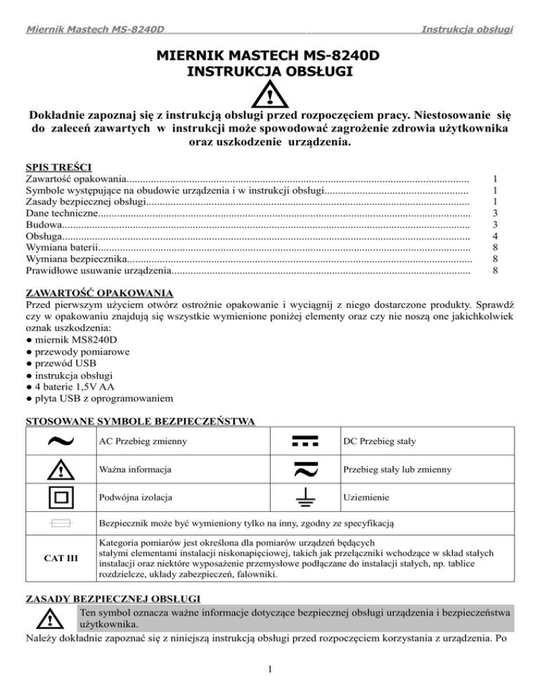 Miernik Mastech MS-8240D Instrukcja obsługi MIERNIK MASTECH MS-8240D INSTRUKCJA OBSŁUGI Dokładnie zapoznaj się z instrukcją obsługi przed rozpoczęciem pracy. Niestosowanie się do zaleceń zawartych w instrukcji może spowodować zagrożenie zdrowia użytkownika oraz uszkodzenie urządzenia. SPIS TREŚCI Zawartość opakowania.............................................................................................................................. Symbole występujące na obudowie urządzenia i w instrukcji obsługi..................................................... Zasady bezpiecznej obsługi....................................................................................................................... Dane techniczne......................................................................................................................................... Budowa...................................................................................................................................................... Obsługa...................................................................................................................................................... Wymiana baterii......................................................................................................................................... Wymiana bezpiecznika............................................................................................................................... Prawidłowe usuwanie urządzenia.............................................................................................................. 1 1 1 3 3 4 8 8 8 ZAWARTOŚĆ OPAKOWANIA Przed pierwszym użyciem otwórz ostrożnie opakowanie i wyciągnij z niego dostarczone produkty. Sprawdź czy w opakowaniu znajdują się wszystkie wymienione poniżej elementy oraz czy nie noszą one jakichkolwiek oznak uszkodzenia: ● miernik MS8240D ● przewody pomiarowe ● przewód USB ● instrukcja obsługi ● 4 baterie 1,5V AA ● płyta USB z oprogramowaniem STOSOWANE SYMBOLE BEZPIECZEŃSTWA AC Przebieg zmienny DC Przebieg stały Ważna informacja Przebieg stały lub zmienny Podwójna izolacja Uziemienie Bezpiecznik może być wymieniony tylko na inny, zgodny ze specyfikacją CAT III Kategoria pomiarów jest określona dla pomiarów urządzeń będących stałymi elementami instalacji niskonapięciowej, takich jak przełączniki wchodzące w skład stałych instalacji oraz niektóre wyposażenie przemysłowe podłączane do instalacji stałych, np. tablice rozdzielcze, układy zabezpieczeń, falowniki. ZASADY BEZPIECZNEJ OBSŁUGI Ten symbol oznacza ważne informacje dotyczące bezpiecznej obsługi urządzenia i bezpieczeństwa użytkownika. Należy dokładnie zapoznać się z niniejszą instrukcją obsługi przed rozpoczęciem korzystania z urządzenia. Po 1 Miernik Mastech MS-8240D Instrukcja obsługi przeczytaniu instrukcję należy zachować do późniejszego wykorzystania. ZAGROŻENIE: sygnalizuje warunki i czynności, które mogą powodować zagrożenie utraty zdrowia lub życia użytkownika. Informuje o sposobach zabezpieczenia się przed porażeniem prądem elektrycznym. UWAGA: sygnalizuje warunki i czynności, które mogą powodować uszkodzenie miernika, prowadzące do niedokładnych pomiarów (wskazań). ZAGROŻENIE! Dzieci To urządzenie nie jest zabawką! Dzieci pod żadnym pozorem nie mogą użytkować urządzeń elektrycznych bez nadzoru, ponieważ nie zdają sobie sprawy z potencjalnych zagrożeń. Należy pamiętać, aby urządzenia elektryczne i baterie przechowywane były w bezpiecznym i niedostępnym dla dzieci miejscu. W przypadku połknięcia należy natychmiast skontaktować się z lekarzem. Dziecko może udławić się w wyniku połknięcia drobnych elementów. ZAGROŻENIE! Bezpieczeństwo elektryczne ●Przed podłączeniem miernika do badanego obwodu sprawdź stan jego obudowy. Jeśli nosi jakiekolwiek znamiona uszkodzenia miernik nie może być używany. ●Nie doprowadzaj do miernika napięć powyżej 1000V DC lub 750V AC Rms. ●Zachowaj szczególną ostrożność przy pomiarach powyżej 60V DC lub 30V AC Rms. ●Nie dotykaj końcówek i gniazd pomiarowych podczas pomiaru. ●Nie wykonuj pomiarów mokrymi rękami oraz w miejscach o dużej wilgotności. ●Urządzenie przeznaczone jest do pracy tylko wewnątrz suchych pomieszczeń. ●Nie używaj miernika, gdy wskaźnik baterii sygnalizuje stan wyczerpania. Wskazania miernika mogą być nieprawdziwe, co grozi porażeniem prądem elektrycznym. ●Podczas pomiarów nie dotykaj części metalowych sond pomiarowych. Palce trzymaj powyżej izolacyjnych osłon tych sond. ●Pełna zgodność ze standardami bezpieczeństwa jest gwarantowana tylko, gdy używane są dostarczone w komplecie przewody pomiarowe. W wypadku uszkodzenia przewody powinny być wymienione na ten sam model lub przewody o takich samych parametrach elektrycznych. ●Nie używaj uszkodzonych przewodów pomiarowych. ●Osoba pracująca z miernikiem powinna być wypoczęta i świadoma podejmowanych działań. Niedopuszczalna jest praca pod wpływem alkoholu lub środków odurzających. Moment nierozwagi może doprowadzić do bardzo poważnych konsekwencji włączając w to także obrażenia lub zranienia. ●Nie używaj miernika w środowisku wybuchowym (gazy, opary). ●Nie używaj miernika, gdy jest uszkodzony, zdjęta jest jego obudowa lub są wymontowane jakieś części. ●Nie pozostawiaj urządzenia bez nadzoru. ●Wszelkie naprawy może wykonywać tylko wykwalifikowany personel. ●Niedopuszczalne są jakiekolwiek modyfikacje urządzenia. ●Miejsce pracy zawsze utrzymuj w czystości. Pracuj tylko w warunkach dobrego oświetlenia. Bałagan w miejscu pracy oraz złe oświetlenie mogą prowadzić do wypadku. UWAGA! ●Upewnij się, że ustawiłeś prawidłowy zakres pomiarowy. Nigdy nie przekraczaj wartości granicznych wielkości elektrycznych podanych dla każdego zakresu pomia
