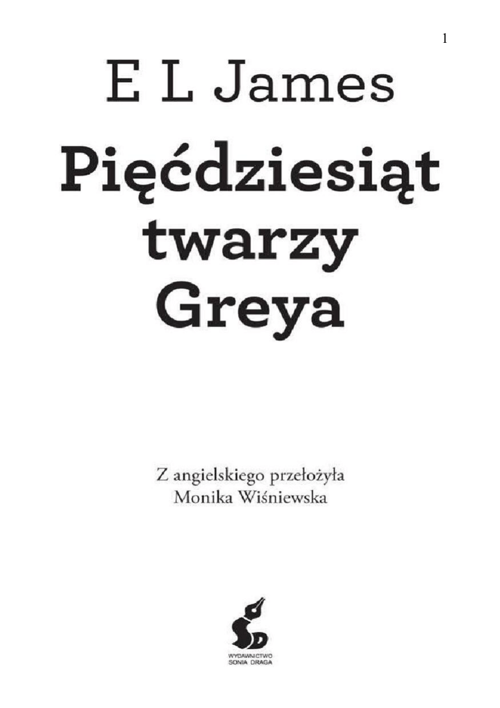 1 3 Trylogia „Pięćdziesiąt odcieni": Pięćdziesiąt twarzy Greya Ciemniejsza strona Greya Nowe oblicze Greya 4 Spis treści Dedykacja PODZIĘKOWANIA ROZDZIAŁ PIERWSZY ROZDZIAŁ DRUGI ROZDZIAŁ TRZECI ROZDZIAŁ CZWARTY ROZDZIAŁ PIĄTY ROZDZIAŁ SZÓSTY ROZDZIAŁ SIÓDMY ROZDZIAŁ ÓSMY ROZDZIAŁ DZIEWIĄTY ROZDZIAŁ DZIESIĄTY ROZDZIAŁ JEDENASTY ROZDZIAŁ DWUNASTY ROZDZIAŁ TRZYNASTY ROZDZIAŁ CZTERNASTY ROZDZIAŁ PIĘTNASTY ROZDZIAŁ SZESNASTY ROZDZIAŁ SIEDEMNASTY ROZDZIAŁ OSIEMNASTY ROZDZIAŁ DZIEWIĘTNASTY ROZDZIAŁ DWUDZIESTY ROZDZIAŁ DWUDZIESTY PIERWSZY ROZDZIAŁ DWUDZIESTY DRUGI ROZDZIAŁ DWUDZIESTY TRZECI ROZDZIAŁ DWUDZIESTY CZWARTY ROZDZIAŁ DWUDZIESTY PIĄTY ROZDZIAŁ DWUDZIESTY SZÓSTY Przypisy 5 Dla Nialla, pana mojego wszechświata 6 PODZIĘKOWANIA Dziękuję następującym osobom za pomoc i wsparcie: Mojemu mężowi, Niallowi, za tolerowanie mojej obsesji, zajmowanie się domem i pierwszą redakcję tekstu. Mojej szefowej, Lisie, za wytrzymanie ze mną przez ostatni rok, kiedy ogarnięta byłam tym całym szaleństwem. CCL - nie zdradzę, kim jesteś, ale dziękuję Ci. Oryginalnym wsparcie. „bunker babes" za przyjaźń i nieustanne SR - za wszystkie przydatne rady od samego początku. Sue Malone za zrobienie ze mną porządku. Amandzie i całej ekipie TWCS za przyjęcie zakładu. 7 ROZDZIAŁ PIERWSZY Patrzę w lustro i krzywię się. Do diaska z tymi włosami, zupełnie się nie chcą układać. I do diaska z Katherine Kavanagh, która się rozchorowała i każe mi teraz przez to przechodzić. „Nie mogę się kłaść z mokrymi włosami. Nie mogę się kłaść z mokrymi włosami". Recytując to niczym mantrę, jeszcze raz próbuję podporządkować je szczotce. Wzdycham z irytacją i przyglądam się bladej szatynce z niebieskimi oczami, zbyt dużymi w stosunku do całej twarzy. Szatynka odpowiada mi gniewnym spojrzeniem. Poddaję się. Mogę jedynie związać niesforne włosy w koński ogon i mieć nadzieję, że jakoś się będę prezentować. Kate to moja współlokatorka i akurat dzisiaj musiała dopaść ją grypa, jakby nie mogła w jakikolwiek inny dzień. Dlatego też nie jest w stanie przeprowadzić od dawna zaplanowanego wywiadu dla gazety studenckiej z jakimś megapotężnym potentatem przemysłowym, o którym nigdy nie słyszałam. Zgodziłam się więc zrobić to za nią. Muszę zakuwać do egzaminów końcowych, dokończyć pracę pisemną, no a po południu powinnam pojawić się w pracy, ale nie dzisiaj pokonam dwieście sześćdziesiąt kilometrów do centrum Seattle, aby się spotkać z tym tajemniczym prezesem Grey Enterprises Holdings Inc. Czas owego wybitnego przedsiębiorcy i głównego dobroczyńcy naszej uczelni jest niezwykle cenny znacznie cenniejszy niż mój - niemniej jednak zgodził się udzielić Kate wywiadu. Nie lada osiągnięcie, tak twierdzi moja współlokatorka. Te jej przeklęte zajęcia dodatkowe. Kate siedzi skulona na kanapie w salonie. - Ana, tak mi przykro. Dziewięć miesięcy zabiegałam o ten wywiad. Sześć kolejnych potrwa ustalanie nowego terminu, 8 a do tego czasu obie zdążymy skończyć studia. Jako redaktor naczelna nie mogę tego skopać. Proszę - chrypi błagalnie. Jak ona to robi? Nawet chora ślicznie wygląda: jasnorude włosy są nienaganne, a zielone oczy błyszczące, choć nieco zaczerwienione i załzawione. Ignoruję przypływ niepożądanego współczucia. - Oczywiście, że pojadę, Kate. A ty wracaj do łóżka. Przynieść ci nyquil albo tylenol? - Nyquil. Tu masz pytania i dyktafon. Wystarczy, że wciśniesz przycisk nagrywania, o tutaj. Rób notatki, ja wszystko spiszę. - Kompletnie nic o nim nie wiem - burczę, bez powodzenia próbując stłumić rosnącą panikę. - Pytania cię poprowadzą. Jedź już. To długa trasa. Nie chcę, żebyś się spóźniła. - No dobra, jadę. Kładź się do łóżka. Ugotowałam zupę, później ją sobie odgrzej. - Patrzę na nią z czułością. Robię to, Kate, tylko dla ciebie. - Dobrze. Powodzenia. I dziękuję ci. Jak zawsze ratujesz mi życie. Biorę torbę na ramię, uśmiecham się cierpko do Kate, po czym schodzę do samochodu. Nie mogę uwierzyć, że dałam się na to namówić. No ale przecież Kate jest w czymś takim mistrzynią. Będzie z niej świetna dziennikarka. Jest elokwentna, zdecydowana, przekonująca, śliczna - no i to moja najlepsza przyjaciółka. Na drogach panuje niewielki ruch. Wyjeżdżam z Vancouver w stanie Waszyngton i kieruję się w stronę Portland i autostrady I-5. Jest jeszcze wcześnie, a w Seattle muszę być dopiero na drugą. Na szczęście Kate pożyczyła mi swojego sportowego mercedesa 9 CLK. Nie jestem pewna, czy Wanda, mój stary garbus, dałaby radę dowieźć mnie na czas. Merca fajnie się prowadzi, a kilometry uciekają jeden za drugim, gdy wciskam pedał gazu. Celem mojej podróży jest centrala globalnego przedsiębiorstwa pana Greya. To olbrzymi, dwudziestopiętrowy biurowiec, cały ze szkła i stali, funkcjonalna fantazja architekta. Nad szklanymi drzwiami metalowe litery tworzą dyskretny napis „Grey House". Na miejsce docieram kwadrans przed drugą. Uff, nie spóźniłam się. Ogarnięta uczuciem ulgi wchodzę do ogromnego - i, szczerze mówiąc, onieśmielającego - holu ze szkła, stali i białego piaskowca. Siedząca za biurkiem z litego piaskowca bardzo atrakcyjna, zadbana młoda blondynka uśmiecha się do mnie uprzejmie. Ma na sobie najbardziej szykowną grafitową marynarkę i białą koszulę, jakie w życiu widziałam. Wygląda jak spod igły. - Mam umówione spotkanie z panem Greyem. Anastasia Steele w zastępstwie Katherine Kavanagh. - Chwileczkę, panno Steele. Unosi lekko brew, a ja stoję przed nią skrępowana. Zaczynam żałować, że nie pożyczyłam od Kate eleganckiej marynarki, żeby ją włożyć zamiast granatowego palta. W sumie się postarałam i przywdziałam swoją jedyną spódnicę, brązowe kozaki do kolan oraz niebieski sweter. Dla mnie taki strój jest elegan