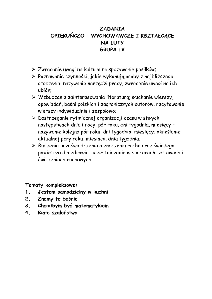 ZADANIA OPIEKUŃCZO – WYCHOWAWCZE I KSZTAŁCĄCE NA LUTY GRUPA IV Zwracanie uwagi na kulturalne spożywanie posiłków; Poznawanie czynności, jakie wykonują osoby z najbliższego otoczenia, nazywanie narzędzi pracy, zwrócenie uwagi na ich ubiór; Wzbudzanie zainteresowania literaturą: słuchanie wierszy, opowiadań, baśni polskich i zagranicznych autorów, recytowanie wierszy indywidualnie i zespołowo; Dostrzeganie rytmicznej organizacji czasu w stałych następstwach dnia i nocy, pór roku, dni tygodnia, miesięcy – nazywanie kolejno pór roku, dni tygodnia, miesięcy; określanie aktualnej pory roku, miesiąca, dnia tygodnia; Budzenie przeświadczenia o znaczeniu ruchu oraz świeżego powietrza dla zdrowia; uczestniczenie w spacerach, zabawach i ćwiczeniach ruchowych. Tematy kompleksowe: 1. Jestem samodzielny w kuchni 2. Znamy te baśnie 3. Chciałbym być matematykiem 4. Białe szaleństwa Piosenka do nauki "KUCHARECZKI" 1. Co to za zapachy do nosków wędrują? To panie kucharki obiad nam gotują. Pewnie będą dzisiaj wspaniałe placuszki, dzieci będą zjadać i lizać paluszki. ref.: Bo gotować dobra rzecz, zdrowo no i smacznie, każdy z nas też chciałby być kuchareczką właśnie. (bis) 2. W dużym garnku woda kipi i paruje zaraz w nim się pyszna zupka ugotuje. Kuchareczka wrzuca mięsko i warzywka, sól, przyprawy, wszystko już chowa pokrywka. ref.: Bo gotować dobra rzecz, zdrowo no i smacznie, każdy z nas też chciałby być kuchareczką właśnie. (bis) Wiersz do nauki Śnieżki Śniegu całe mieszki Czas się bawić w śnieżki Ulep Jasiu ulep Śnieżno – białą kulę Są na śniegu dzieci Rzuć kulą, niech leci Kula poleciała Za kołnierz Michała Michał kuli szukał Śmiał się do rozpuku Znalazł za kołnierzem Topniejący śnieg Dla rozgrzewki skoczył Sam kulę utoczył Rzucił śnieżna kulę Trafił w kaptur Julę Jula szuka kuli Marszczy i się kuli Śmiech dzwoni, śnieg świeci Weselą się dzieci Jula na kapturze Ze śniegu ma różę A to wszystko dała Zima śnieżnobiała