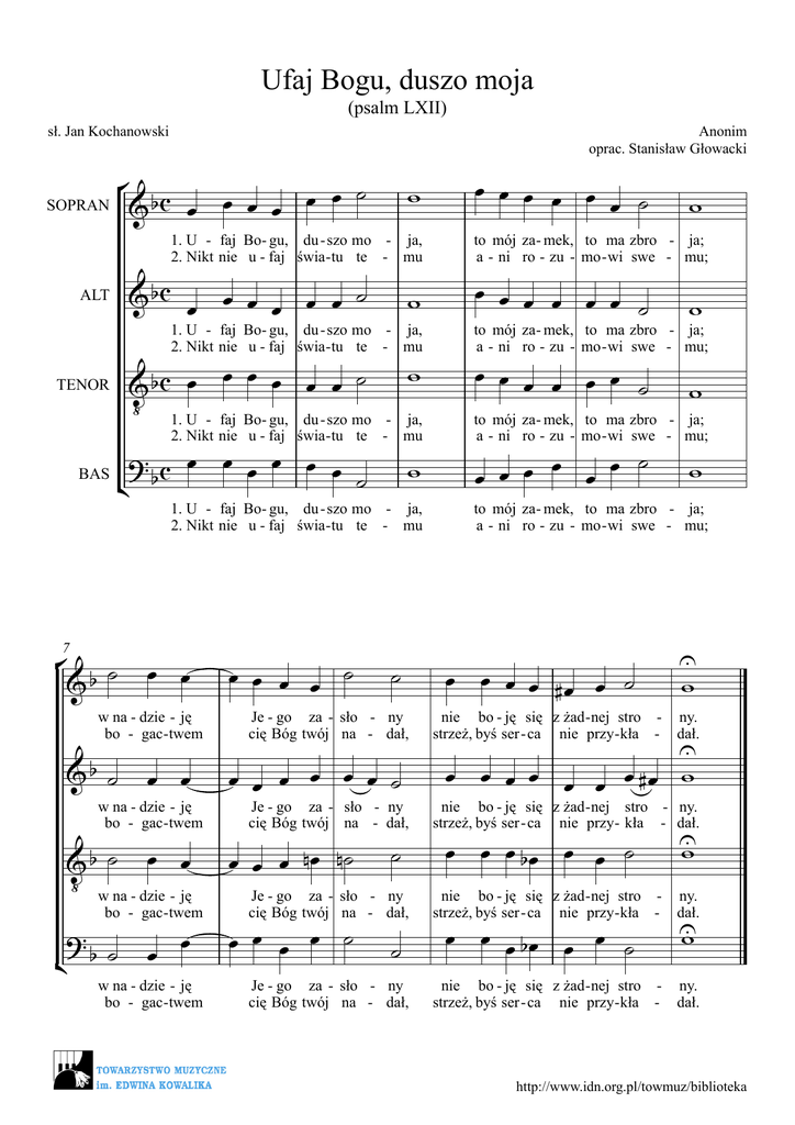 Ufaj Bogu, duszo moja (psalm LXII) sł. Jan Kochanowski SOPRAN Anonim oprac. Stanisław Głowacki ° ˙ & bc œ œ œ œ œ œ w 1. U - faj Bo- gu, du - szo mo - ja, 2. Nikt nie u - faj świa - tu te - mu & bc œ œ œ œ œ œ ˙ to mój za - mek, to ma zbro - ja; a - ni ro - zu - mo - wi swe - mu; w œ œ œ œ œ œ ˙ w œ œ œ œ œ ˙ & bc œ ‹ 1. U - faj Bo- gu, du - szo mo w œ œ œ œ œ œ ˙ w œ œ ˙ œ œ œ œ w ALT 1. U - faj Bo- gu, du - szo mo - ja, 2. Nikt nie u - faj świa - tu te - mu TENOR 7 1. U - faj Bo- gu, du - szo mo - ja, 2. Nikt nie u - faj świa - tu te - mu to mój za - mek, to ma zbro - ja; a - ni ro - zu - mo - wi swe - mu; œ œ w na - dzie - ję bo - gac - twem &b ˙ œ œ w na - dzie - ję bo - gac - twem &b ˙ œ œ ‹ w na - dzie - ję ? bo - gac - twem ¢ b˙ œ to mój za - mek, to ma zbro - ja; a - ni ro - zu - mo - wi swe - mu; to mój za - mek, to ma zbro - ja; a - ni ro - zu - mo - wi swe - mu; ? c œ œ œ œ œ œ ˙ ¢ b ° ˙ &b w - ja, - mu 2. Nikt nie u - faj świa - tu te BAS œ œ œ œ œ œ ˙ œ w na - dzie - ję bo - gac - twem œ œ œ œ ˙ w ˙ Je - go za - sło - ny cię Bóg twój na - dał, œ œ œ œ œ œ ˙ œ œ œ œ #œ œ ˙ U w nie bo - ję się z żad - nej stro - ny. strzeż, byś ser - ca nie przy - kła - dał. U œ œ œ œ œ œ œ #œ w Je - go za - sło - ny cię Bóg twój na - dał, nie bo - ję się z żad - nej stro - ny. strzeż, byś ser - ca nie przy - kła - dał. Je - go za - sło - ny cię Bóg twój na - dał, nie bo - ję się z żad - nej stro - ny. strzeż, byś ser - ca nie przy - kła - dał. œ œ œ nœ n˙ œ œ œ œ ˙ ˙ ˙ Je - go za - sło - ny cię Bóg twój na - dał, œ œ œ bœ œ œ ˙ œ œ œ bœ œ œ ˙ U w U w nie bo - ję się z żad - nej stro - ny. strzeż, byś ser - ca nie przy - kła - dał. http://www.idn.org.pl/towmuz/biblioteka