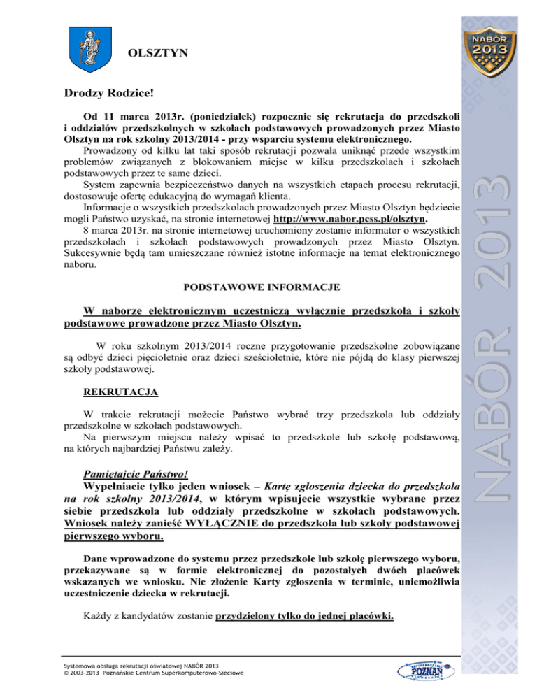 OLSZTYN Drodzy Rodzice! Od 11 marca 2013r. (poniedziałek) rozpocznie się rekrutacja do przedszkoli i oddziałów przedszkolnych w szkołach podstawowych prowadzonych przez Miasto Olsztyn na rok szkolny 2013/2014 - przy wsparciu systemu elektronicznego. Prowadzony od kilku lat taki sposób rekrutacji pozwala uniknąć przede wszystkim problemów związanych z blokowaniem miejsc w kilku przedszkolach i szkołach podstawowych przez te same dzieci. System zapewnia bezpieczeństwo danych na wszystkich etapach procesu rekrutacji, dostosowuje ofertę edukacyjną do wymagań klienta. Informacje o wszystkich przedszkolach prowadzonych przez Miasto Olsztyn będziecie mogli Państwo uzyskać, na stronie internetowej http://www.nabor.pcss.pl/olsztyn. 8 marca 2013r. na stronie internetowej uruchomiony zostanie informator o wszystkich przedszkolach i szkołach podstawowych prowadzonych przez Miasto Olsztyn. Sukcesywnie będą tam umieszczane również istotne informacje na temat elektronicznego naboru. PODSTAWOWE INFORMACJE W naborze elektronicznym uczestniczą wyłącznie przedszkola i szkoły podstawowe prowadzone przez Miasto Olsztyn. W roku szkolnym 2013/2014 roczne przygotowanie przedszkolne zobowiązane są odbyć dzieci pięcioletnie oraz dzieci sześcioletnie, które nie pójdą do klasy pierwszej szkoły podstawowej. REKRUTACJA W trakcie rekrutacji możecie Państwo wybrać trzy przedszkola lub oddziały przedszkolne w szkołach podstawowych. Na pierwszym miejscu należy wpisać to przedszkole lub szkołę podstawową, na których najbardziej Państwu zależy. Pamiętajcie Państwo! Wypełniacie tylko jeden wniosek – Kartę zgłoszenia dziecka do przedszkola na rok szkolny 2013/2014, w którym wpisujecie wszystkie wybrane przez siebie przedszkola lub oddziały przedszkolne w szkołach podstawowych. Wniosek należy zanieść WYŁĄCZNIE do przedszkola lub szkoły podstawowej pierwszego wyboru. Dane wprowadzone do systemu przez przedszkole lub szkołę pierwszego wyboru, przekazywane są w formie elektronicznej do pozostałych dwóch placówek wskazanych we wniosku. Nie złożenie Karty zgłoszenia w terminie, uniemożliwia uczestniczenie dziecka w rekrutacji. Każdy z kandydatów zostanie przydzielony tylko do jednej placówki. Systemowa obsługa rekrutacji oświatowej NABÓR 2013 © 2003-2013 Poznańskie Centrum Superkomputerowo-Sieciowe Rodzice dzieci sześcioletnich (rocznik 2007) muszą podjąć decyzję czy wysłać dziecko od 1 września 2013r. do pierwszej klasy, czy odłożyć moment rozpoczęcia edukacji w szkole jeszcze o rok. Rodzice dzieci sześcioletnich, którzy zdecydują się zapisać dziecko do klasy pierwszej szkoły podstawowej, mają do dyspozycji odrębny moduł w naborze „Szkoła podstawowa 2013”, a w nim przydatne informacje i dokumenty. Na stronie internetowej Ośrodka Rozwoju Edukacji www.ore.edu.pl w zakładce „Sześciolatek w szkole” rodzice znajdą informacje pomocne w podjęciu decyzji o edukacji szkolnej sześciolatka. Rodzice dzieci urodzonych w 2007 roku wypełniają: 1) Kartę zgłoszenia dziecka do przedszkola na rok szkolny 2013/2014, jeżeli dziecko w roku szkolnym 2013/2014 uczęszczać będzie do przedszkola lub oddziału przedszkolnego w szkole podstawowej, lub 2) Zgłoszenie do szkoły podstawowej, jeżeli dziecko w roku szkolnym 2013/2014 ma rozpocząć naukę w klasie pierwszej szkoły podstawowej. Warunkiem przyjęcia dziecka do szkoły będzie fakt objęcia dziecka w roku szkolnym 2012/2013 rocznym przygotowaniem przedszkolnym. Krok po kroku poruszania się po systemie elektronicznym: otworzyć stronę internetową – http://www.nabor.pcss.pl/olsztyn, wybrać moduł „Przedszkole”, otworzyć i wypełnić wniosek ze swoją listą preferencji, wydrukować wypełniony wniosek i go podpisać, zanieść wniosek do przedszkola lub szkoły pierwszego wyboru, Po wypełnieniu wniosku drogą elektroniczną zostanie automatycznie wygenerowany numer PIN, dzięki któremu będziecie mogli Państwo sprawdzić, czy dziecko otrzymało miejsce w wybranym przedszkolu lub oddziale przedszkolnym w szkole podstawowej. WAŻNE!!! Aktualny będzie numer PIN wygenerowany po wypełnieniu ostatniej wersji wniosku. Rodzice, którzy ręcznie wypełnili wniosek i złożyli go w przedszkolu lub szkole pierwszego wyboru, otrzymają także numer PIN (w przedszkolu lub szkole pierwszego wyboru, w którym go złożą), aby móc sprawdzić wynik rekrutacji dotyczący ich dziecka. UWAGA!!! Wniosek wypełniony tylko w Internecie, a nie zaniesiony do przedszkola lub szkoły podstawowej posiadającej oddział przedszkolny, nie bierze udziału w rekrutacji. Systemowa obsługa rekrutacji oświatowej NABÓR 2013 © 2003-2013 Poznańskie Centrum Superkomputerowo-Sieciowe Wniosek – Karta zgłoszenia dziecka do przedszkola na rok szkolny 2013/2014 – zawiera następujące dane: numer i adres przedszkola lub oddziału przedszkolnego w szkole podstawowej pierwszego wyboru, dane osobowe dziecka wraz z numerem PESEL, który identyfikuje dziecko, adres zamieszkania dziecka ze wskazaniem Gminy, adres zameldowania dziecka, jeśli jest inny niż adres zamieszkania, informacje dodatkowe, w tym informacje o dziecku, liczbę posiłków, z których będzie korzystało dziecko, godziny pobytu dziecka w przedszkolu, kolejne preferowane placówki, w przypadku gdyby dziecko nie otrzymało miejsca w placówce pierwszego wyboru, zapis dziecka do klasy pierwszej szkoły podstawowej na rok szkolny 2013/2014, który wypełniają wyłącznie rodzice dzieci 5 i 6-letnich (informacja o obwodach szkół dostępna jest na stronie www.nabor.pcss.pl/olsztyn w zakładce „Dokumenty”), potwierdzenie zakładów pracy rodziców, że pracują, telefon kontaktowy do rodziców, własnoręczny podpis rodziców/prawnych opiekunów. Ważne daty: 8 marca 2013r. zostanie uruchomiony informator internetowy o przedszkolach i szkołach podstawowych www.nabor.pcss.pl/olsztyn , od 11 marca do 11 kwietnia 2013r. rodzic