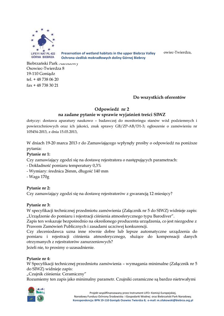ZNAK SPRAWY: GB/ZP-AB/D1-3 Preservation of wetland habitats in the upper Biebrza Valley dn. 20 marca 2013r. Ochrona siedlisk mokradłowych doliny Górnej Biebrzy Osowiec-Twierdza, Biebrzański Park Narodowy Osowiec-Twierdza 8 19-110 Goniądz tel. + 48 738 06 20 fax + 48 738 30 21 Do wszystkich oferentów Odpowiedź nr 2 na zadane pytanie w sprawie wyjaśnień treści SIWZ dotyczy: dostawa aparatury naukowo – badawczej do monitoringu stanów wód podziemnych i powierzchniowych oraz ich jakości, znak sprawy GB/ZP-AB/D1-3; ogłoszenie o zamówieniu nr 105454-2013, z dnia 15.03.2013, W dniach 19-20 marca 2013 r do Zamawiającego wpłynęły prośby o odpowiedź na poniższe pytania: Pytanie nr 1: Czy zamawiający zgodzi się na dostawę rejestratora o następujących parametrach: - Dokładność pomiaru temperatury 0,3% - Wymiary: średnica 26mm, długość 140 mm - Waga 170g Pytanie nr 2: Czy zamawiający zgodzi się na dostawę rejestratorów z gwarancją 12 miesięcy? Pytanie nr 3: W specyfikacji technicznej przedmiotu zamówienia (Załącznik nr 5 do SIWZ) widnieje zapis: „Urządzenie do pomiaru i rejestracji ciśnienia atmosferycznego typu Barodiver”. Zapis ten wskazuje bezpośrednio na określonego producenta urządzenia, co jest niezgodne z Prawem Zamówień Publicznych i zasadami uczciwej konkurencji. Czy zleceniodawca uzna inne równie dobre lub lepsze automatyczne urządzenia do pomiaru i rejestracji ciśnienia atmosferycznego, służące do kompensacji danych otrzymanych z rejestratorów zanurzeniowych? Jeżeli nie, to prosimy o uzasadnienie. Pytanie nr 4: W Specyfikacji technicznej przedmiotu zamówienia – wymagania minimalne (Załącznik nr 5 do SIWZ) widnieje zapis: „Czujnik ciśnienia: Ceramiczny” Rozumiemy ten zapis jako minimalny parametr. Czujniki ceramiczne są bardzo nietrwałymi Projekt współfinansowany przez Instrument LIFE+ Komisji Europejskiej, Narodowy Fundusz Ochrony Środowiska i Gospodarki Wodnej oraz Biebrzański Park Narodowy. Korespondencja: BPN 19-110 Goniądz Osowiec Twierdza 8; e-mail: [email protected] elementami (łatwo ulegają uszkodzeniom mechanicznym). Niektórzy producenci zrezygnowali z czujników ceramicznych na rzecz np. czujników ze materiału zwanego Hastelloy, który jest bardziej odporny na korozję, wykazuje większą stabilność odczytów, a w stosunku do ceramiki i nie jest materiałem, który może się potłuc lub łatwo uszkodzić. Czy Zleceniodawca uwzględni inne czujniki które, są lepsze od ceramicznych? Nie uwzględnienie lepszych urządzeń dostępnych na rynku może być traktowane jako niegospodarne dysponowanie środkami publicznymi i ograniczające konkurencję do określonych producentów produkujących urządzenia z sensorami ceramicznymi. Pytanie nr 5: W Specyfikacji technicznej przedmiotu zamówienia – wymagania minimalne (Załącznik nr 5 do SIWZ) widnieje zapis: „Wymiary: średnica nie większa niż 22 mm, długość nie większa niż 100 mm” „Waga: nie przekraczająca 80g” Zapis takich parametrów w istotny sposób ogranicza konkurencje. Wymiary urządzenia, poza średnicą nie mają z istotnego znaczenia dla instalacji, pracy i dokładności pomiaru tych urządzeń. Technologicznym parametrem ograniczającym instalację tych urządzeń w punktach pomiarowych (piezometry, rury pomiarowe, studnie, źródliska) jest tylko parametr średnicy. Długość rejestratorów większa np. o 60 mm i waga większa o 50g nie mają technicznego i naukowego ograniczenia w momencie zawieszania tych urządzeń w piezometrach lub innych miejscach gdzie dokonywane są pomiary wahań zwierciadła wody. Linki na których się zawiesza te produkty mają standardowo wytrzymałość powyżej 100kg. Objętość wody jaka jest wyparta przez delikatnie większe urządzenie jest parametrem nie istotnym w środowisku hydrogeologicznym i wód powierzchniowych. Tak zawężenie parametrów eliminuje możliwość wzięcia udziału innym przedsiębiorstwom w tym przetargu. Parametry techniczne powinny posiadać taki margines, który nie ogranicza konkurencji co do jednego produktu, określonego producenta na rynku światowym i polskim, a w tym przypadku tak jest. Czy Zleceniodawca jest w stanie zaakceptować urządzenia o wymiarach: średnica 22 mm, wysokość 160 mm oraz waga 130 g? Jeżeli nie to prosimy o techniczne i naukowe wyjaśnienie ograniczenia. Pytanie nr 6: Czy Zamawiający dopuszcza dostawę rejestratorów z czujnikiem ciśnienia wykonanym ze stali nierdzewnej. Pytanie nr 7: Czy Zamawiający dopuszcza dostawę rejestratorów wahania poziomu i temperatury wody do długości 21 cm? Pytanie nr 8: Czy Zamawiający dopuszcza dostawę towaru o wadze około 150 gram? Odpowiedź na pytanie nr 1, 5, 7 i 8 : Zamawiający dopuszcza dostawę rejestratorów o długości i wadze większej niż podane w Załączniku 5 do SIWZ, tj. długość 100mm i waga 80g. Zamawiający nie godzi się na dostawę rejestratorów o większej średnicy i o mniejszej Projekt współfinansowany przez Instrument LIFE+ Komisji Europejskiej, Narodowy Fundusz Ochrony Środowiska i Gospodarki Wodnej oraz Biebrzański Park Narodowy. Korespondencja: BPN 19-110 Goniądz Osowiec Twierdza 8; e-mail: [email protected] dokładności niż podanej w Załączniku 5 do SIWZ, tj. średnica nie większa niż 22 mm i dokładność pomiaru temperatury 0,2ºC lub wyższa. Odpowiedź na pytanie nr 2: Nie, Zamawiający nie zgodzi się na dostawę rejestratorów z gwarancją 12 miesięcy. Zamawiający wymaga aby okres gwarancji trwał co najmniej 36 (trzydzieści sześć) miesięcy. Odpowiedź na pytanie nr 3: Zamawiający uzna równie dobre lub lepsze automatyczne urządzenia do pomiaru i rejestracji ciśnienia atmosferycznego, służące do kompensacji danych otrzymanych z rejestratorów. Odpowiedź na pytanie nr 4 i 6: Zapis „Czujnik ciśnienia: Ceramiczny” jest wymaganiem minimalnym i Zamawiający uwzględni oferty na urządzenia do pomiaru i rejestracji poziomu i t