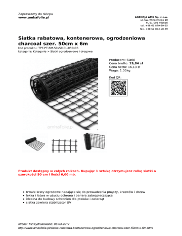 Zapraszamy do sklepu www.amkafolie.pl AGENCJA AMK Sp. z o.o. ul. Św. Wincentego 10 PL 61-003 Poznań tel. +48 61 879-99-25 fax. +48 61 853-28-49 Siatka rabatowa, kontenerowa, ogrodzeniowa charcoal szer. 50cm x 6m kod produktu: TPT-PT-RM-50x50-CL-050x06 kategoria: Kategorie > Siatki ogrodzeniowe i drogowe Producent: Siatki Cena brutto: 19,84 zł Cena netto: 16,13 zł Waga: 1.05kg Kod QR: Produkt dostępny w całych rolkach. Kupując 1 sztukę otrzymujesz rolkę siatki o szerokości 50 cm i ilości 6,00 mb. trwałe kraty ogrodowe nadające się do prowadzenia pnączy, krzewów i drzew lekka i łatwa w użyciu ochrona i bariera zabezpieczająca idealna do budowy schronień dla ptaków i zwierząt siatka zawiera stabilizator UV strona: 1/2 wydrukowano: 08-03-2017 http://www.amkafolie.pl/siatka-rabatowa-kontenerowa-ogrodzeniowa-charcoal-szer-50cm-x-6m.html Zastosowanie pnącza, zwierzęta i drób, ogrodzenia, drzewa Kolor Skład Wymiary rolki Wymiary oczek Waga g/m² Waga rolki charcoal (węgiel drzewny) PCV z surowców po recyklingu 50cm x 6m 50mm x 50 mm 350 g/m² (+/-5%) 1,05 kg strona: 2/2 wydrukowano: 08-03-2017 http://www.amkafolie.pl/siatka-rabatowa-kontenerowa-ogrodzeniowa-charcoal-szer-50cm-x-6m.html