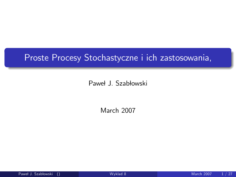 Proste Procesy Stochastyczne i ich zastosowania, Pawe÷J. Szab÷ owski March 2007 Pawe÷J. Szab÷ owski () Wyklad 8 March 2007 1 / 27 Funkcja kowariancji Theorem (Herglotz’a) Zespolona funkcja K okre´slona na zbiorze liczb ca÷ kowitych jest funkcja¾ kowariancji L2 -procesu wtedy i tylko wtedy, gdy istnieje sko´nczona miara µ na B[ π, π ] taka, · ze: K (n ) = Z π exp(inu )d µ(u ) π dla wszystkich ca÷ kowitych n. Proof. Oznaczmy: GN (x ) = Pawe÷J. Szab÷ owski () 1 2πN N ∑ exp ( jix ) exp ( jkx )K (i k) . k ,i =1 Wyklad 8 March 2007 2 / 27 Funkcja kowariancji Proof. Z nieujemnej określoności funkcji K wynika, z·e GN (x ) 0 dla N 1 i x 2 R. ¾ Zauwaz·my, z·e exp ( jix ) exp ( jkx ) = exp ( jx (i k )) . Moz·na wiec zmienić indeksy sumowania wprowadzajac ¾ m = i k Dostaniemy wówczas: GN (x ) = = Pawe÷J. Szab÷ owski () 1 2πN 1 2πN N 1 ∑ exp( jxm )K (m ) m = N +1 ∑ 1 f(k ,i ):k i =m g N 1 ∑ (N m = N +1 Wyklad 8 jmj) exp( jxm)K (m) . March 2007 3 / 27 Funkcja kowariancji Proof. Rozwaz·my miary µN określone na < Z π π π, π > z gestościami ¾ GN . Mamy: exp(jnx )d µN (x ) Z N 1 π 1 = exp(jnx ) exp( jxm )dx (N jmj) K (m) ∑ 2πN m = N +1 π ( n 1 jNj K (n) dla jn j < N = . 0 dla pozosta÷ ych n Pawe÷J. Szab÷ owski () Wyklad 8 March 2007 4 / 27 Funkcja kowariancji Proof. Rπ π, π >) = K (0) . Rodzina miar n o ¾ ciasna a wiec ¾ istnieje podciag ¾ µN i tych miar zbiez·ny fµN gN 1 jest wiec (s÷ abo) do pewnej miary µ. Gdy N zbiega do nieskończoności wzd÷ uz· podciagu ¾ fNi g , to dostaniemy: Ponadto mamy π GN dx = µN (< Z π exp(jnx )d µ (x ) = K (n). π Na odwrót, gdy K (n) ma powyz·sza¾ reprezentacje z miara¾ µ to dostajemy: m ∑ zk zi K (nk k ,i ni ) = Z π m ∑ zi exp (jni x ) 2 d µ (x ) 0 π i =1 Uogólnieniem tego twierdzenia jest nastepuj ¾ ace ¾ : Pawe÷J. Szab÷ owski () Wyklad 8 March 2007 5 / 27 Funkcja kowariancji Theorem (Bochnera) Funkcja K okre´slona na R, ciag÷ ¾ a w poczatku ¾ osi jest funkcja¾ kowariancji pewnego stacjonarnego L2 -procesu wtedy i tylko wtedy, gdy istnieje sko´nczona miara µ na R taka, · ze: 8t 2 R : K (t ) = Pawe÷J. Szab÷ owski () Z ∞ ∞ Wyklad 8 exp(itx )d µ(x ). March 2007 6 / 27 Przestrzeń Hilberta De…nition Niech H bedzie ¾ przestrzenia¾ wektorowa¾ nad C. Funkcja h : H nazywa sie¾ forma¾ hermitowska¾ , gdy: H !C 1. 8 y 2 H h (., y ) jest forma¾ liniowa¾ , tzn. h(λ1 x + λ2 z, y ) = λ1 h(z1 , y ) + λ2 h(z2 , y ) dla wszystkich x, y , z 2 H i λ1 , λ2 2 C . 2. 8 x, y 2 H : h(y , x ) = h(x, y ) . Fact Warunki 1 i 2 mówia¾ , · ze h (x, y ) jest forma¾ antyliniowa¾ , tzn. np., · ze h(x, λy ) = λ̄h(x, y ) λ 2 C, x, y 2 H. De…nition Forma hermitowska jest nieujemna, gdy: 3. 8x 2 H : h(x, x ) Pawe÷J. Szab÷ owski () 0 Wyklad 8 March 2007 7 / 27 Przestrzeń Hilberta De…nition Forma hermitowska nazywa sie¾ iloczynem skalarnym, gdy jest nieujemna i gdy: (h(x, x ) = 0) () (x = 0). Proposition Prawdziwe sa¾ nastepuj ¾ ace ¾ w÷ asno´sci form hermitowskich nieujemnych h. Nierówno´s´c Schwarza: Niech h bedzie ¾ forma¾ hermitowska¾ nieujemna¾ na H. Wtedy jh(x, y )j2 Pawe÷J. Szab÷ owski () h(x, x )h(y , y ), 8x, y 2 H. Wyklad 8 March 2007 8 / 27 Przestrzeń Hilberta Proposition Nierówno´s´c Mi´nkowskiego. Niech h bedzie ¾ forma¾ hermitowska¾ nieujemna¾ na H. Wtedy x ! p (x ) := h1/2 (x, x ) jest pó÷ norma¾ tzn.: p (x + y ) p (x ) + p (y ). Formu÷ a polaryzacji. Dla dowolnej formy hermitowskiej zachodzi wzór: 4h(x, y ) = h(x + y , x + y ) h (x +ih(x + iy , x + iy ) Pawe÷J. Szab÷ owski () Wyklad 8 y, x ih(x y) iy , x iy ). March 2007 9 / 27 Przestrzeń Hilberta De…nition Proposition Wzór równoleg÷ oboku. Dla dowolnej formy hermitowskiej zachodzi wzór: h (x + y , x + y ) + h (x y, x y ) = 2(h (x, x ) + h (y , y )). Corollary Niech h bedzie ¾ forma¾ hermitowska¾ na H. Niech No = fx 2 H : h(x, x ) = 0g i niech N bedzie ¾ podprzestrzenia¾ liniowa¾ zawarta¾ w No . Wtedy h (x, y ) = 0 dla x, y 2 N. Pawe÷J. Szab÷ owski () Wyklad 8 March 2007 10 / 27 Przestrzeń Hilberta Fact Odtad ¾ warto´sci funkcjona÷ u h bedziemy ¾ oznaczali (., .) (lub czasami <, > tzn. h (x, y ) = (x, y ) (lub h(x, y ) =< x, y >) za´s norme¾ w H bedziemy ¾ 1/2 oznaczali k.k tzn. (x, x ) = k.k . De…nition Niech H bedzie ¾ przestrzenia¾ wektorowa¾ nad cia÷ em liczb zespolonych z iloczynem skalarnym i norma¾ k.k zde…niowana¾ przez ten iloczyn skalarny. Jeśli H jest zupe÷ na wzgledem ¾ k.k , to nazywa sie¾ przestrzenia¾ Hilberta. Theorem (o rzucie na zbiór wypuk÷ y): Niech W bedzie ¾ domknietym ¾ zbiorem wypuk÷ ym w przestrzeni Hilberta (H, ( , )). Wtedy W zawiera dok÷ adnie jeden element xo o najmniejszej normie. Dok÷ adniej, istnieje jedyny element xo 2 W taki, · ze kx0 k = inf x 2W kx k Pawe÷J. Szab÷ owski () Wyklad 8 March 2007 11 / 27 Przestrzeń Hilberta Proof. Istnienie: Niech m = inf x 2W kx k i niech fxn g 2 W , kxn k ! m gdy n ! ∞ . Z wypuk÷ ości zbioru W wynika, z·e .5(xn + xk ) 2 W , a wiec. ¾ oboku wynika, z·e kxn + xk k 2m. Z nierówności równoleg÷ 0 xk k2 = 2 kxn k2 + kxk k2 kxn kxn + xk k2 ! 0 n,k !∞ bo odjemna da¾z·y do 4m2 , i odjemnik do 4m2 . Zatem ciag ¾ fxn g jest zbiez·ny. Poniewaz· zbiór W jest domkniety, ¾ wiec ¾ xn ! xo 2 W . Na skutek ciag÷ ¾ ości normy mamy kx0 k = lim kxn k = m . Jednoznaczno´s´c: Niech x bedzie ¾ jakimkolwiek elementem zbioru W takim, z·e kx k = m . Znów z wypuk÷ ości W mamy: .5(xo + x ) 2 W , tzn. kx0 + x k 2m . Ale 2m = kx k + kx0 k czyli - kxo k + kx k kx0 + x k . Jak wiemy, ma to jednak miejsce jedynie wtedy, gdy x = axo , gdzie a 0. Wiec ¾ a = 1, czyli x = xo Pawe÷J. Szab÷ owski () Wyklad 8 March 2007 12 / 27 Przestrzeń Hilberta Theorem (o rzucie prostopad÷ ym). Niech M bedzie ¾ podprzestrzenia¾ domkniet ¾ a¾ przestrzeni Hilberta (H, (., .)). Wtedy 1 2 3 Ka· zdy wektor x 2 H ma jedyny rozk÷ ad x = x M + x ? , gdzie M ? x 2 M, x jest pro