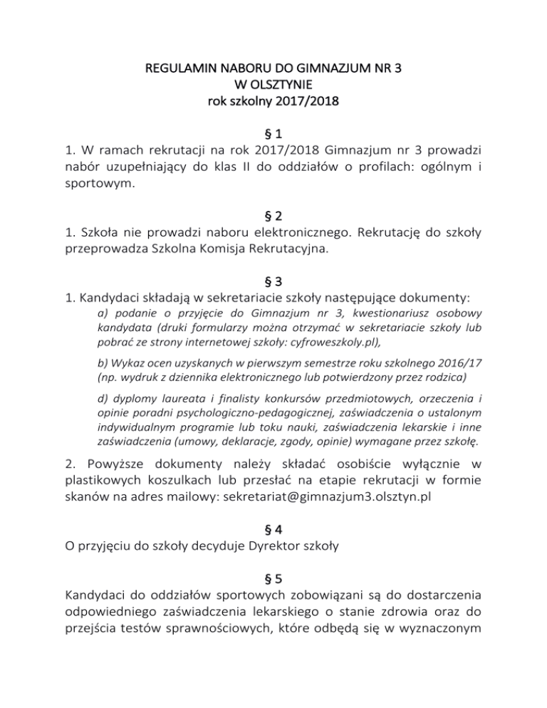 REGULAMIN NABORU DO GIMNAZJUM NR 3 W OLSZTYNIE rok szkolny 2017/2018 §1 1. W ramach rekrutacji na rok 2017/2018 Gimnazjum nr 3 prowadzi nabór uzupełniający do klas II do oddziałów o profilach: ogólnym i sportowym. §2 1. Szkoła nie prowadzi naboru elektronicznego. Rekrutację do szkoły przeprowadza Szkolna Komisja Rekrutacyjna. §3 1. Kandydaci składają w sekretariacie szkoły następujące dokumenty: a) podanie o przyjęcie do Gimnazjum nr 3, kwestionariusz osobowy kandydata (druki formularzy można otrzymać w sekretariacie szkoły lub pobrać ze strony internetowej szkoły: cyfroweszkoly.pl), b) Wykaz ocen uzyskanych w pierwszym semestrze roku szkolnego 2016/17 (np. wydruk z dziennika elektronicznego lub potwierdzony przez rodzica) d) dyplomy laureata i finalisty konkursów przedmiotowych, orzeczenia i opinie poradni psychologiczno-pedagogicznej, zaświadczenia o ustalonym indywidualnym programie lub toku nauki, zaświadczenia lekarskie i inne zaświadczenia (umowy, deklaracje, zgody, opinie) wymagane przez szkołę. 2. Powyższe dokumenty należy składać osobiście wyłącznie w plastikowych koszulkach lub przesłać na etapie rekrutacji w formie skanów na adres mailowy: [email protected] §4 O przyjęciu do szkoły decyduje Dyrektor szkoły §5 Kandydaci do oddziałów sportowych zobowiązani są do dostarczenia odpowiedniego zaświadczenia lekarskiego o stanie zdrowia oraz do przejścia testów sprawnościowych, które odbędą się w wyznaczonym terminie. Informacja na stronie: (cyfroweszkoly.pl) oraz każdy kandydat zostanie powiadomiony o terminie mailowo. 2. Wszystkie sprawy sporne wynikłe w trakcie przeprowadzania rekrutacji rozstrzyga dyrektor szkoły. §6 Nieodebrane dokumenty osób nie będących uczniami szkoły przechowuje się do 30 września 2017 r. Po tym terminie szkoła dokonuje zniszczenia nieodebranych dokumentów.