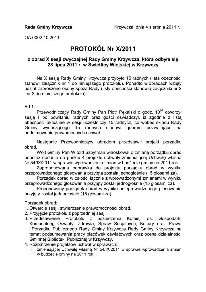 Rada Gminy Krzywcza Krzywcza, dnia 4 sierpnia 2011 r. OA.0002.10.2011 PROTOKÓŁ Nr X/2011 z obrad X sesji zwyczajnej Rady Gminy Krzywcza, która odbyła się 28 lipca 2011 r. w Świetlicy Wiejskiej w Krzywczy Na X sesję Rady Gminy Krzywcza przybyło 15 radnych (lista obecności stanowi załącznik nr 1 do niniejszego protokołu). Ponadto w obradach wzięły udział zaproszone osoby spoza Rady (listy obecności stanowią załączniki nr 2 i nr 3 do niniejszego protokołu). Ad 1. Przewodniczący Rady Gminy Pan Piotr Pękalski o godz. 1007 otworzył sesję i po powitaniu radnych oraz gości oświadczył, iż zgodnie z listą obecności aktualnie w sesji uczestniczy 15 radnych, co wobec składu Rady Gminy wynoszącego 15 radnych stanowi quorum pozwalające na podejmowanie prawomocnych uchwał. Następnie Przewodniczący obradom przedstawił projekt porządku obrad. Wójt Gminy Pan Witold Szpytman wnioskował o zmianę porządku obrad poprzez dodanie do punktu 4 projektu uchwały zmieniającej Uchwałę własną Nr 54/IX/2011 w sprawie wprowadzenia zmian w budżecie gminy na 2011 rok. Zaproponowana poprawka do projektu porządku obrad w wyniku przeprowadzonego głosowania przyjęta została jednogłośnie (15 głosami za). Porządek obrad w całości łącznie z wprowadzonymi zmianami w wyniku przeprowadzonego głosowania przyjęty został jednogłośnie (15 głosami za). Proponowany porządek obrad w wyniku przeprowadzonego głosowania przyjęty został jednogłośnie (15 głosami za). Porządek obrad: 1. Otwarcie sesji, stwierdzenie prawomocności obrad, 2. Przyjęcie protokołu z poprzedniej sesji, 3. Przedstawienie Protokołu z posiedzenia Komisji ds. Gospodarki Komunalnej, Oświaty, Zdrowia, Spraw Socjalnych, Kultury oraz Prawa i Porządku Publicznego Rady Gminy Krzywcza Rady Gminy Krzywcza na temat podsumowania pracy placówek oświatowych oraz ocena działalności Gminnej Biblioteki Publicznej w Krzywczy. 4. Rozpatrzenie projektów uchwał w sprawach: - zmieniającej Uchwałę własną Nr 54/IX/2011 w sprawie wprowadzenia zmian w budżecie gminy na 2011 rok, 2 - - zmieniająca uchwałę własną w sprawie upoważnienia Wójta Gminy Krzywcza do zaciągania zobowiązań w zakresie podejmowania inwestycji o wartości przekraczającej granicę ustaloną w budżecie na 2011 r., nadania Statutu Gminnej Bibliotece Publicznej w Krzywczy, przyjęcia nieruchomości (cerkwi w Krzywczy). 5. Sprawozdanie z działalności Wójta w okresie międzysesyjnym, 6. Interpelacje i zapytania radnych, 7. Wolne wnioski i informacje, 8. Zakończenie obrad. Ad 2. Protokół Nr X/2011 z obrad poprzedniej sesji został wyłożony do wglądu wraz z informacją, aby ewentualne wnioski i zastrzeżenia zgłaszać do końca sesji. Jeśli takich nie będzie, zostanie to uznane jako przyjęcie protokołu. Ad 3. Przystępując do realizacji punktu 3 obrad Przewodniczący Rady Gminy Pan Piotr Pękalski oddał głos Przewodniczącej Komisji ds. Gospodarki Komunalnej, Oświaty, Zdrowia, Spraw Socjalnych, Kultury oraz Prawa i Porządku Publicznego Rady Gminy Krzywcza Pani Agacie Wolarz, która przedstawiła protokół z posiedzenia tejże Komisji z dnia 11 lipca 2011 r. poświęconego podsumowaniu pracy placówek oświatowych oraz oceny działalności Gminnej Biblioteki Publicznej w Krzywczy. Radny Pan Wacław Sobol powiedział – Byłem na tej Komisji. Nie przypominam sobie, żeby był przedstawiany porządek obrad. Być może, że się mylę. Proszę o sprawdzenie zapisu. Jeśli się nie mylę, to czy obrady takiej Komisji są ważne? Wydaje mi się, że nie był przedstawiony program. Nie był zatwierdzony. Komisja obradowała. Czy te obrady są ważne? Prosiłbym, aby jeżeli ja się nie mylę, to żeby wypowiedział się na ten temat Radca Prawny. Pan Wójt poprosił o doprecyzowanie wniosku. Radny Pan Wacław Sobol powiedział – Komisja była rozpoczęta i wydaje mi się, nie jestem pewny, trzeba sprawdzić w zapisie, że nie był przedstawiony i zatwierdzony porządek obrad Komisji. Czy obrady takiej Komisji są ważne? Pan Przewodniczący Rady powiedział - Sprawdzone zostanie nagranie z Komisji a następnie ewentualnie skonsultujemy to z Radcą Prawnym i wówczas udzielimy Radnemu stosownej odpowiedzi. Radny Pan Wacław Sobol dodał – To nie jest mój prywatny interes w tym, tylko nasz wszystkich. 3 Pan Wójt nawiązując do przedstawionego protokołu odniósł się do kwestii dowozu dzieci do szkół. Po analizie i konsultacjach z przedstawicielami innych Gmin pod względem wykupienia biletów i przewozów wykonywanych za efektywny kilometr, przynajmniej na rok szkolny 2011/2012 będzie prawdopodobnie przygotowana dokumentacja przetargowa uwzględniająca stawki za efektywny kilometr. Wprowadzenie na terenie Gminy Krzywcza biletów miesięcznych będzie dużym ryzykiem dlatego, że tam gdzie są gminy podmiejskie, gdzie tych podmiotów jest więcej, gdzie te kursy są regularne to tego typu rozwiązanie jest dużo łatwiejsze. W Gminie Krzywcza wioski są oddalone i dlatego są problemy z dojazdami do niektórych przystanków. Na temat oszczędności sporządzono analizę. Jeśli będzie konkurencja i będą podmioty, które będą chciały przystąpić do biletów miesięcznych to, możemy mieć pewne zyski. Natomiast, gdy przystąpimy do biletów i tylko jeden podmiot przystąpi do tego przetargu to może się okazać, że Gmina zamiast zyskać dużo straci. Jeśli się nie wprowadzi w tym roku to można to zrobić w następnych latach. Obecnie – Jak powiedział Pan Wójt – Urząd Marszałkowski zwraca za wszystkie bilety, od wszystkich dzieci. Pan Wójt poinformował również, że obowiązkiem Gminy jest dowóz dzieci w klasach od I – III, jeśli odległość przekracza 3 km, a wyższe klasy jeśli przekracza 4 km. Jednak – jak zaznaczył Pan Wójt – autobusami tymi jeżdżą również dzieci, które mieszkają w odległości krótszej. Przewoźnik nie ma obiekcji i zabiera te dzieci, ponieważ 