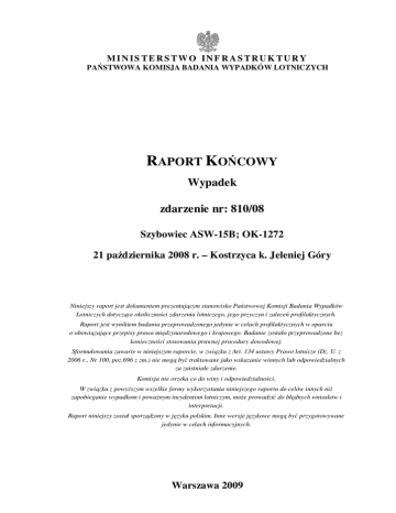 MI NIS TE RS TWO INF RAS TRUK TURY PAŃSTWOWA KOMISJA BADANIA WYPADKÓW LOTNICZYCH RAPORT KOŃCOWY Wypadek zdarzenie nr: 810/08 Szybowiec ASW-15B; OK-1272 21 października 2008 r. – Kostrzyca k. Jeleniej Góry Niniejszy raport jest dokumentem prezentującym stanowisko Państwowej Komisji Badania Wypadków Lotniczych dotyczące okoliczności zdarzenia lotniczego, jego przyczyn i zaleceń profilaktycznych. Raport jest wynikiem badania przeprowadzonego jedynie w celach profilaktycznych w oparciu o obowiązujące przepisy prawa międzynarodowego i krajowego. Badanie zostało przeprowadzone bez konieczności stosowania prawnej procedury dowodowej. Sformułowania zawarte w niniejszym raporcie, w związku z Art. 134 ustawy Prawo lotnicze (Dz. U. z 2006 r., Nr 100, poz.696 z zm.) nie mogą być traktowane jako wskazanie winnych lub odpowiedzialnych za zaistniałe zdarzenie. Komisja nie orzeka co do winy i odpowiedzialności. W związku z powyższym wszelkie formy wykorzystania niniejszego raportu do celów innych niż zapobieganie wypadkom i poważnym incydentom lotniczym, może prowadzić do błędnych wniosków i interpretacji. Raport niniejszy został sporządzony w języku polskim. Inne wersje językowe mogą być przygotowywane jedynie w celach informacyjnych. Warszawa 2009 Państwowa Komisja Badania Wypadków Lotniczych Szybowiec ASW-15B, OK-1272, data 21.10.2008 r. Kostrzyca k. Jeleniej Góry SPIS TREŚCI Informacje ogólne ......................................................................................................................................... 3 Streszczenie................................................................................................................................................... 3 1. INFORMACJE FAKTYCZNE ............................................................................................................. 5 1.1. Historia lotu.................................................................................................................................... 5 1.2. Obrażenia osób............................................................................................................................... 5 1.3. Uszkodzenia statku powietrznego .................................................................................................. 5 1.4. Inne uszkodzenia ............................................................................................................................ 6 1.5. Informacje o składzie osobowym (dane o załodze) ....................................................................... 6 1.6. Informacje o statku powietrznym................................................................................................... 6 1.7. Informacje meteorologiczne........................................................................................................... 7 1.8. Pomoce nawigacyjne...................................................................................................................... 7 1.9. Łączność......................................................................................................................................... 7 1.10. Informacje o miejscu zdarzenia ................................................................................................... 8 1.11. Rejestratory pokładowe................................................................................................................ 8 1.12. Informacje o szczątkach i zderzeniu ............................................................................................ 8 1.13. Informacje medyczne ................................................................................................................... 8 1.14. Pożar............................................................................................................................................. 8 1.15. Czynniki przeżycia....................................................................................................................... 8 1.16. Badania i ekspertyzy .................................................................................................................... 9 1.17. Informacje o organizacjach i działalności administracyjnej ........................................................ 9 1.18. Informacje uzupełniające ............................................................................................................. 9 1.19. Specjalne metody badań............................................................................................................. 10 2. ANALIZA ........................................................................................................................................... 10 2.1. Poziom wyszkolenia .................................................................................................................... 10 2.2. Przebieg zdarzenia ....................................................................................................................... 10 2.3. Organizacja i przebieg lotów ....................................................................................................... 11 3. WNIOSKI KOŃCOWE ...................................................................................................................... 11 3.1. Ustalenia komisji.......................................................................................................................... 11 3.2. Przyczyny wypadku ..................................................................................................................... 12 4. ZALECENIA PROFILAKTYCZNE .................................................................................................. 12 5. ZAŁĄCZNIKI..................................................................................................................................... 12 RAPORT KOŃCOWY Strona 2 z 12 Państwowa Komisja Badania Wypadków Lotniczych Szybo