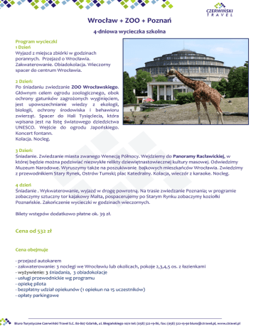 Wrocław + ZOO + Poznań 4-dniowa wycieczka szkolna Program wycieczki 1 Dzień Wyjazd z miejsca zbiórki w godzinach porannych. Przejazd o Wrocławia. Zakwaterowanie. Obiadokolacja. Wieczorny spacer do centrum Wrocławia. 2 Dzień: Po śniadaniu zwiedzanie ZOO Wrocławskiego. Głównym celem ogrodu zoologicznego, obok ochrony gatunków zagrożonych wyginięciem, jest upowszechnianie wiedzy z ekologii, biologii, ochrony środowiska i behawioru zwierząt. Spacer do Hali Tysiąclecia, która wpisana jest na listę światowego dziedzictwa UNESCO. Wejście do ogrodu Japońskiego. Koncert fontann. Kolacja. Nocleg. 3 Dzień: Śniadanie. Zwiedzanie miasta zwanego Wenecją Północy. Wejdziemy do Panoramy Racławickiej, w której będzie można podziwiać niezwykłe relikty dziewiętnastowiecznej kultury masowej. Odwiedzimy Muzeum Narodowe. Wyruszymy także na poszukiwanie bajkowych mieszkańców Wrocławia. Zwiedzimy z przewodnikiem Stary Rynek, Ostrów Tumski; plac Katedralny. Kolacja, wieczór z karaoke. Nocleg. 4 dzień Śniadanie . Wykwaterowanie, wyjazd w drogę powrotną. Na trasie zwiedzanie Poznania; w programie zobaczymy sztuczny tor kajakowy Malta, pospacerujemy po Starym Rynku zobaczymy koziołki Poznańskie. Zakończenie wycieczki w godzinach wieczornych. Bilety wstępów dodatkowo płatne ok. 39 zł. Cena od 532 zł Cena obejmuje - przejazd autokarem - zakwaterowanie: 3 noclegi we Wrocławiu lub okolicach, pokoje 2,3,4,5 os. z łazienkami - wyżywienie: 3 śniadania, 3 obiadokolacje - usługi przewodnickie wg programu - opiekę pilota - bezpłatny udział opiekunów (1 opiekun na 15 uczestników) - opłaty parkingowe Wrocław + ZOO + Poznań 4-dniowa wycieczka szkolna - podstawowe leki - ubezpieczenie NNW - podatek VAT UWAGA: Podana cena dotyczy wycieczki z Gdańska. Przy wyjeździe z innych miejscowości koszt wycieczki może ulec zmianie. Kolejność zwiedzanych obiektów może ulec zmianie. Podany program jest programem ramowym. Jesteśmy elastyczni pod kątem cenowym jak i programowym.