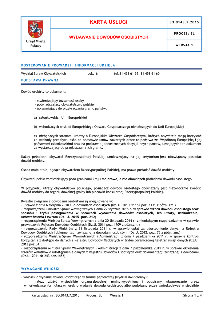 KARTA USŁUGI Urząd Miasta Puławy WYDAWANIE DOWODÓW OSOBISTYCH SO.0143.7.2015 PROCES: EL WERSJA 1 P O S T Ę P O W A N I E P R O W A D Z I I I N F O R M AC J I U D Z I E L A Wydział Spraw Obywatelskich pok.16 tel.81 458 61 59, 81 458 61 60 P O D S T AW A P R A W N A Dowód osobisty to dokument: - stwierdzający tożsamość osoby - poświadczający obywatelstwo polskie - uprawniający do przekraczania granic państw: a) członkowskich Unii Europejskiej b) wchodzących w skład Europejskiego Obszaru Gospodarczego nienależących do Unii Europejskiej c) niebędących stronami umowy o Europejskim Obszarze Gospodarczym, których obywatele mogą korzystać ze swobody przepływu osób na podstawie umów zawartych przez te państwa ze Wspólnotą Europejską i jej państwami członkowskimi oraz na podstawie jednostronnych decyzji innych państw, uznających ten dokument za wystarczający do przekraczania ich granic. Każdy pełnoletni obywatel Rzeczypospolitej Polskiej zamieszkujący na jej terytorium jest obowiązany posiadać dowód osobisty. Osoba małoletnia, będąca obywatelem Rzeczypospolitej Polskiej, ma prawo posiadać dowód osobisty. Obywatel polski zamieszkujący poza granicami kraju ma prawo, a nie obowiązek posiadania dowodu osobistego. W przypadku utraty obywatelstwa polskiego, posiadacz dowodu osobistego obowiązany jest niezwłocznie zwrócić dowód osobisty do organu dowolnej gminy lub placówki konsularnej Rzeczypospolitej Polskiej. Kwestie związane z dowodami osobistymi są uregulowane w: - ustawie z dnia 6 sierpnia 2010 r. o dowodach osobistych (Dz. U. 2010 Nr 167 poz. 1131 z późn. zm.) - rozporządzeniu Ministra Spraw Wewnętrznych z dnia 29 stycznia 2015 r. w sprawie wzoru dowodu osobistego oraz sposobu i trybu postępowania w sprawach wydawania dowodów osobistych, ich utraty, uszkodzenia, unieważnienia i zwrotu (Dz. U. 2015 poz. 212) - rozporządzeniu Ministra Spraw Wewnętrznych z dnia 20 listopada 2014 r. zmieniającym rozporządzenie w sprawie prowadzenia Rejestru Dowodów Osobistych (Dz.U. 2014 poz. 1709 z późn.zm.) - rozporządzeniu Rady Ministrów z 21 listopada 2011 r. w sprawie opłat za udostępnienie danych z Rejestru Dowodów Osobistych i dokumentacji związanej z dowodami osobistymi (Dz.U. 2012. poz. 75 z późn. zm.) - rozporządzeniu Ministra Spraw Wewnętrznych i Administracji z dnia 7 października 2011 r. w sprawie kontroli korzystania z dostępu do danych z Rejestru Dowodów Osobistych w trybie ograniczonej teletransmisji danych (Dz.U. 2012 poz.34) - rozporządzeniu Ministra Spraw Wewnętrznych i Administracji z dnia 7 października 2011 r. w sprawie określenia wzorów wniosków o udostępnienie danych z Rejestru Dowodów Osobistych oraz dokumentacji związanej z dowodami (Dz.U. 2011 Nr 243 poz.1452) W Y M A G AN E W N I O S K I - wniosek o wydanie dowodu osobistego w formie papierowej (wydruk dwustronny): należy złożyć w siedzibie organu dowolnej gminy wypełniony i podpisany własnoręcznie przez wnioskodawcę formularz wniosek o wydanie dowodu osobistego albo podpisany przez wnioskodawcę w siedzibie karta usługi nr: SO.0143.7.2015 Proces: EL Wersja 1 Strona 1 z 4 organu gminy formularz, wypełniony przez pracownika tego organu na podstawie podanych przez wnioskodawcę danych oraz danych zawartych w rejestrze PESEL, w przypadku choroby, niepełnosprawności lub innej niedającej się pokonać przeszkody, osoba ubiegająca się o wydanie dowodu osobistego powiadamia o tym fakcie organ gminy, który zapewni przyjęcie wniosku o wydanie dowodu osobistego w miejscu zamieszkania tej osoby (zob. punkt osoby uprawnione i zobowiązane do złożenia wniosku o wydanie dowodu osobistego), w przypadku braku możliwości złożenia przez wnioskodawcę własnoręcznego podpisu na formularzu wniosku, pracownik organu gminy zamieści adnotację o przyczynie braku podpisu. lub - wniosek o wydanie dowodu osobistego w formie elektronicznej należy złożyć w siedzibie organu dowolnej gminy wypełniony formularz, który należy opatrzyć bezpiecznym podpisem elektronicznym weryfikowanym przy pomocy ważnego kwalifikowanego certyfikatu lub podpisem potwierdzonym profilem zaufanym ePUAP Do wniosku o wydanie dowodu osobistego składanego w formie elektronicznej należy dołączyć: plik zawierający aktualną fotografię osoby spełniającą wymogi zdjęcia jak do dokumentów paszportowych, o wymiarach co najmniej 492x610 pikseli i wielkości nie przekraczającej 2,5 MB fotografia powinna być wykonana nie wcześniej niż 6 miesięcy przed dniem złożenia wniosku w przypadku osoby osoby z wrodzonymi lub nabytymi wadami narządu wzroku można załączyć do wniosku fotografię przedstawiającą ją w okularach z ciemnymi szkłami, wraz z odwzorowaniem cyfrowym orzeczenia o niepełnosprawności osoby do 16 roku życia lub orzeczeniem o stopniu niepełnosprawności osoby, która ukończyła 16 lat, z powodu wrodzonej lub nabytej wady narządu wzroku, wydane zgodnie z przepisami ustawy z dnia 27 sierpnia 1997 r. o rehabilitacji zawodowej i społecznej oraz zatrudnianiu osób niepełnosprawnych (Dz. U. z 2008 r. Nr 14, poz. 92, z późn. zm.) w przypadku osoby noszącej nakrycie głowy zgodnie z zasadami swojego wyznania można załączyć fotografię przedstawiającą ją w nakryciu głowy, o ile wizerunek twarzy jest w pełni widoczny, wraz z odwzorowaniem cyfrowym zaświadczenia o przynależności do wspólnoty wyznaniowej zarejestrowanej w Rzeczypospolitej Polskiej oryginały orzeczenia o niepełnosprawności lub zaświadczenia o przynależności do wspólnoty wyznaniowej zarejestrowanej w Rzeczypospolitej Polskiej należy złożyć przy odbiorze dowodu osobistego W Y M A G AN E Z A Ł ĄC Z N I K I - aktualną fotografię osoby, odpowiadającej wymogom zdjęcia jak do dokumentów paszportowych, tj. o wymiarach 35x45 mm, wykonaną na jednolitym jasnym tle, mającą dobrą ostrość i odwzorowująca naturalny kolor skóry, obejmującą wizerunek od wierz