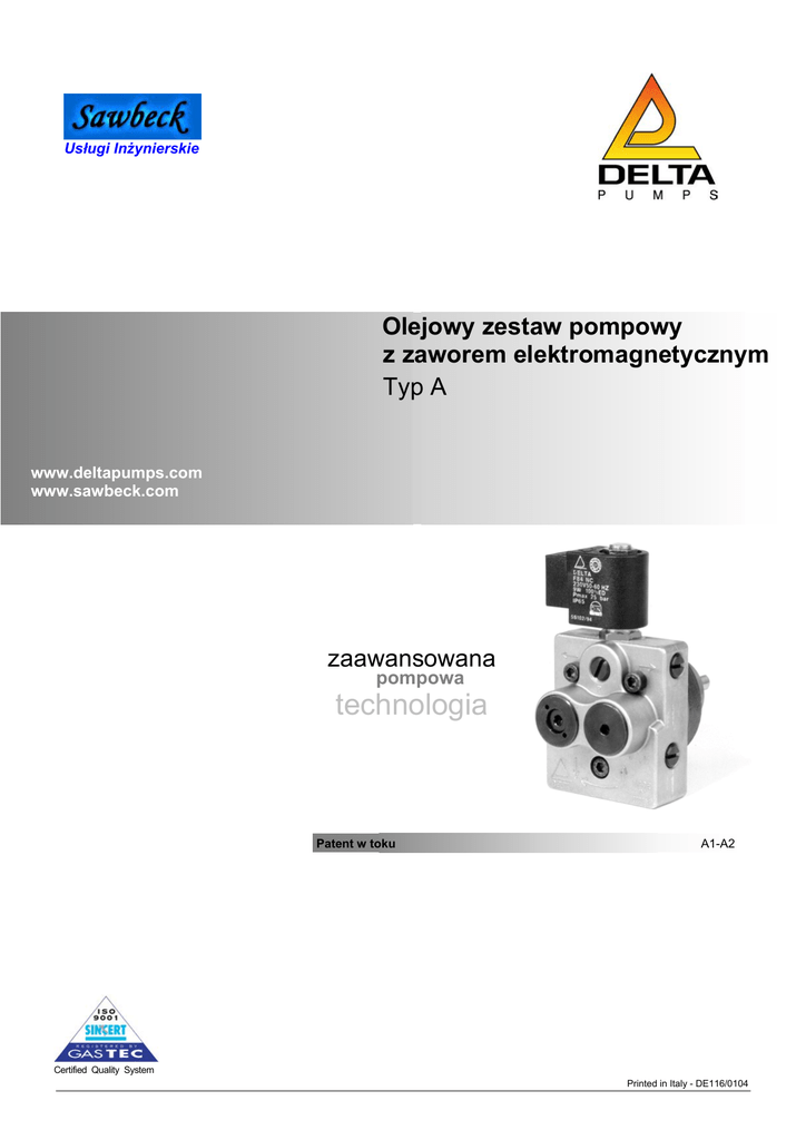 Usługi Inżynierskie Olejowy zestaw pompowy z zaworem elektromagnetycznym Typ A www.deltapumps.com www.sawbeck.com zaawansowana pompowa technologia Patent w toku A1-A2 Certified Quality System Printed in Italy - DE116/0104 Olejowa pompa z zaworem elektromagnetycznym Typ A Zestaw ten jest sprawną i nowoczesną aluminiową palnikową pompą. Może być użyty do każdego palnika zrobionego według nowej, obowiązującej wszystkich producentów palników, normy EN 225. Norma ta ściśle określa wymiar kołnierza, tulei oraz kształt osi pompy. Właściwości - - zdolność dużego ssania przystosowana do instalacji jedno lub dwudrogowej przyłącza do dyszy z dwóch stron ma wbudowany elektrozawór odcinający paliwo z dwóch stron łatwy dostęp do filtra paliwa, z przodu regulacja ciśnienia, z przodu samo-odpowietrzająca (dla instalacji dwudrogowej) wejście na manometr pomiarowy przed zaworem regulacyjnym wejście na manometr kontrolny za zaworem regulacyjnym (nieużywane przyłącze do dyszy) cicha praca niskie zużycie mocy prosty montaż i regulacja Zastosowanie Uniwersalny zestaw pompowy typ A przeznaczony jest zastosowania w palnikach olejowych jako część podstawowa lub zamiennik innych pomp w sytuacjach awaryjnych. Bardzo korzystną cechą tego zespołu jest możliwość dowolnego podłączenia rurki olejowej dyszy z prawej lub z lewej strony. Uwaga: Pompa nie może być używana do wody i kwasu. Po wystąpieniu podciśnienia, w stosunku do ciśnienia atmosferycznego, olej poprzez filtr wciągany jest do komory ssącej. Od strony ssącej, zębatki transportują olej to komory ciśnieniowej, gdzie olej zaczyna przeć na tłok zaworu regulacyjnego. Ciśnienie narasta, regulacyjna sprężyna powrotna przeciwdziała sile otwarcia wywołanej przez ciśnienie oleju, dopóki nie osiągnie odpowiedniej wartości. Dopływ oleju do dyszy możliwy jest dopiero po otwarciu zaworu elektromagnetycznego. Zawór elektromagnetyczny otwiera się po przejściu czasu przewietrzania i zamyka się bardzo szybka przed zatrzymaniem silnika (momentalne zamknięcie zapobiega kapaniu oleju z dyszy). Nadmiar oleju odprowadzony jest do linii powrotnej (lub poprzez bypass do linii ssącej, w przypadku instalacji jednodrogowej. Zmiana ciśnienia oleju podawanego na dyszę realizowana jest poprzez zmianę siły ściskającej sprężyny zaworu regulacyjnego (1). Pompa może być zmieniona z wersji dwuprzewodowej do wersji jednoprzewodowej, poprzez usunięcie zaślepki (4) znajdującej się wewnątrz króćca pomiaru podciśnienia (7). Gdy pompa zostaje zmieniona na wersję jednodrogową, odpowietrzenie pompy powinno przebiegać pod dozorem i powinno odbywać się poprzez króciec ciśnieniowy przeznaczony do montażu manometru (ten sposób pracy pompy nie jest zalecany, gdy zbiornik oleju znajduje się poniżej palika). Dostęp do wkładu filtra (11) znajduje się z przodu pompy, czyszczenie filtra jest łatwe i odbywa się bez potrzeby rozkręcania innych elementów pompy. Działanie Zespól pompowy A składa się z pompy, elektrozaworu, filtru i z ciśnieniowego zaworu regulacyjnego (1). Samo pompa składa się z dwóch, sprzężonych ze sobą kół zębatych. Jedno z kół zębatych połączone jest kanalikiem olejowym z kanałem wałka napędzającego (3). W obudowie pompy wykonane są kanaliki olejowe prowadzące do: króćca ssania (6), króćca powrotu (5), przyłącza rurki drążka dyszy (9) oraz króćców pomiarowych do pomiaru ciśnienia (8) oraz podciśnienia (7). Po załączeniu pompy , wirujące koła zębate, poprzez kanalik odpowietrzający umieszczony w tłoku zaworu regulacyjnego, usuwają powietrze z komory ssącej do linii powrotnej w przypadku instalacji dwuprzewodowej lub w przypadku instalacji jednoprzewodowej poprzez dyszę (po otwarciu elektrozaworu). W trakcie serwisu palnika (tylko pod nadzorem) możliwe jest szybsze odpowietrzenie pompy poprzez otwarcie na krótko przyłącza przeznaczonego do wkręcenia manometru. 10 9 9 8 2 3 1 11 7 4 6 5 Printed in Italy - DE116/0104 Oznaczenie pompy A 1 R 2 F A Typ pompy Wydatek dyszy (proszę popatrzeć na wykres) Kierunek obrotów (widziany od strony wałka) R = zgodnie ze wskazówkami zegara L = przeciwnie System przewodowy 1 = jednodrożny 2 = dwudrożny Typ cewki F = NF84 (cewka z gniazdem) Zasilanie A = 230 VAC 50/60Hz B = 110 VAC 50/60Hz C = 24 VAC 50/60Hz Dane techniczne Lepkość oleju .………………………………. 1,2 ÷ 12 cSt Temperatura oleju…………………………... 60°C maks. Zużycie mocy……... ………………………... Patrz wykres Wydatek dyszy …………………………….... Patrz wykres Zakres ciśnień …………………………….... 6 ÷ 20 bar Podciśnienie linii ssącej.…………………... 0,5 bar maks. Ciśnienie linii ssącej ……………….…….... 2 bar maks. Ciśnienie linii powrotnej …………………... 2 bar maks. Moment startowy …………………………… 0,1 Nm maks. Szybkość obrotowa………..………….……. 3500 rpm maks. Standardowy filtr……….….………………... Stalowa siatka 130µ, 11cm² Wymiary (EN 225) ………………………. Podłączenia (ISO 228/1) …………………... Waga ……………………………………….. Nastawy fabryczne ………………… tuleja Ø32, wałek Ø8 Wejście – powrót : G1/4” Wyjście dysza: G1/8” Manometr, Wakuometr : G1/8” 720 gr. Ciśnienie pracy: 10 ±0,3 bar Cewka w standardzie: 230 VAC 50/60Hz Wtyczka w standardzie: 3 biegunowa z kablem 700 mm Dane elektrozaworu Pobór mocy .……………………………........ 9 W Tolerancja napięcia ………………………… -15% / +10% Temperatura otoczenia…..…….…………... 0°C / 60°C Ciśnienie pracy …………………………....... 25 bar maks. Współczynnik przepływu (VDI/VDE 2173). 0,059 m3/h Ciśnienie odcięcia ………………………….. 6 bar Aprobata (EN 264) …………………