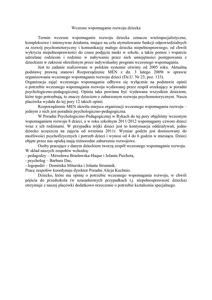 Wczesne wspomaganie rozwoju dziecka Termin wczesne wspomaganie rozwoju dziecka oznacza wielospecjalistyczne, kompleksowe i intensywne działania, mające na celu stymulowanie funkcji odpowiedzialnych za rozwój psychomotoryczny i komunikację małego dziecka niepełnosprawnego, od chwili wykrycia niepełnosprawności do czasu podjęcia nauki w szkole, a także pomoc i wsparcie udzielane rodzicom i rodzinie w nabywaniu przez nich umiejętności postępowania z dzieckiem w zakresie określonym przez indywidualny program wczesnego wspomagania. Jest to zadanie realizowane w polskim systemie oświaty od 2005 roku. Aktualną podstawę prawną stanowi Rozporządzenie MEN z dn. 3 lutego 2009r w sprawie organizowania wczesnego wspomagania rozwoju dzieci (Dz.U. Nr 23, poz. 133). Organizacja zajęć wczesnego wspomagania odbywa się wyłącznie na podstawie opinii o potrzebie wczesnego wspomagania rozwoju wydawanej przez zespół orzekający w poradni psychologiczno-pedagogicznej. Opinia taka powinna być wydawana wszystkim dzieciom, które tego potrzebują, to znaczy dzieciom o zaburzonym rozwoju psychomotorycznym. Nasza placówka wydała do tej pory 12 takich opinii. Rozporządzenie MEN określa miejsca organizacji wczesnego wspomagania rozwoju – jednym z nich jest poradnia psychologiczno-pedagogiczna. W Poradni Psychologiczno-Pedagogicznej w Rykach do tej pory objęliśmy wczesnym wspomaganiem rozwoju 8 dzieci, a w roku szkolnym 2011/2012 wspomagamy czworo dzieci wraz z ich rodzinami. W przypadku trójki dzieci jest to kontynuacja oddziaływań, jedno dziecko uczęszcza na zajęcia od września 2011r. Wymiar godzin jest dostosowany do możliwości psychofizycznych i potrzeb dzieci i wynosi od 4 do 6 godzin w miesiącu. Dzieci objęte przez nas opieką mają różnorodne zaburzenia rozwojowe. Osoby pracujące z danym dzieckiem tworzą zespół wczesnego wspomagania rozwoju. W skład naszych zespołów wchodzą: - pedagodzy – Mirosława Brasławska-Haque i Jolanta Piechota, - psycholog – Barbara Dac, - logopedzi – Dominika Miturska i Jolanta Strumnik. Pracę zespołów koordynuje dyrektor Poradni Alicja Kuchnio. Dziecko, które ma opinię o potrzebie wczesnego wspomagania rozwoju, w chwili pójścia do przedszkola (w uzasadnionych przypadkach t.j. niepełnosprawność dziecka) otrzymuje z naszej placówki dodatkowo orzeczenie o potrzebie kształcenia specjalnego.
