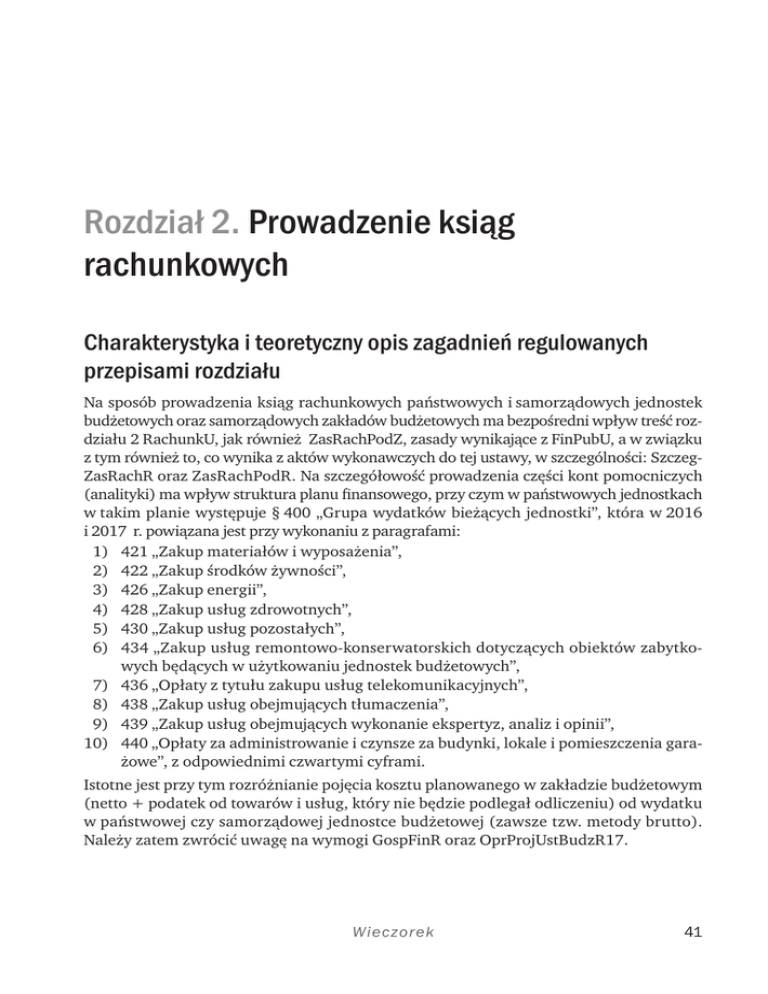 Rozdział 2. Prowadzenie ksiąg rachunkowych Charakterystyka i teoretyczny opis zagadnień regulowanych przepisami rozdziału Na sposób prowadzenia ksiąg rachunkowych państwowych i samorządowych jednostek budżetowych oraz samorządowych zakładów budżetowych ma bezpośredni wpływ treść rozdziału 2 RachunkU, jak również ZasRachPodZ, zasady wynikające z FinPubU, a w związku z tym również to, co wynika z aktów wykonawczych do tej ustawy, w szczególności: SzczegZasRachR oraz ZasRachPodR. Na szczegółowość prowadzenia części kont pomocniczych (analityki) ma wpływ struktura planu finansowego, przy czym w państwowych jednostkach w takim planie występuje § 400 „Grupa wydatków bieżących jednostki”, która w 2016 i 2017 r. powiązana jest przy wykonaniu z paragrafami: 1) 421 „Zakup materiałów i wyposażenia”, 2) 422 „Zakup środków żywności”, 3) 426 „Zakup energii”, 4) 428 „Zakup usług zdrowotnych”, 5) 430 „Zakup usług pozostałych”, 6) 434 „Zakup usług remontowo-konserwatorskich dotyczących obiektów zabytkowych będących w użytkowaniu jednostek budżetowych”, 7) 436 „Opłaty z tytułu zakupu usług telekomunikacyjnych”, 8) 438 „Zakup usług obejmujących tłumaczenia”, 9) 439 „Zakup usług obejmujących wykonanie ekspertyz, analiz i opinii”, 10) 440 „Opłaty za administrowanie i czynsze za budynki, lokale i pomieszczenia garażowe”, z odpowiednimi czwartymi cyframi. Istotne jest przy tym rozróżnianie pojęcia kosztu planowanego w zakładzie budżetowym (netto + podatek od towarów i usług, który nie będzie podlegał odliczeniu) od wydatku w państwowej czy samorządowej jednostce budżetowej (zawsze tzw. metody brutto). Należy zatem zwrócić uwagę na wymogi GospFinR oraz OprProjUstBudzR17. Wieczorek 41 Rozdział 2. Prowadzenie ksiąg rachunkowych Zasada podmiotowości wynikająca z art. 2 ust. 1 pkt 4 RachunkU ustala, jakie jednostki będą prowadziły księgi rachunkowe – powinny to być osoby prawne sektora finansów publicznych (z wyjątkiem NBP, Skarbu Państwa), łącznie z gminami, powiatami i województwami, a także: 1) państwowe jednostki budżetowe, 2) gminne jednostki budżetowe, 3) powiatowe jednostki budżetowe, 4) wojewódzkie jednostki budżetowe, 5) gminne zakłady budżetowe, 6) powiatowe zakłady budżetowe, 7) wojewódzkie zakłady budżetowe. Gminy, powiaty i województwa, mimo że zostały wymienione w podmiotach, które mają prowadzić księgi rachunkowe, to jednak tego uczynić nie mogą. Wynika to już z przepisów ustrojowych SamGminU, SamPowiatU, SamWojU, ponieważ: 1) gmina jako wspólnota samorządowa (mieszkańców) oraz odpowiednie terytorium, 2) powiat jako lokalna wspólnota samorządowa oraz odpowiednie terytorium, 3) województwo (samorząd województwa) jako regionalna wspólnota samorządowa oraz odpowiednie terytorium – działają poprzez swoje organy stanowiące (rada gminy, rada powiatu, sejmik województwa) oraz organy wykonawcze (wójta, burmistrza lub prezydenta, zarząd powiatu, zarząd województwa), które obsługiwane są przez jednostki budżetowe w postaci urzędu gminy, starostwa, urzędu marszałkowskiego. Jednostki samorządu terytorialnego sensu stricto nie prowadzą ksiąg rachunkowych. Sytuację majątkową samorządu opisuje sprawozdanie finansowe, określone w § 20 SzczegZasRachR, które sporządzane jest na podstawie ewidencji wykonania budżetu oraz tego, co wykazywane jest w ewidencji jednostek organizacyjnych nieposiadających osobowości prawnej (jednostek budżetowych i samorządowych zakładów budżetowych) w sprawozdaniu finansowym łącznym. Kwestie związane z problemami dotyczącymi sprawozdań skonsolidowanych opisuje komentarz do rozdziału 6 RachunkU. Z art. 40 ust. 1 FinPubU wynika, że jednostki sektora finansów publicznych prowadzą rachunkowość zgodnie z przepisami o rachunkowości z uwzględnieniem zasad określonych w FinPubU. Jednak art. 9 FinPubU ustala, że sektor finansów publicznych tworzą m.in.: 1) organy władzy publicznej (na potrzeby których prowadzona jest ewidencja budżetu odpowiedniego szczebla dysponenckiego), 2) gminy, powiaty, samorządy województw, 3) związki metropolitalne (od 1.1.2016 r.), 4) jednostki budżetowe, 5) samorządowe zakłady budżetowe, 6) państwowe fundusze celowe (w rozumieniu art. 2 RachunkU od 2015 r. nie mogą być prowadzone osobne księgi rachunkowe – ich ewidencja prowadzona ma być w ramach ksiąg rachunkowych jednostki budżetowej obsługującej państwowy fundusz celowy). 42 Wieczorek Rozdział 2. Prowadzenie ksiąg rachunkowych Trudno jednak zgodzić się z powszechną tezą, że art. 9 FinPubU wymienia podmioty sektora finansów publicznych [zob. A. Mierzwa, (w:) Ustawa o finansach publicznych. Komentarz, pod red. P. Smolenia, Warszawa 2012, s. 152; E. Hellich, Nowa ustawa o finansach publicznych. Wprowadzenie do zmian obowiązujących od 1.1.2010 r., Warszawa 2010, s. 5], ponieważ organ władzy bez jednostki budżetowej nie mógłby zrealizować żadnego zadania. Podmiotem w sensie cywilistycznym jest Skarb Państwa (art. 33 KC), a nie jest wymieniony w tym wykazie. Abstrahując od teorii finansów publicznych, dla nas istotny jest podmiot faktycznie zobowiązany prowadzić księgi rachunkowe, w których zawarte są dane finansowe pozwalające rozliczyć dysponenta środków publicznych. Artykuł 2 ust. 1 RachunkU jest spójny z art. 9 FinPubU, ponieważ osobno wymienia JST i jednostki budżetowe oraz samorządowe zakłady budżetowe. Z powyższego wynikałoby, że np. gmina powinna mieć swoje księgi rachunkowe, jak też jej urząd, szkoła, ośrodek pomocy społecznej. Wybiórcze stosowanie prawa doprowadziło do tego, że część urzędów pozbawiono podmiotowości określonej we wspomnianych przepisach, uznając ich tożsamość z samorządem – przez wystawianie rachunków i faktur VAT tylko na JST, co jest ewidentnym naruszeniem zarówno zasad ustrojowy