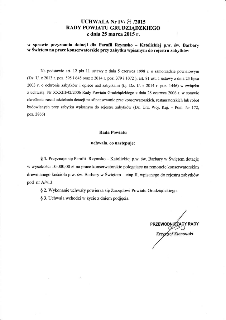UCHWAŁA Nr lvl 8 l20l5 RADY POWIATU GRUD ZIĄDZKIE GO z dnia 25 marca 2015 r. w sprawie przyznania dotacji dla Parafii Rzymsko - Katolickiej p.w. św.Barbary w Swiętem na prace konserwatorskie przy zab7,tku wpisanym do rejestru zabytków Na podstawie art. 12 pkt 11 ustawy (Dz. U. z 2013 r. poz. 595 i z dńa 5 czerwca 1998 r. o samorządzie powiatowym z 2014 r. poz. 379 i 1072 ), art. 81 ust. 1 ustawy z dnia23 lipca opiece nad zabytkami (tj. Dz.IJ. z 2014 r, poz. 1446) w związku 645 oraz 2003 r, o ochronie zabytków i z achwałą Nr XXXIIV42|2006 Rady Powiafu Gradziądzklego z dnia 28 czerwca 2006 r. w sprawie określenia zasadudzięIania dotacji na sfinansowanie prac konserwatorskich, restauratorskich lub robót budowlanych prrry zabylku wpisanym do rejestru zabytków (Dz. IJrz. Woj. Kuj. - Pom. Nr 172, poz.2866) Rada powiatu uchwala, co następuje: § l.Przyznaje się Parafii Rzymsko - Katolickiej p.w. św.Barbary w Świętem dotację w wysokości10.000,00 złna prace konserwatorskie polegające na remoncie konserwatorskim drewnianego kościołap.w. św.Barbary w Świętem - etap II, wpisanego do rejestru zabyków pod nr N4I3. § 2. Wykonanie uchwały powierza się Zarządowi Powiafu Grudziądzklego. § 3. Uchwała wchodzi w życie z dniempodjęcia. uzasadnienie Zgodnie z art. 8I ust. 1 ustawy z dnia 23 lipca 2003 r. o ochronie zabytków i opiece nad zab5Ąkami (tj. Dz. U. z 2014 r. poz. 1446) Rada Powiatu Grudziądzkiego ma możliwośó przyznania dotacji na prace konserwatorskie, restauratorskie i roboty budowlanę przy zabyku wpisanym do rejestru zabYków. Rada Powiatu Grudziądzkiego uchwałą Nr XXXIIV42|2006 z dńa 28 częrwca 2006 r. określiłazasady udzielania dotacji na sfinansowanie prac konserwatorskich, restauratorskich lub robót budowlanychprzy zabytku wpisanyn do rejestru zabytków. Proponowana w uchwale do przyznania dotacja przeznaczona ma być na dofinansowanie prac konserwatorskich polegających na remoncie konstrukcji drewnianej ścianobwodowych wraz z ich oszalowaniem oraz stolarką okienną i drzwiową, remontem izolacji poziomej pod ścianami kościołap,w. św,Barbary w Świętem wpisanego a - także etap II, do rejestru zabytków decyzją Wojewódzkiego Konserwatora Zab5Ąków r. i obecnie figurującego w rejestrze zabykow w Bydgoszczy z dnia 05 sierpnia 196I województwa kujawsko - pomorskiego pod numerem N4I3. Prace konserwatorskie budowlane prowadzonebędąmiędzy innymi w następującym zakresie: - zdjęcie szalunku i deski gzynrsowej - do zachowania; - naprawa kamiennych fundamentów; - podniesienie - kościoław celu wymiany zmurszńych podwalin, ich naprawy; wykonanie izolacji poziomej; - uzupełnienie ubytków belek zrębowych; - wykonanie szalunku na łatach dystansowych; - ponowny montń deski gz5rmsowej po uzupełnieniach; - dezynfekcja, odgrzybienie; - zab ezpieczenie przeciwo gniowe ; - naprawa ścianzrębowych zwyłączeniem lisic z ornamentem patronowym; - konserwacja stolarki okienno - drzwiowej. Wskazane wizej prace przy zabythl, mają na cell zabezpieczenie, zachowante, odnowienie i utrwalenie substancji zabfku. Projektowane do wykonania prace są zgodne z art, 77 pkt. 8, 9 i 13 ustawy 23lipca2003 r. o ochronie zabytków i opiece nad zabYkami (tj. Dz.IJ. z20I4 r. z dnta poz. 1446). W budZecie powiatu grudziądzktego na rok 2015 na dotacje na prace konserwatorskie, restauratorskie lub roboty budowlane przy zabytkl wpisanyrrr w rejestr zabylków zaplanowanezostały środkiw wysokości 10.000,00 zł. cY '') |)' RADY Kolowski
