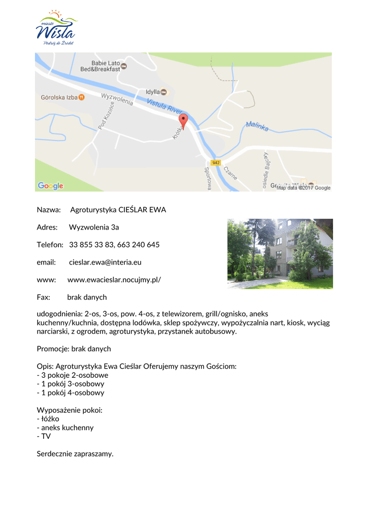 Nazwa: Agroturystyka CIEŚLAR EWA Adres: Wyzwolenia 3a Telefon
