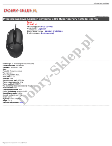 Informacje o produkcie Utworzono 08-03-2017 Mysz przewodowa Logitech optyczna G402 Hyperion Fury 4000dpi czarna Cena : 233,00 zł D ob ry - Gwarancja: 24 miesiące gwarancji fabrycznej Kod Producenta: 910-004067 Kod EAN:: 5099206051768 Opis: Produkt: Mysz przewodowa Typ: optyczna Ilość przycisków: 8 szt. Ilość rolek: 1 szt. Interfejs: USB Rozdzielczość (dpi): 4000 dpi Maks. przyspieszenie: 16 g Maks. szybkość: 500 IPS Typ transmisji bezprzewodowej: Nie dotyczy Podświetlenie: Tak Kolor podświetlenia: RGB Cechy dodatkowe: przełącznik DPI Długość przewodu: 2,13 m Sposób zasilania: port USB Kolor: czarna Wymiary: 136x72x41 mm Waga: 144 g Strona www produktu: Link Sk le p. pl Nr katalogowy : 910-004067 Producent : Logitech Stan magazynowy : poniżej średniego Średnia ocena : brak recenzji Wygenerowano w programie www.oscGold.com