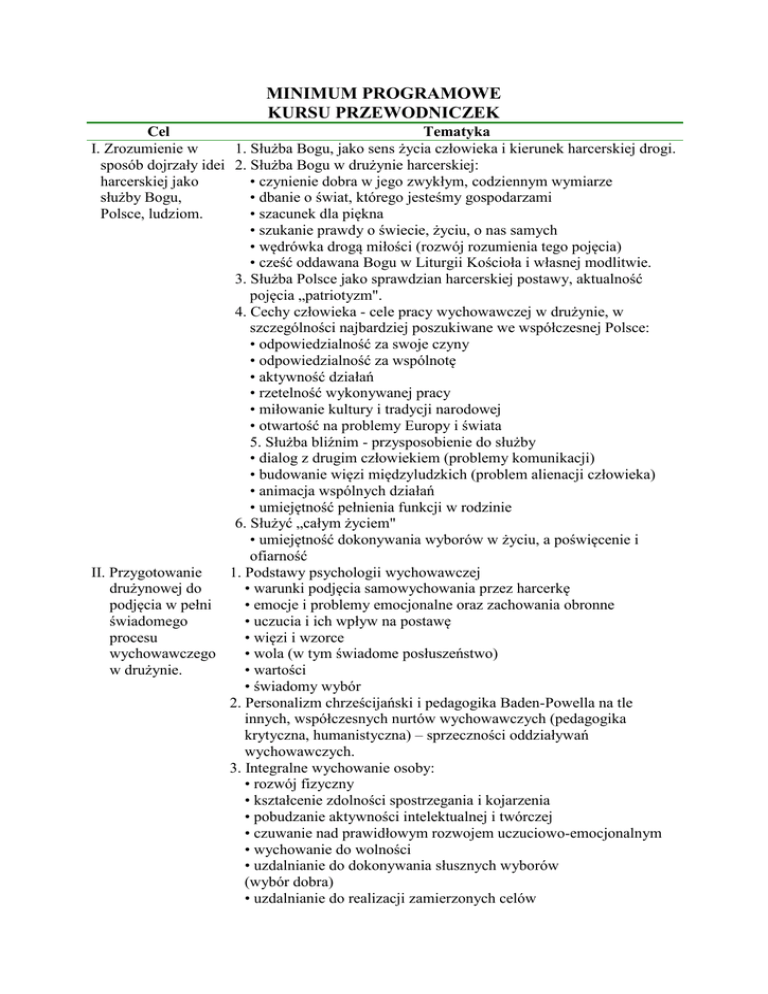 MINIMUM PROGRAMOWE KURSU PRZEWODNICZEK Cel Tematyka I. Zrozumienie w 1. Służba Bogu, jako sens życia człowieka i kierunek harcerskiej drogi. sposób dojrzały idei 2. Służba Bogu w drużynie harcerskiej: harcerskiej jako • czynienie dobra w jego zwykłym, codziennym wymiarze służby Bogu, • dbanie o świat, którego jesteśmy gospodarzami Polsce, ludziom. • szacunek dla piękna • szukanie prawdy o świecie, życiu, o nas samych • wędrówka drogą miłości (rozwój rozumienia tego pojęcia) • cześć oddawana Bogu w Liturgii Kościoła i własnej modlitwie. 3. Służba Polsce jako sprawdzian harcerskiej postawy, aktualność pojęcia „patriotyzm". 4. Cechy człowieka - cele pracy wychowawczej w drużynie, w szczególności najbardziej poszukiwane we współczesnej Polsce: • odpowiedzialność za swoje czyny • odpowiedzialność za wspólnotę • aktywność działań • rzetelność wykonywanej pracy • miłowanie kultury i tradycji narodowej • otwartość na problemy Europy i świata 5. Służba bliźnim - przysposobienie do służby • dialog z drugim człowiekiem (problemy komunikacji) • budowanie więzi międzyludzkich (problem alienacji człowieka) • animacja wspólnych działań • umiejętność pełnienia funkcji w rodzinie 6. Służyć „całym życiem" • umiejętność dokonywania wyborów w życiu, a poświęcenie i ofiarność II. Przygotowanie 1. Podstawy psychologii wychowawczej drużynowej do • warunki podjęcia samowychowania przez harcerkę podjęcia w pełni • emocje i problemy emocjonalne oraz zachowania obronne świadomego • uczucia i ich wpływ na postawę procesu • więzi i wzorce wychowawczego • wola (w tym świadome posłuszeństwo) w drużynie. • wartości • świadomy wybór 2. Personalizm chrześcijański i pedagogika Baden-Powella na tle innych, współczesnych nurtów wychowawczych (pedagogika krytyczna, humanistyczna) – sprzeczności oddziaływań wychowawczych. 3. Integralne wychowanie osoby: • rozwój fizyczny • kształcenie zdolności spostrzegania i kojarzenia • pobudzanie aktywności intelektualnej i twórczej • czuwanie nad prawidłowym rozwojem uczuciowo-emocjonalnym • wychowanie do wolności • uzdalnianie do dokonywania słusznych wyborów (wybór dobra) • uzdalnianie do realizacji zamierzonych celów III. Rozwój umiejętności organizowania pełnego życia harcerskiego swojej drużyny. IV. Poznanie struktury funkcjonowania ZHR, a w szczególności organizacji harcerek. V. Danie intensywnego przeżycia harcerskiej wspólnoty, będącego jednocześnie sprawdzianem siebie. 4. Metoda harcerska dla zuchów, harcerek, wędrowniczek • podsumowanie zasad metodycznych w trzech poziomach wiekowych (uzupełnienie przez kursantki wiedzy z dwóch nieznanych sobie poziomów metodycznych) • wyłanianie problemów środowisk harcerskich z zakresu metodyki i wymiana doświadczeń (np. inspirowanie samodzielnych działań zastępów, animacja służby w drużynie) 5. Wychowanie kadry następców • praca z następczynią • przekazywanie obowiązków • kryzysy kadrowe 6. Ocena skutków własnej pracy wychowawczej w drużynie • analiza osiągnięć i niepowodzeń] 1. Planowanie pracy wychowawczej w drużynie • umiejętność wyłaniania celów wychowawczych • umiejętność przechodzenia od celów wychowawczych do głównych założeń programowych • umiejętność doboru form realizacji założeń programowych • planowanie i organizowanie działań drużyny na rzecz osób niepełnosprawnych. 2. Zaistnienie drużyny w środowisku domowym, osiedlowym, szkolnym, parafialnym, współpraca z organizacjami społecznymi i administracją lokalną. 3. Organizacja samodzielnego obozu drużyny. • formy obozowania • założenia organizacyjne • kwatermistrzostwo i finanse • program • odpowiedzialność i bezpieczeństwo 4. Hierarchia, rozkazodawstwo a demokracja. Prawa i obowiązki instruktorek pełniących swoją funkcję. 1. Historia harcerstwa i organizacji harcerek • sylwetki instruktorów i instruktorek 2. ZHR na tle innych organizacji harcerskich 3. Struktura ZHR i podstawy funkcjonowania: • statut • zarys programu wychowawczego ZHR W dowolnie wybranej formie zadaniowej, ciekawej i zaskakującej, łączącej działania grupowe z indywidualnymi, sprawdzenie cech charakteru kursantek potrzebnych w pracy instruktorskiej: • odpowiedzialności • uczciwości • samodzielności myślenia • otwartości, zrozumienia człowieka • świadomości społecznej. Lista polecanych dodatkowych zajęć: 1. Organizacja czasu własnego 2. Golgota Wschodu Uwaga! Warunki uczestnictwa w kursie pwd to otwarta próba na stopień wędrowniczki i stopień przewodniczki oraz posiadanie 17-stu lat. Przynajmniej jedna część kursu powinna odbyć się w formie wyjazdowej (minimum 5 dni).
