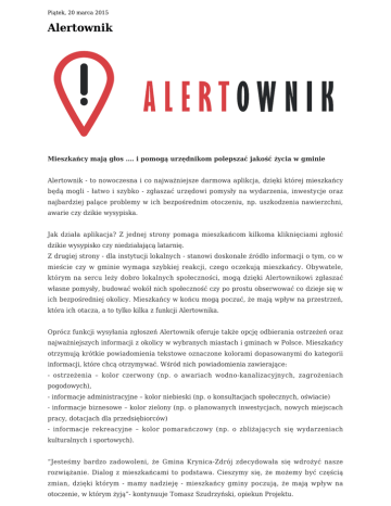 Piątek, 20 marca 2015 Alertownik Mieszkańcy mają głos …. i pomogą urzędnikom polepszać jakość życia w gminie Alertownik - to nowoczesna i co najważniejsze darmowa aplikcja, dzięki której mieszkańcy będą mogli - łatwo i szybko - zgłaszać urzędowi pomysły na wydarzenia, inwestycje oraz najbardziej palące problemy w ich bezpośrednim otoczeniu, np. uszkodzenia nawierzchni, awarie czy dzikie wysypiska. Jak działa aplikacja? Z jednej strony pomaga mieszkańcom kilkoma kliknięciami zgłosić dzikie wysypisko czy niedziałającą latarnię. Z drugiej strony - dla instytucji lokalnych - stanowi doskonałe źródło informacji o tym, co w mieście czy w gminie wymaga szybkiej reakcji, czego oczekują mieszkańcy. Obywatele, którym na sercu leży dobro lokalnych społeczności, mogą dzięki Alertownikowi zgłaszać własne pomysły, budować wokół nich społeczność czy po prostu obserwować co dzieje się w ich bezpośredniej okolicy. Mieszkańcy w końcu mogą poczuć, że mają wpływ na przestrzeń, która ich otacza, a to tylko kilka z funkcji Alertownika. Oprócz funkcji wysyłania zgłoszeń Alertownik oferuje także opcję odbierania ostrzeżeń oraz najważniejszych informacji z okolicy w wybranych miastach i gminach w Polsce. Mieszkańcy otrzymują krótkie powiadomienia tekstowe oznaczone kolorami dopasowanymi do kategorii informacji, które chcą otrzymywać. Wśród nich powiadomienia zawierające: - ostrzeżenia – kolor czerwony (np. o awariach wodno-kanalizacyjnych, zagrożeniach pogodowych), - informacje administracyjne – kolor niebieski (np. o konsultacjach społecznych, oświacie) - informacje biznesowe – kolor zielony (np. o planowanych inwestycjach, nowych miejscach pracy, dotacjach dla przedsiębiorców) - informacje rekreacyjne – kolor pomarańczowy (np. o zbliżających się wydarzeniach kulturalnych i sportowych). “Jesteśmy bardzo zadowoleni, że Gmina Krynica-Zdrój zdecydowała się wdrożyć nasze rozwiążanie. Dialog z mieszkańcami to podstawa. Cieszymy się, że możemy być częścią zmian, dzięki którym - mamy nadzieję - mieszkańcy gminy poczują, że mają wpływ na otoczenie, w którym żyją”- kontynuuje Tomasz Szudrzyński, opiekun Projektu. Alertownik umożliwia szybkie dzielenie się odebranymi powiadomieniami z bliskimi przez SMS lub e-mail oraz zapisywanie terminów wydarzeń jednym kliknięciem w kalendarzu w smartfonie i na tablecie. Spróbuj już dziś! Wystarczy zeskanować poniższy kod QR lub wpisać w przeglądarce internetowej w smartfonie lub tablecie adres: https://alertownik.pl/pobierz-uzytkownicy