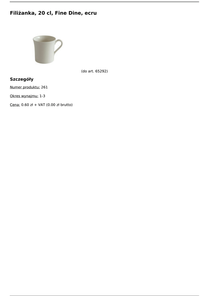 Filiżanka, 20 cl, Fine Dine, ecru (do art. 65292) Szczegóły Numer produktu: 261 Okres wynajmu: 1-3 Cena: 0.60 zł + VAT (0.00 zł brutto) Powered by TCPDF (www.tcpdf.org)