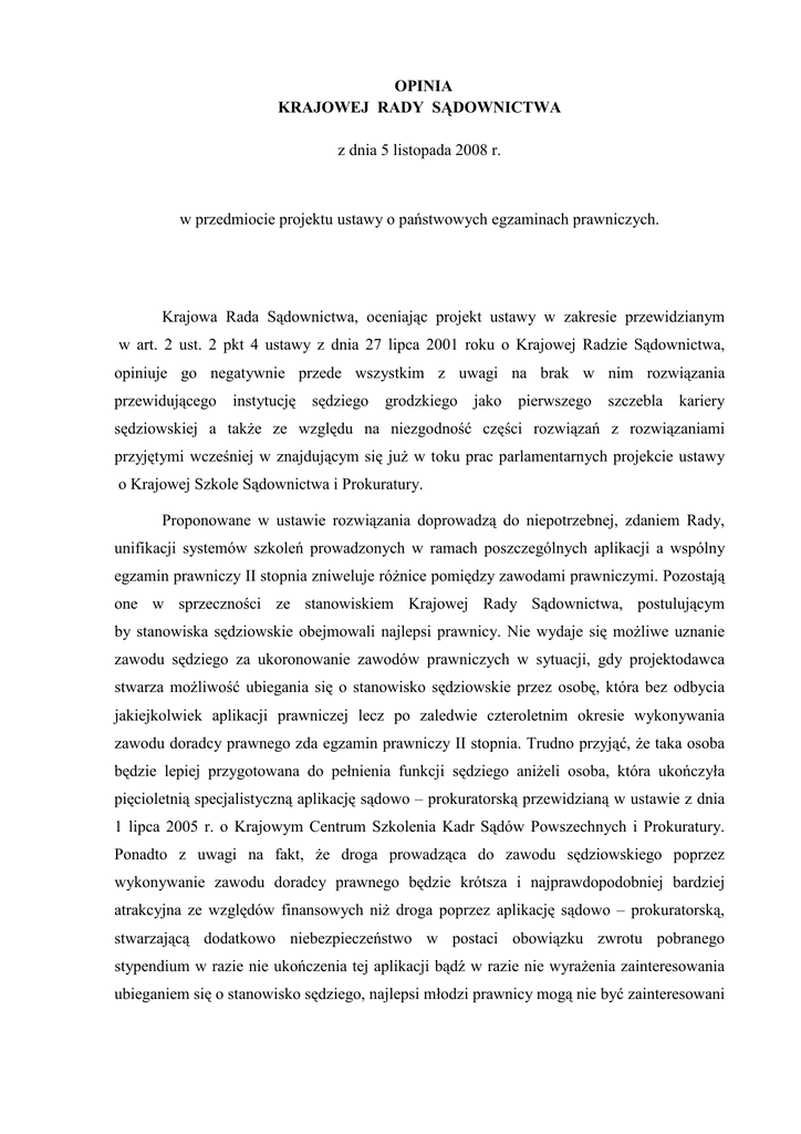 OPINIA KRAJOWEJ RADY SĄDOWNICTWA z dnia 5 listopada 2008 r. w przedmiocie projektu ustawy o państwowych egzaminach prawniczych. Krajowa Rada Sądownictwa, oceniając projekt ustawy w zakresie przewidzianym w art. 2 ust. 2 pkt 4 ustawy z dnia 27 lipca 2001 roku o Krajowej Radzie Sądownictwa, opiniuje go negatywnie przede wszystkim z uwagi na brak w nim rozwiązania przewidującego instytucję sędziego grodzkiego jako pierwszego szczebla kariery sędziowskiej a takŜe ze względu na niezgodność części rozwiązań z rozwiązaniami przyjętymi wcześniej w znajdującym się juŜ w toku prac parlamentarnych projekcie ustawy o Krajowej Szkole Sądownictwa i Prokuratury. Proponowane w ustawie rozwiązania doprowadzą do niepotrzebnej, zdaniem Rady, unifikacji systemów szkoleń prowadzonych w ramach poszczególnych aplikacji a wspólny egzamin prawniczy II stopnia zniweluje róŜnice pomiędzy zawodami prawniczymi. Pozostają one w sprzeczności ze stanowiskiem Krajowej Rady Sądownictwa, postulującym by stanowiska sędziowskie obejmowali najlepsi prawnicy. Nie wydaje się moŜliwe uznanie zawodu sędziego za ukoronowanie zawodów prawniczych w sytuacji, gdy projektodawca stwarza moŜliwość ubiegania się o stanowisko sędziowskie przez osobę, która bez odbycia jakiejkolwiek aplikacji prawniczej lecz po zaledwie czteroletnim okresie wykonywania zawodu doradcy prawnego zda egzamin prawniczy II stopnia. Trudno przyjąć, Ŝe taka osoba będzie lepiej przygotowana do pełnienia funkcji sędziego aniŜeli osoba, która ukończyła pięcioletnią specjalistyczną aplikację sądowo – prokuratorską przewidzianą w ustawie z dnia 1 lipca 2005 r. o Krajowym Centrum Szkolenia Kadr Sądów Powszechnych i Prokuratury. Ponadto z uwagi na fakt, Ŝe droga prowadząca do zawodu sędziowskiego poprzez wykonywanie zawodu doradcy prawnego będzie krótsza i najprawdopodobniej bardziej atrakcyjna ze względów finansowych niŜ droga poprzez aplikację sądowo – prokuratorską, stwarzającą dodatkowo niebezpieczeństwo w postaci obowiązku zwrotu pobranego stypendium w razie nie ukończenia tej aplikacji bądź w razie nie wyraŜenia zainteresowania ubieganiem się o stanowisko sędziego, najlepsi młodzi prawnicy mogą nie być zainteresowani odbywaniem aplikacji sądowo – prokuratorskiej pomimo zdania egzaminu prawniczego I stopnia z oceną gwarantującą przyjęcie. Rada ponownie negatywnie opiniuje zamysł wprowadzenia do systemu prawnego instytucji doradcy prawnego podtrzymując argumentację zawartą w stanowisku z dnia 18 kwietnia 2007 r. dotyczącym projektu ustawy o licencjach prawniczych. Unormowanie zawarte w art. 5 ust. 3 projektu ustawy przewidujące obowiązek prowadzenia list doradców prawnych przez prezesów sądów apelacyjnych wykracza poza obszar sprawowania władzy sądowniczej. Wprawdzie zgodnie z art. 1 § 3 usp sądy powszechne wykonują równieŜ zadania z zakresu ochrony prawnej powierzonej im w drodze ustaw, ale do tego rodzaju zadań nie moŜna zaliczyć prowadzenia list jednej z korporacji prawniczych, za jaką niewątpliwie naleŜy uznać stworzoną w projekcie ustawy korporację doradców prawnych. W wypadku powierzenia prezesom sądów apelacyjnych prowadzenia list doradców prawnych naleŜy przewidzieć konieczność przydzielenia tym sądom stosownej liczby etatów urzędniczych, na których zostaną zatrudnione osoby z odpowiednio wysokimi kwalifikacjami zawodowymi, będące w stanie podołać obowiązkom prowadzenia w sposób profesjonalny postępowań administracyjnych związanych z wydawaniem decyzji w przedmiocie wpisów na listy. W innym razie, zwłaszcza w początkowym okresie po wejściu w Ŝycie ustawy po przeprowadzeniu pierwszego egzaminu prawniczego I stopnia, prezesi sądów apelacyjnych będą zmuszeni zająć się osobiście skumulowanym wpływem wniosków o wpis kosztem wykonywania swoich podstawowych obowiązków związanych z kierowaniem sądami. Przepis art. 5 ust. 5 projektu przewidujący obowiązek dołączania do wniosku o wpis na listę doradców prawnych oświadczenia o niekaralności za przestępstwo umyślne ściganie z oskarŜenia publicznego lub umyślne przestępstwo skarbowe nie koresponduje z podobnymi unormowaniami w innych ustawach. Znacznie lepsze byłoby nałoŜenie na osobę ubiegającą się o wpis obowiązku złoŜenia aktualnego zaświadczenia z Krajowego Rejestru Karnego o niekaralności a ponadto oświadczenia o tym, Ŝe przeciwko osobie chcącej zostać doradcą prawnym nie toczy się postępowanie karne. Z kolei art. 5 ust. 7 projektu nie przewiduje skreślenia z urzędu, doradcy prawnego juŜ wpisanego na listę w wypadku skazania go za przestępstwo przewidziane w art. 5 ust. 1 oraz w wypadku zaprzestania wykonywania obowiązku polegającego na ubezpieczeniu od odpowiedzialności cywilnej za szkody wyrządzone przy świadczeniu podstawowych czynności prawniczych. 2 Sformułowanie zawarte w art. 5 ust. 10 jest nieprecyzyjne. Doradca prawny moŜe nie zawiadomić prezesa sądu apelacyjnego o popełnieniu przestępstwa nawet w wypadku prawomocnego skazania jeśli będzie uwaŜał, Ŝe przestępstwa takiego w rzeczywistości nie popełnił. Ponadto nie wiadomo czy termin 14 – dniowy przewidziany na zawiadomienie naleŜy liczyć od daty popełnienia czynu, daty wyroku skazującego czy teŜ od daty uprawomocnienia się tego wyroku. Opiniowany projekt ustawy pozostaje w sprzeczności z będącym juŜ w toku prac legislacyjnych, w parlamencie, projektem ustawy o Krajowej Szkole Sądownictwa i Prokuratury. Jako warunek ubiegania się o przyjęcie na aplikację sądowo – prokuratorską przewiduje uzyskanie pozytywnego wyniku z egzaminu prawniczego I stopnia, podczas gdy projekt tej ostatniej ustawy przewiduje z kolei zupełnie odmienny sposób naboru. Testowy charakter egzaminu prawniczego I stopnia mający wiele zalet, zwłaszcza w zakresie zapewnienia obiektywizmu ocen i równowagi szans osób, które do niego przystąp
