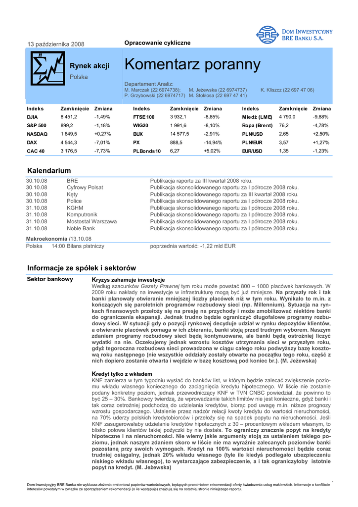 Komentarz poranny BRE Bank Securities BRE Bank Securities Opracowanie cykliczne 13 października 2008 Rynek akcji Komentarz poranny Polska Departament Analiz: M. Marczak (22 6974738); M. Jeżewska (22 6974737) P. Grzybowski (22 6974717) M. Stokłosa (22 697 47 41) Indeks Zam knięcie Zm iana Indeks Zam knięcie Zm iana K. Kliszcz (22 697 47 06) Indeks Zam knięcie Zm iana DJIA 8 451,2 -1,49% FTSE 100 3 932,1 -8,85% Miedź (LME) 4 790,0 -9,88% S&P 500 899,2 -1,18% WIG20 1 991,6 -8,10% Ropa (Brent) 76,2 -4,78% NASDAQ 1 649,5 +0,27% BUX 14 577,5 -2,91% PLN/USD 2,65 +2,50% DAX 4 544,3 -7,01% PX 888,5 -14,94% PLN/EUR 3,57 +1,27% CAC 40 3 176,5 -7,73% PLBonds10 6,27 +5,02% EUR/USD 1,35 -1,23% Kalendarium 30.10.08 30.10.08 30.10.08 30.10.08 31.10.08 31.10.08 31.10.08 31.10.08 BRE Cyfrowy Polsat Kęty Police KGHM Komputronik Mostostal Warszawa Noble Bank Makroekonomia /13.10.08 Polska 14:00 Bilans płatniczy Publikacja raportu za III kwartał 2008 roku. Publikacja skonsolidowanego raportu za I półrocze 2008 roku. Publikacja skonsolidowanego raportu za III kwartał 2008 roku. Publikacja skonsolidowanego raportu za I półrocze 2008 roku. Publikacja skonsolidowanego raportu za I półrocze 2008 roku. Publikacja skonsolidowanego raportu za I półrocze 2008 roku. Publikacja skonsolidowanego raportu za I półrocze 2008 roku. Publikacja skonsolidowanego raportu za I półrocze 2008 roku. poprzednia wartość: -1,22 mld EUR Informacje ze spółek i sektorów Sektor bankowy Kryzys zahamuje inwestycje Według szacunków Gazety Prawnej tym roku może powstać 800 – 1000 placówek bankowych. W 2009 roku nakłady na inwestycje w infrastrukturę mogą być już mniejsze. Na przyszły rok i tak banki planowały otwieranie mniejszej liczby placówek niż w tym roku. Wynikało to m.in. z kończących się paroletnich programów rozbudowy sieci (np. Millennium). Sytuacja na rynkach finansowych przełoży się na presję na przychody i może zmobilizować niektóre banki do ograniczenia ekspansji. Jednak trudno będzie ograniczyć długofalowe programy rozbudowy sieci. W sytuacji gdy o pozycji rynkowej decyduje udział w rynku depozytów klientów, a otwieranie placówek pomaga w ich zbieraniu, banki stoją przed trudnym wyborem. Naszym zdaniem programy rozbudowy sieci będą kontynuowane, ale banki będą ostrożniej liczyć wydatki na nie. Oczekujemy jednak wzrostu kosztów utrzymania sieci w przyszłym roku, gdyż tegoroczna rozbudowa sieci prowadzona w ciągu całego roku podwyższy bazę kosztową roku następnego (nie wszystkie oddziały zostały otwarte na początku tego roku, część z nich dopiero zostanie otwarta i wejdzie w bazę kosztową pod koniec br.). (M. Jeżewska) Kredyt tylko z wkładem KNF zamierza w tym tygodniu wysłać do banków list, w którym będzie zalecać zwiększenie poziomu wkładu własnego koniecznego do zaciągnięcia kredytu hipotecznego. W liście nie zostanie podany konkretny poziom, jednak przewodniczący KNF w TVN CNBC powiedział, że powinno to być 25 – 30%. Bankowcy twierdzą, że wprowadzanie takich limitów nie jest konieczne, gdyż banki i tak coraz ostrożniej podchodzą do udzielania kredytów, biorąc pod uwagę m.in. niższe prognozy wzrostu gospodarczego. Ustalenie przez nadzór relacji kwoty kredytu do wartości nieruchomości, na 70% uderzy polskich kredytobiorców i przełoży się na spadek popytu na nieruchomości. Jeśli KNF zasugerowałaby udzielanie kredytów hipotecznych z 30 – procentowym wkładem własnym, to blisko połowa klientów takiej pożyczki by nie dostała. To ograniczy znacznie popyt na kredyty hipoteczne i na nieruchomości. Nie wiemy jakie argumenty stoją za ustaleniem takiego poziomu, jednak naszym zdaniem skoro w liście nie ma wyraźnie zalecanych poziomów banki pozostaną przy swoich wymogach. Kredyt na 100% wartości nieruchomości będzie coraz trudniej osiągalny, jednak 20% wkładu własnego (tyle ile kiedyś podlegało ubezpieczeniu niskiego wkładu własnego), to wystarczające zabezpieczenie, a i tak ograniczyłoby istotnie popyt na kredyt. (M. Jeżewska) Dom Inwestycyjny BRE2008 Banku nie wyklucza złożenia emitentowi papierów wartościowych, będących przedmiotem rekomendacji oferty świadczenia usług maklerskich. Informacje o konflikcie 13 października interesów powstałym w związku ze sporządzeniem rekomendacji (o ile występuje) znajdują się na ostatniej stronie niniejszego raportu. BRE Bank Securities Getin Holding Komentarz poranny DomBank sprzedał więcej kredytów hipotecznych w 3Q08 niż w 2Q08 W 2Q08 sprzedaż przekroczyła 1 mld PLN. Bank podnosi marże na te kredyty jednak podtrzymuje, że w 2008 roku sprzeda ich o około 15% więcej niż rok wcześniej. W 1H08 bank sprzedał 1,64 mld PLN kredytów hipotecznych (+10% R/R), a w całym 2007 roku sprzedaż sięgnęła 3,1 mld PLN. DomBank zaostrzył ostatnio kryteria udzielania kredytów hipotecznych. Obecnie pożycza we frankach szwajcarskich do 80% wartości kredytowanej nieruchomości, podczas gdy wcześniej do 110%. W przypadku kredytów w złotych limit został ograniczony do 90%. Wraz z tą zmianą bank systematycznie podnosi marże na kredyty we frankach, a planuje zrobić taki ruch także dla złotówek. W połowie 2008 roku około 60% sprzedaży DomBank realizowali pośrednicy kredytowi. Blisko 20% sprzedaży kredytów hipotecznych banku stanowiły kredyty dla Polaków pracujących za granicą. Aby zrealizować plan sprzedaży o 15% niż w ubiegłym roku średnia kwartalna w 2H08 musi wynosić przynajmniej 960 mln PLN. W świetle tego, że 3Q08 przyniósł sprzedaż na poziomie 1 mld PLN, nawet spadek sprzedaży w 4Q08 może oznaczać realizację planu. Pozytywnie oceniamy zaostrzenie kryteriów udzielania kredytów i wzrost marż. Jednak niepokoi duży udział kredytów dla klientów pracujących zagranicą. W świetle spowalniających gospodarek zagranicznych może to oznaczać wyższą szkodowość kredytów w przyszłości. DomBank