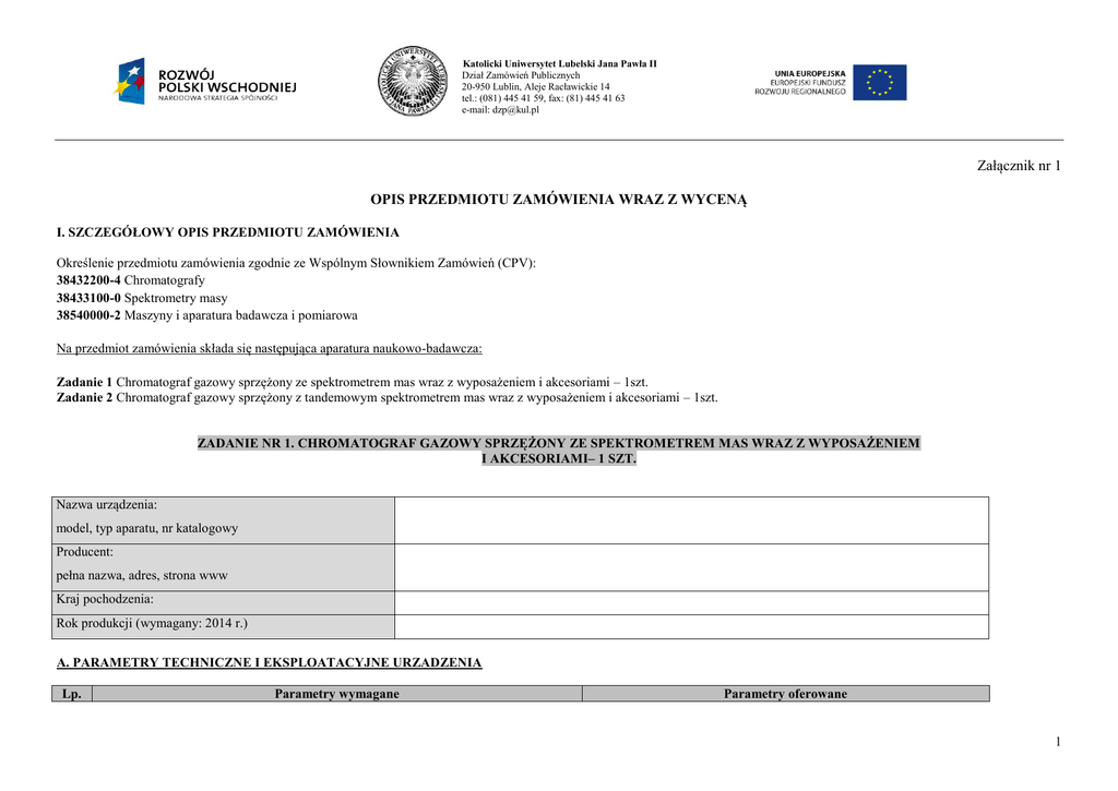 Katolicki Uniwersytet Lubelski Jana Pawła II Dział Zamówień Publicznych 20-950 Lublin, Aleje Racławickie 14 tel.: (081) 445 41 59, fax: (81) 445 41 63 e-mail: [email protected] Załącznik nr 1 OPIS PRZEDMIOTU ZAMÓWIENIA WRAZ Z WYCENĄ I. SZCZEGÓŁOWY OPIS PRZEDMIOTU ZAMÓWIENIA Określenie przedmiotu zamówienia zgodnie ze Wspólnym Słownikiem Zamówień (CPV): 38432200-4 Chromatografy 38433100-0 Spektrometry masy 38540000-2 Maszyny i aparatura badawcza i pomiarowa Na przedmiot zamówienia składa się następująca aparatura naukowo-badawcza: Zadanie 1 Chromatograf gazowy sprzężony ze spektrometrem mas wraz z wyposażeniem i akcesoriami – 1szt. Zadanie 2 Chromatograf gazowy sprzężony z tandemowym spektrometrem mas wraz z wyposażeniem i akcesoriami – 1szt. ZADANIE NR 1. CHROMATOGRAF GAZOWY SPRZĘŻONY ZE SPEKTROMETREM MAS WRAZ Z WYPOSAŻENIEM I AKCESORIAMI– 1 SZT. Nazwa urządzenia: model, typ aparatu, nr katalogowy Producent: pełna nazwa, adres, strona www Kraj pochodzenia: Rok produkcji (wymagany: 2014 r.) A. PARAMETRY TECHNICZNE I EKSPLOATACYJNE URZADZENIA Lp. Parametry wymagane Parametry oferowane 1 Katolicki Uniwersytet Lubelski Jana Pawła II Dział Zamówień Publicznych 20-950 Lublin, Aleje Racławickie 14 tel.: (081) 445 41 59, fax: (81) 445 41 63 e-mail: [email protected] 1 2 3 4 5 6 Dwukanałowy chromatograf gazowy z możliwością zamontowania do trzech detektorów i dwóch dozowników z elektroniczną kontrolą przepływu i ciśnienia gazów (EPC) nie gorszą niż 0,001 psi, wyposażony w wymywanie wsteczne - ang. backflushing (z wyłączeniem rozwiązania typu Quick Swap). EPC musi umożliwić kompensację zmian ciśnienia atmosferycznego w czasie rzeczywistym. Dozowniki typu split/splitless (2 szt) z pełną elektroniczną kontrolą przepływu i ciśnienia gazów o dokładności ustawień ciśnienia nie gorszej niż: 0,001 psi (0,007 kPa), elektroniczna kontrola pneumatyki musi umożliwiać kompensację zmian ciśnienia atmosferycznego w czasie rzeczywistym, możliwość dozowania w trybie split, splitless oraz pulsed splitless Termostat kolumn (piec) z zakresem temperatur nie gorszy niż 40 – 450C, co najmniej 20 ramp temperaturowych, maksymalna szybkość grzania pieca: min. 120C/min, chłodzenie pieca w przedziale 450 - 50C maksymalnie 4 min. Autosampler z tacą na minimum 16 fiolek. Dodatkowa taca do autosamplera na minimum150 fiolek. Programowalna szybkości nastrzyku Programowania głębokość próbkowania. Kompatybilny ze strzykawkami 5 µl, 10 µl, 50 µl i 100 µl. Zakres nastrzyku od 0,01 do 50 µl. Autosampler musi umożliwiać mieszanie i wygrzewanie pojedynczej fiolki oraz posiadać możliwość sczytania kodu paskowego z fiolki. Detektor MS wyposażony w źródła jonów EI oraz źródło CI, źródło jonów do EI wykonane z inertnego stopu z podwójnym żarnikiem (filamentem), wymagana możliwość grzania źródła jonów przynajmniej w zakresie 150-350C, hiperboliczne, monolityczne kwadrupolowe analizatory mas z możliwością wygrzania do 200oC, zakres mas nie gorszy niż 2-1050 amu, stabilność osi masy nie gorzej niż 0,1u /48 godzin, szybkość skanowania nie gorsza niż 20000 u/s, możliwość wykonywania automatycznego lub ręcznego strojenia detektora, system próżniowy – pompa turbo o wydajności nie gorszej niż 250 L/s, Czułość w trybie EI Scan nie gorsza niż S/N 1500:1 dla 1uL nastrzyku roztworu 1/pg/uL oktafluoronaftalenu (OFN), potwierdzonej testem przy instalacji. Limit detekcji instrumentu (IDL) w trybie EI SIM nie gorszy niż 10fg dla nastrzyku 1 uL roztworu 100 fg/uL oktafluoronaftalenu (OFN) potwierdzona testem przy instalacji. Czułość w trybie PCI Scan nie gorsza niż 125:1 dla 1ul nastrzyku roztworu 100 pg/uL Benzofenonu (BZP), potwierdzona testem przy instalacji Czułość w trybie NCI Scan nie gorsza niż 600:1 dla 2ul nastrzyku roztworu 100pg/uL oktafluoronaftalenu (OFN) Konieczna możliwość rozbudowy chromatografu gazowego o detektor emisji atomowej (AED) do analizy związków metaloorganicznych. Zestaw do sterowania chromatografem GC-MS i analizy danych i raportowania wyników 2 Katolicki Uniwersytet Lubelski Jana Pawła II Dział Zamówień Publicznych 20-950 Lublin, Aleje Racławickie 14 tel.: (081) 445 41 59, fax: (81) 445 41 63 e-mail: [email protected] 7 8 składający się z jednostki centralnej, oprogramowania, 2 monitorów i drukarki. Jednostka centralna. Procesor zgodny z architekturą x86 i x64; osiągający co najmniej 9000 punktów w teście wydajnościowym PassMark PerformanceTest wg. kolumny Passmark CPU Mark, którego wyniki są publikowane na stronie http://cpubenchmark.net/cpu_list.php, (stan na 30.01.2014), dysk twardy 500GB, pamięć RAM minimum 4 GB, co najmniej 4 porty USB (w tym minimum 2 wyprowadzone na przód obudowy), zintegrowane karty graficzna, dźwiękowa i sieciowa Gigabit Ethernet 10/100/1000, 2 złącza cyfrowe karty graficznej umożliwiające podłączenie 2 oferowanych monitorów (DVI i/lub HDMI), napęd optyczny DVD±RW, zasilacz, w zestawie mysz i klawiatura. Oprogramowanie. Graficzny system operacyjny, w pełni zgodny z wykorzystywanym przez Zamawiającego mechanizmem usługi katalogowej Active Directory i odpowiedni do zainstalowanego oprogramowania sterującego zestawem, oprogramowanie do pełnego sterowania zestawem chromatografu gazowego i obróbki danych, dodatkowa licencja oprogramowania chromatografu gazowego do analizy danych w trybie offline, biblioteki widm: NIST 2011, min. 200000 widm. Monitor – 2 sztuki, przekątna co najmniej 21,5 cali, złącze DVI i/lub HDMI, zgodne ze złączem w jednostce centralnej, rozdzielczość ekranu minimum 1920x1080 pikseli, kabel zasilający oraz kabel połączeniowy do połączenia monitora z oferowaną jednostką centralną, d) drukarka laserowa, rozmiar nośnika A4, rozdzielczość druku minimum 1200x1200 dpi, zainstalowany moduł automatycznego druku dwustronnego, karta sieciowa przewodowa Gigabit Ethernet 10/